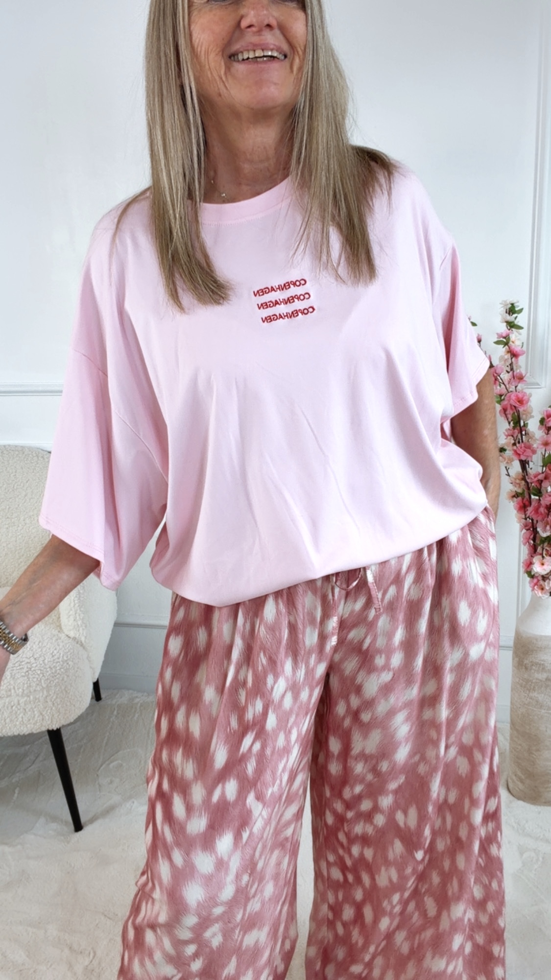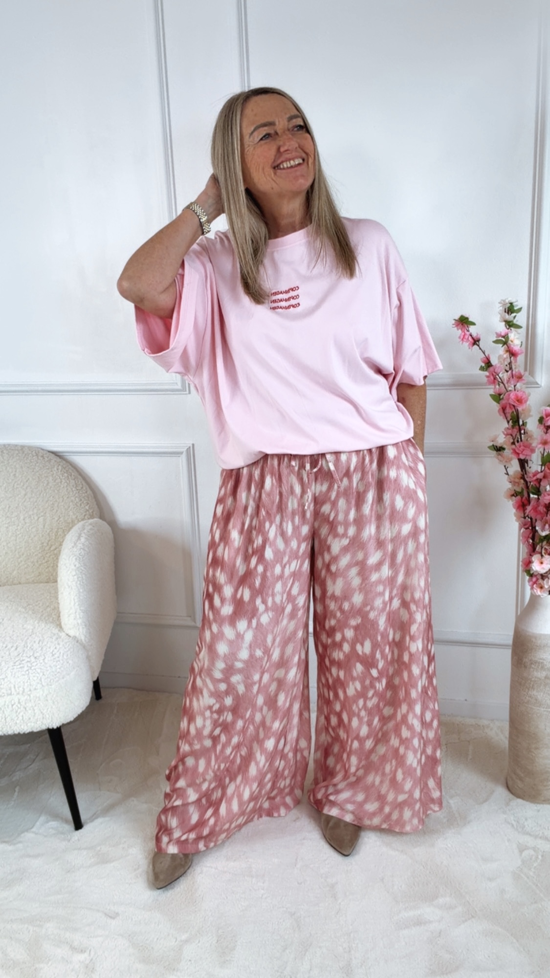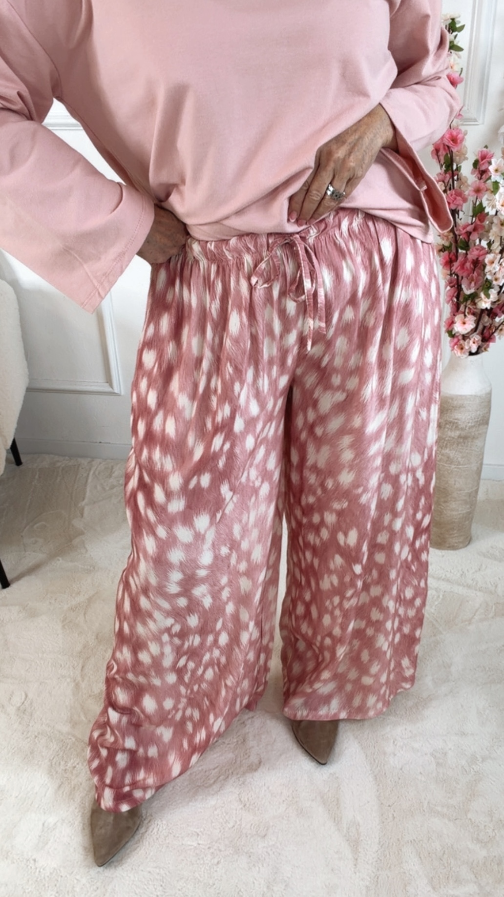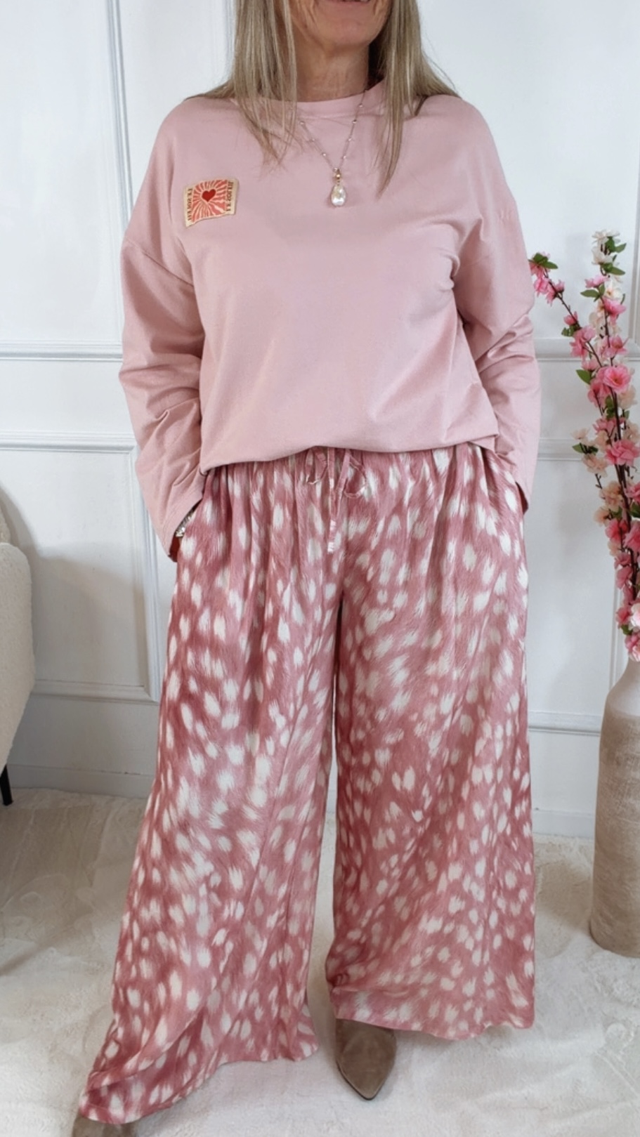 Die weite Hose vereint luftige Leichtigkeit mit stilvoller Eleganz und wird im Handumdrehen zum Lieblingsstück moderner Mädchen- und Damenlooks. Das zarte Federnmuster verleiht ihr eine verspielte, fast schwebende Ausstrahlung, während der passende Gürtel die Taille sanft betont und eine feminine Silhouette formt.