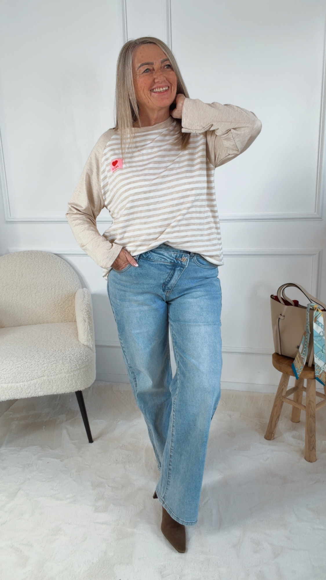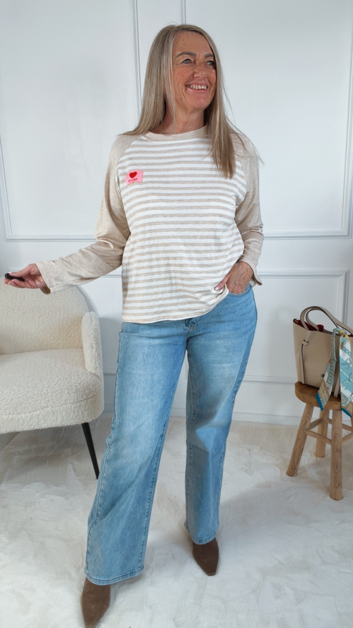 Dieses trendige Langarmshirt begeistert mit einem zeitlosen Streifen-Design und einem stilvollen „AMour“-Patch als besonderem Blickfang. Die klassische Streifenoptik verleiht dem Shirt einen modernen, maritimen Charakter, während der dekorative Patch auf Brusthöhe für eine feminine und modische Note sorgt.