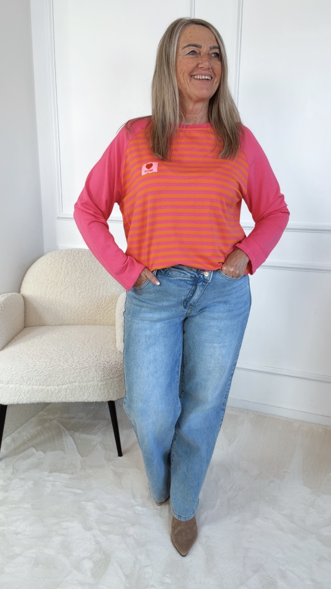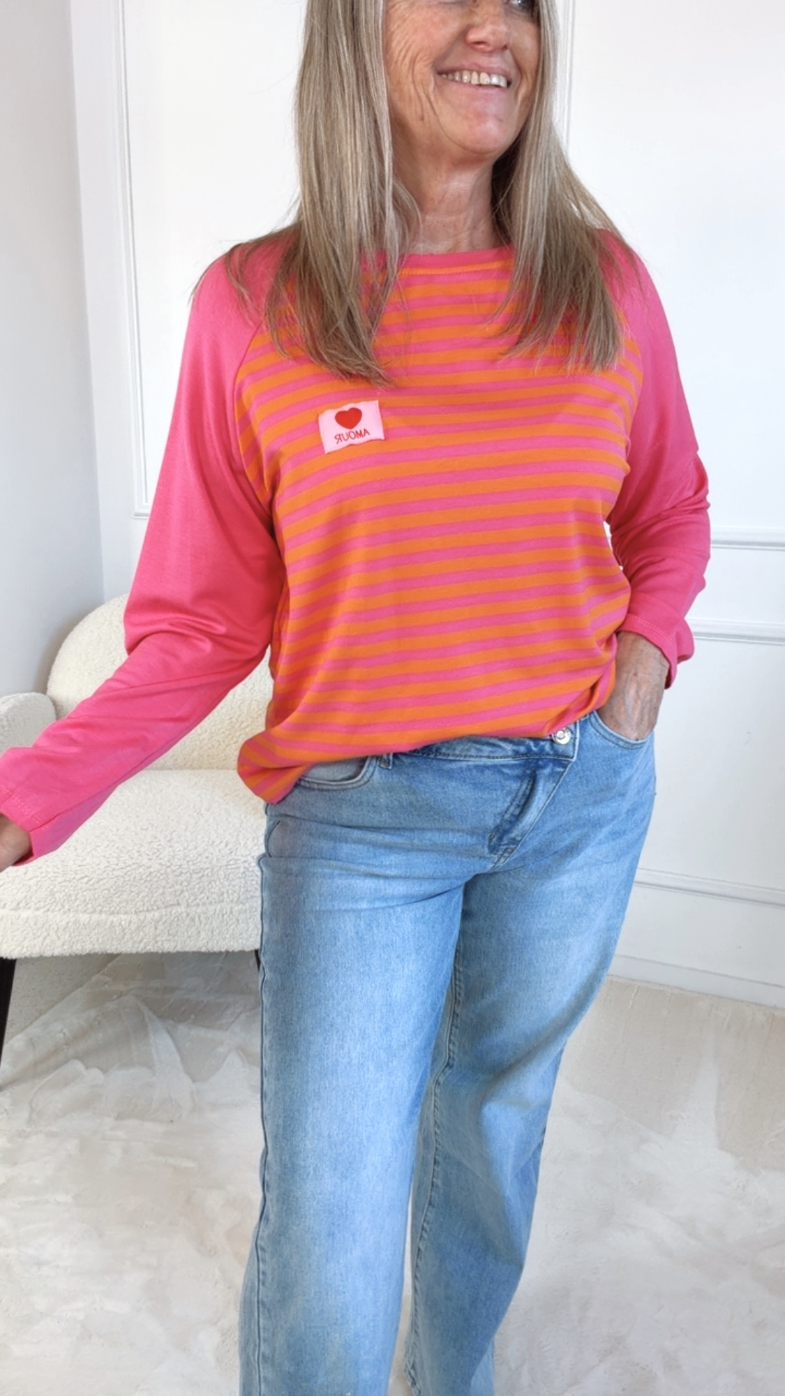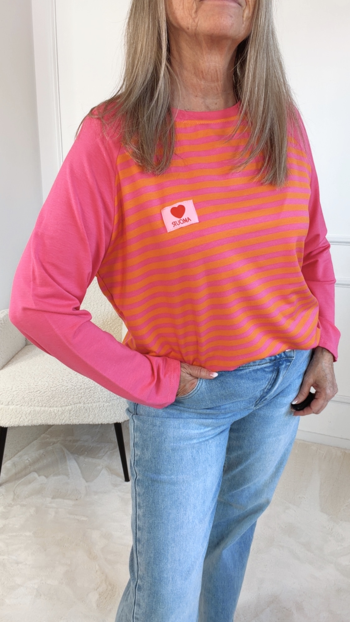 Dieses trendige Langarmshirt begeistert mit einem zeitlosen Streifen-Design und einem stilvollen „AMour“-Patch als besonderem Blickfang. Die klassische Streifenoptik verleiht dem Shirt einen modernen, maritimen Charakter, während der dekorative Patch auf Brusthöhe für eine feminine und modische Note sorgt.