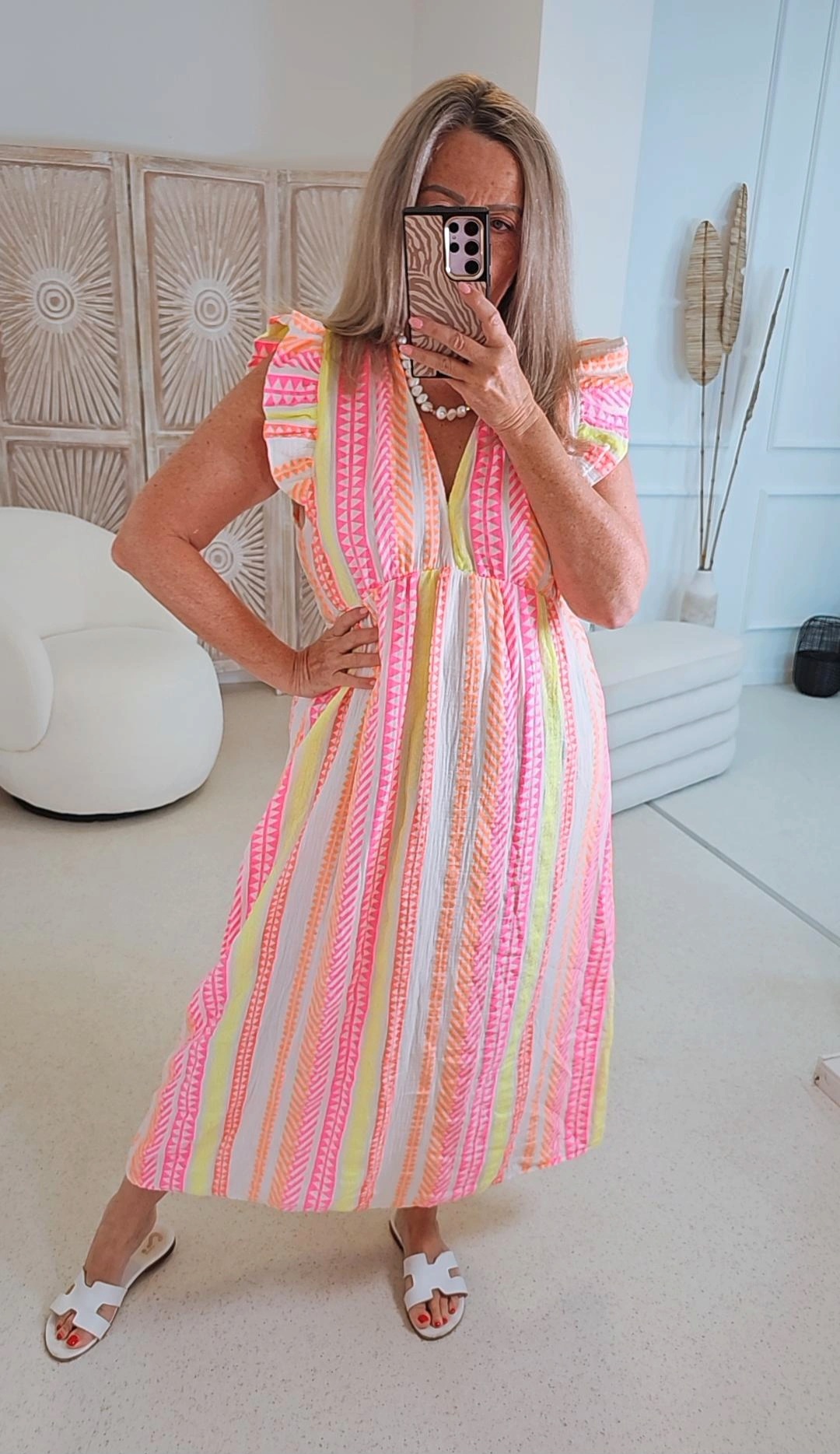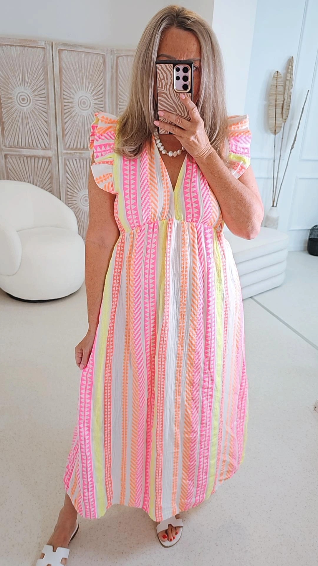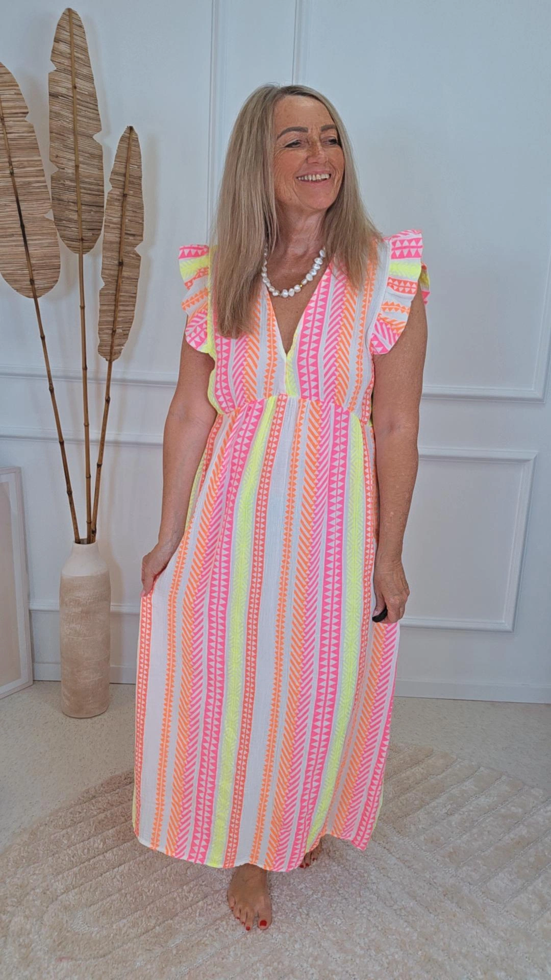 CREME-NEONPINK-NEONORANGE-NEONGELB MUSSELIN AZTEK KLEID ZOE