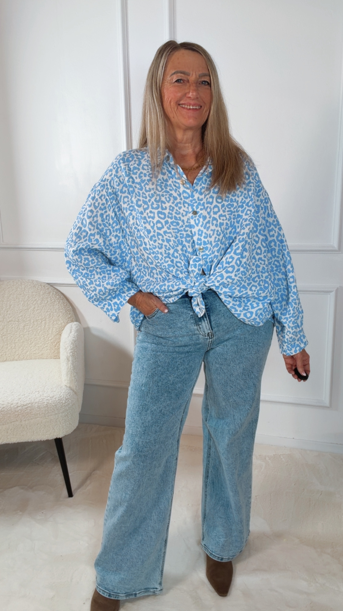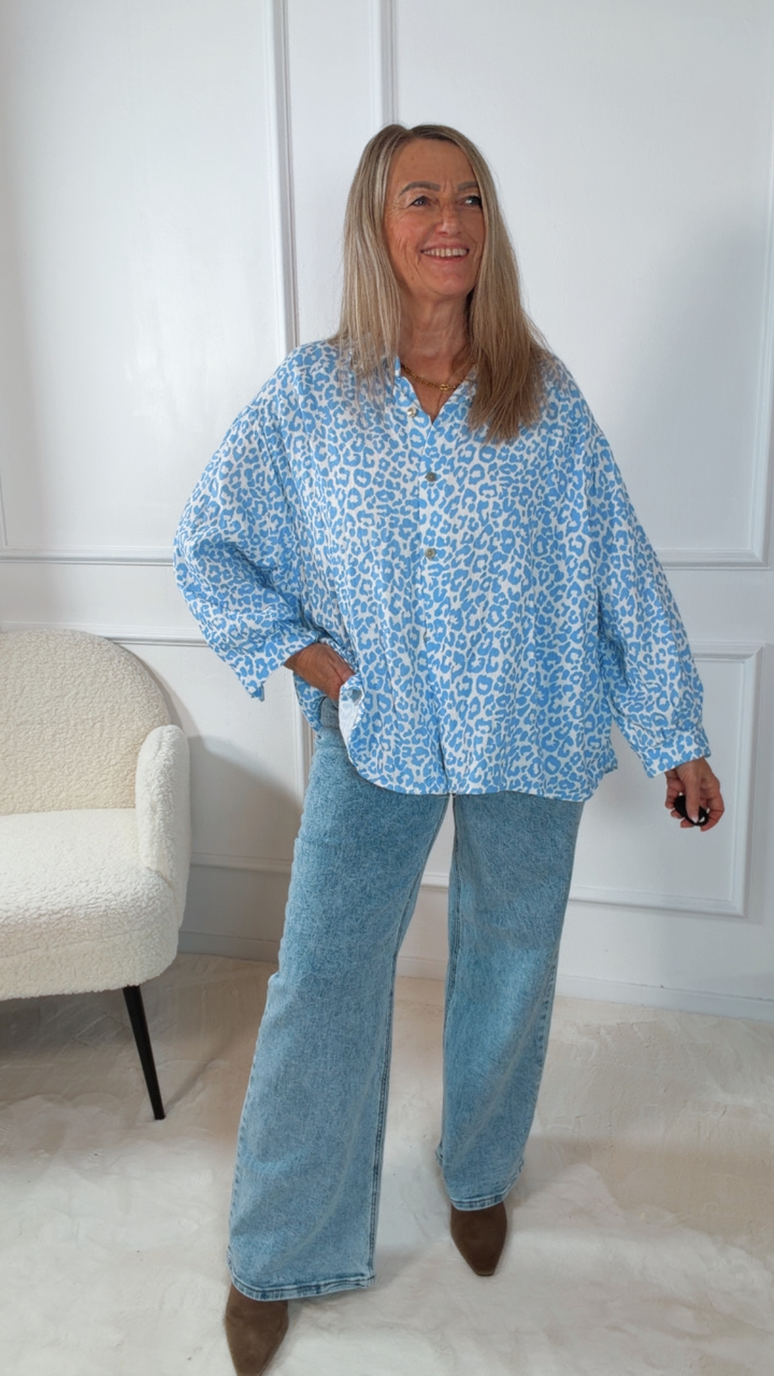 Der lockere Schnitt mit einer Brustweite von ca. 80 cm und einer Länge von ca. 65 cm schmeichelt der Figur und passt bequem bis Größe 44/46. Das moderne Leo-Design macht die Bluse zum echten Hingucker und lässt sich vielseitig kombinieren – ob lässig zur Jeans oder feminin zum Rock.