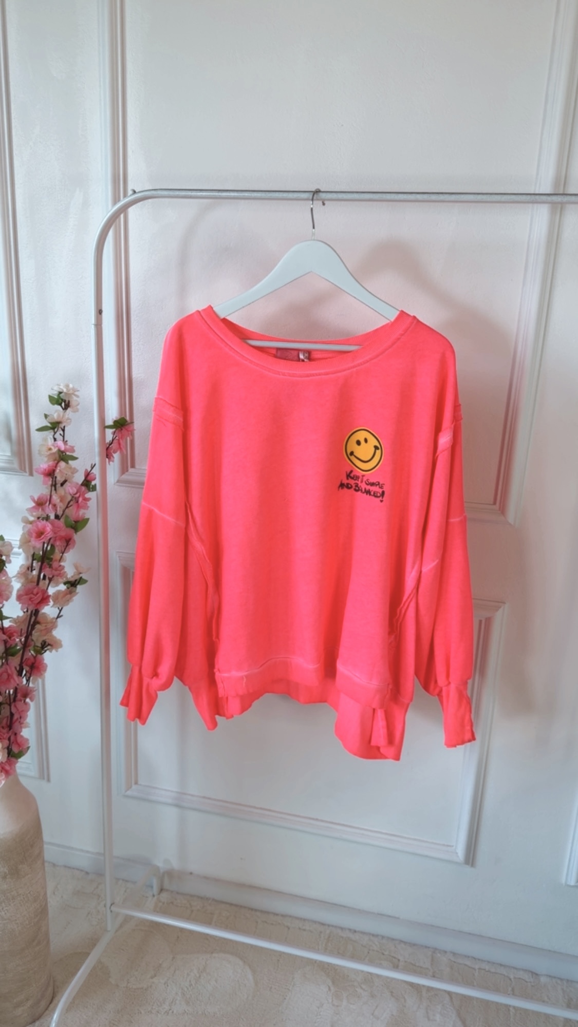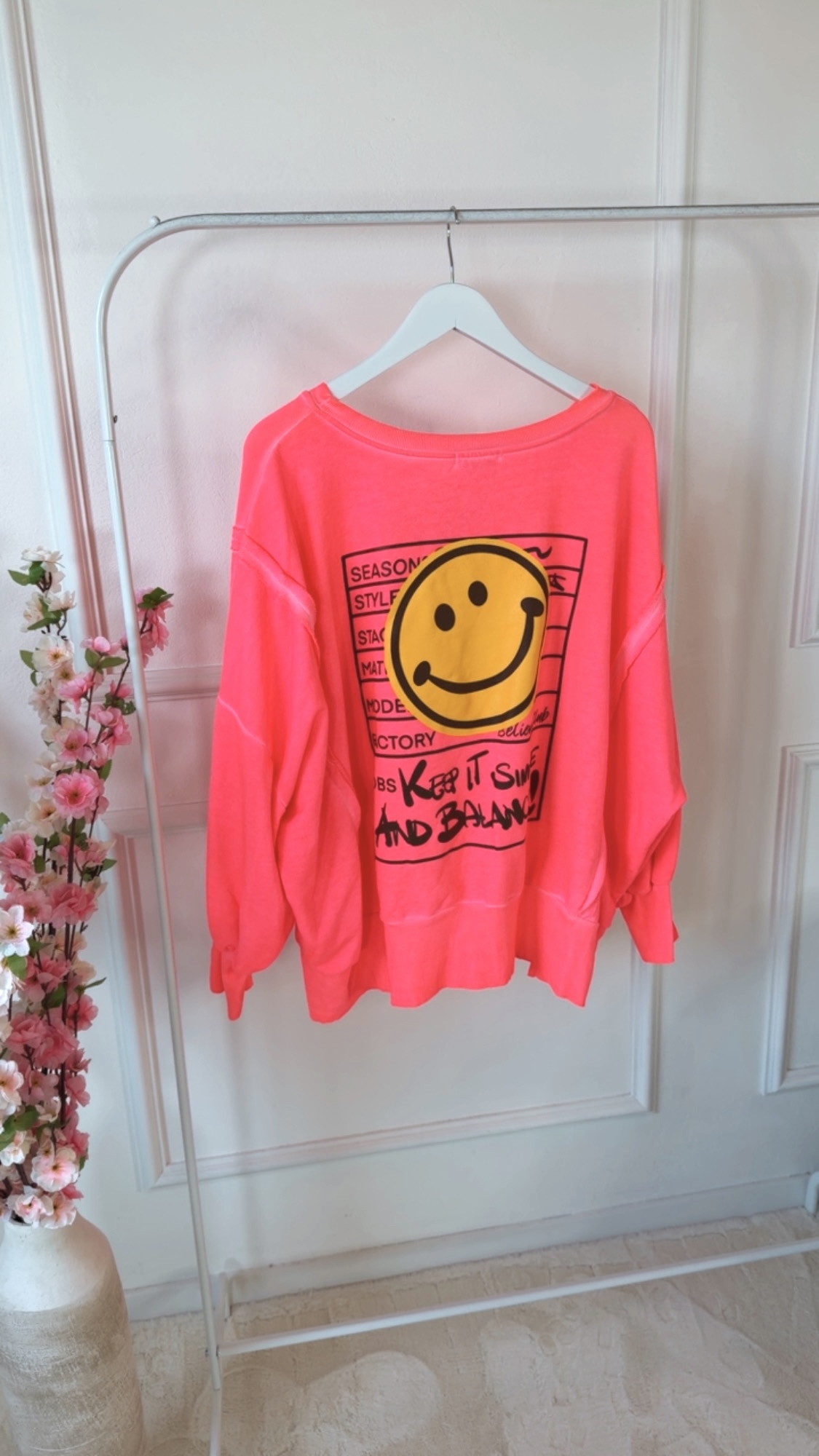 Dieser Sweater vereint Komfort und positive Vibes. Die lässigen Schlitze an den Ärmeln sorgen für einen modernen Twist und machen den Look besonders entspannt. Der dezente Smile-Aufdruck setzt ein freundliches Statement und erinnert daran, das Leben leicht zu nehmen. Abgerundet wird das Design durch den Schriftzug „keep it smile and balanced“ – eine Botschaft für gute Laune, innere Balance und einen selbstbewussten Style. Perfekt für alle, die Mode mit Gefühl und positiver Ausstrahlung lieben.