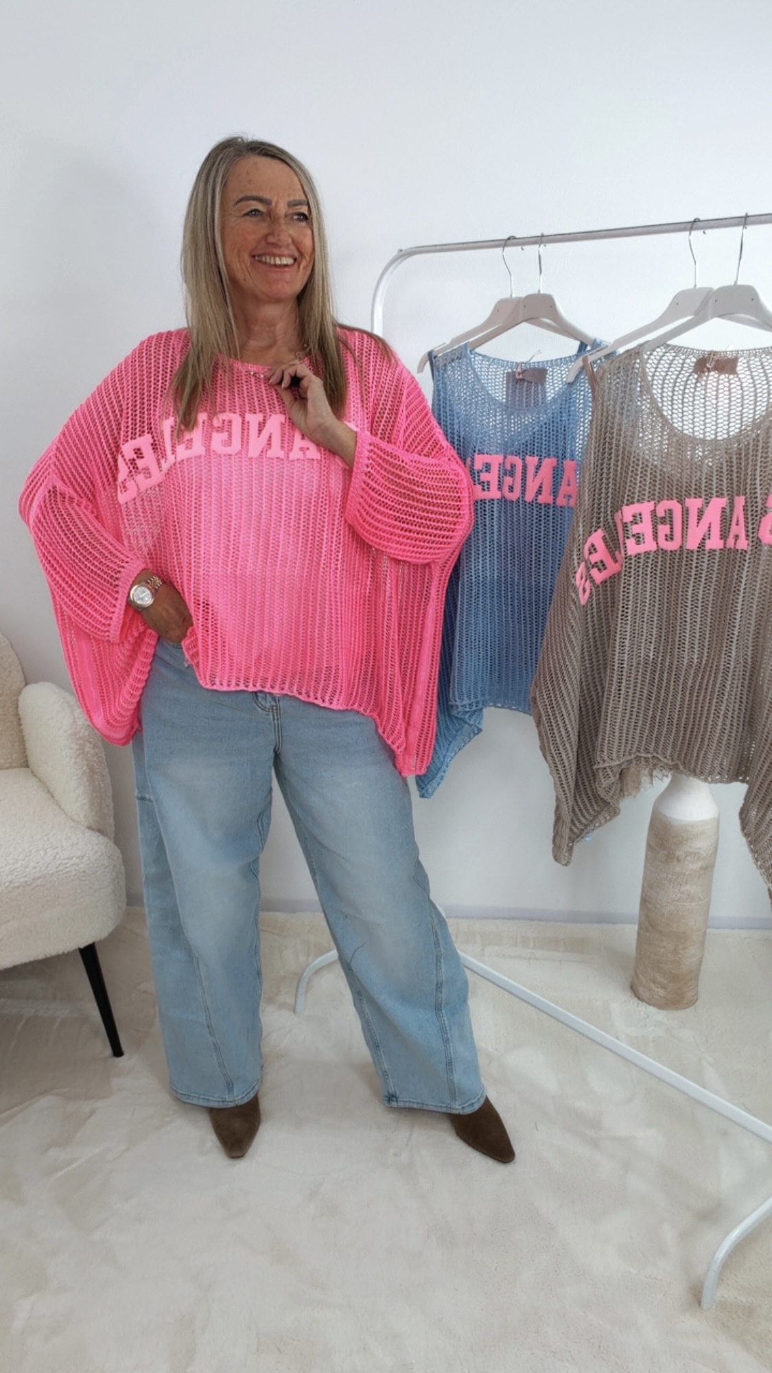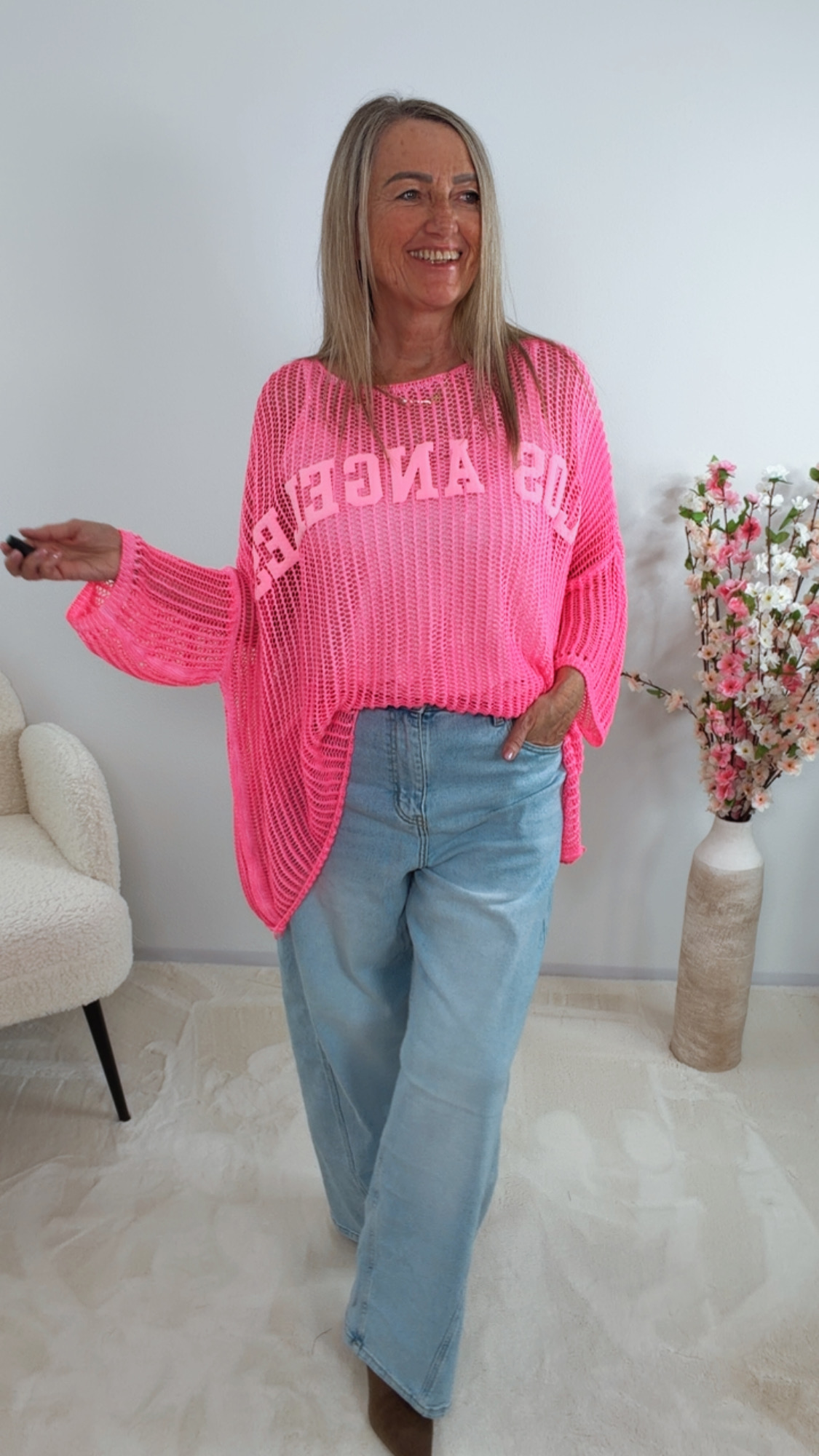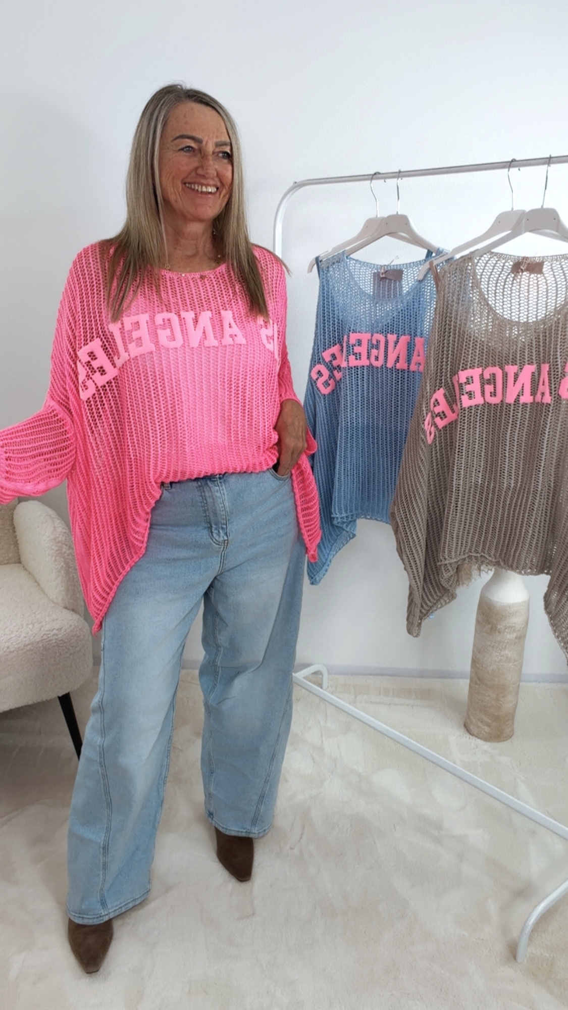 Der stylische Pullover „Zirellia“ überzeugt mit seinem coolen „Los Angeles“-Schriftzug 💖🌴 und dem luftigen Strickdesign 😍✨