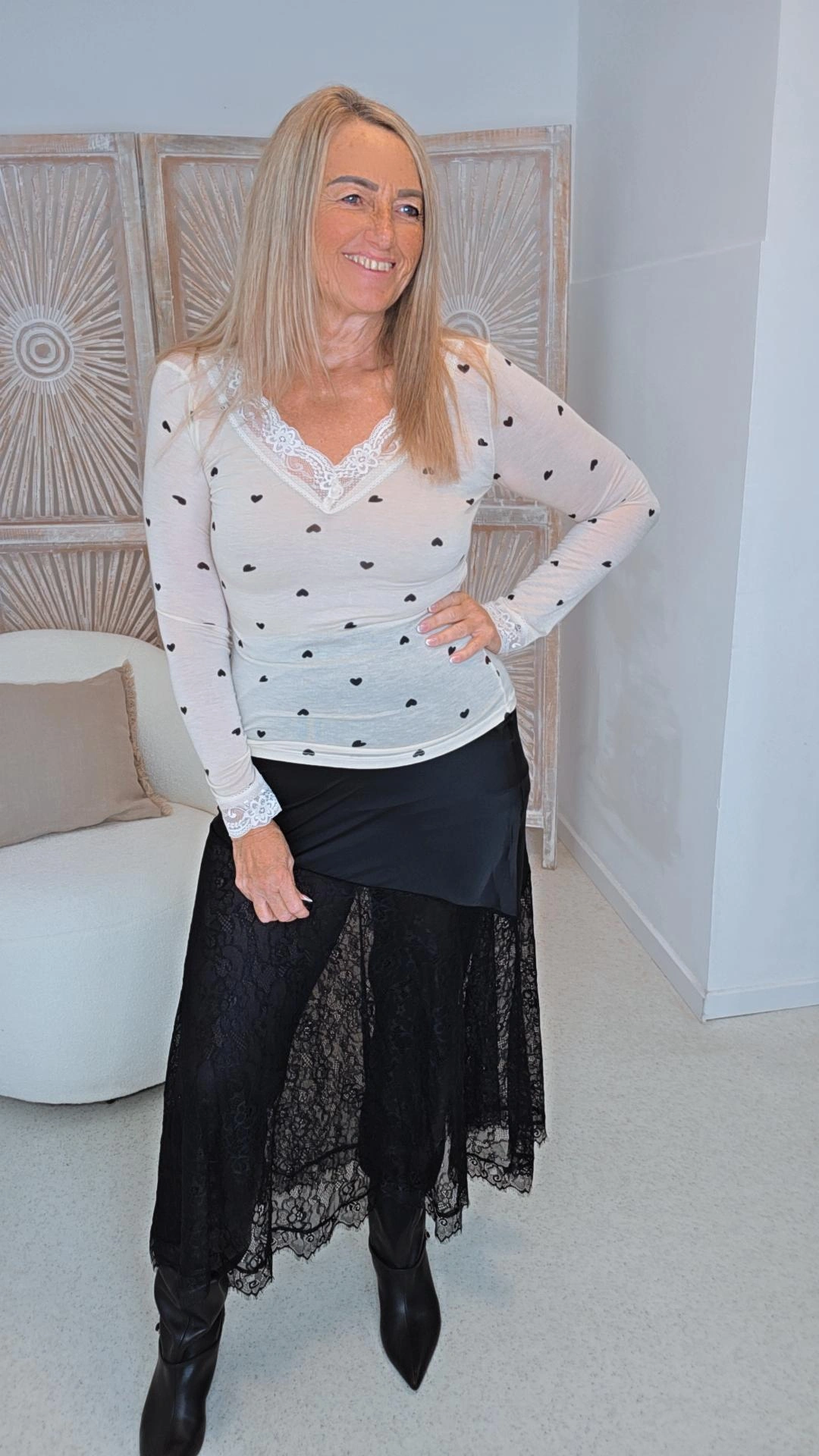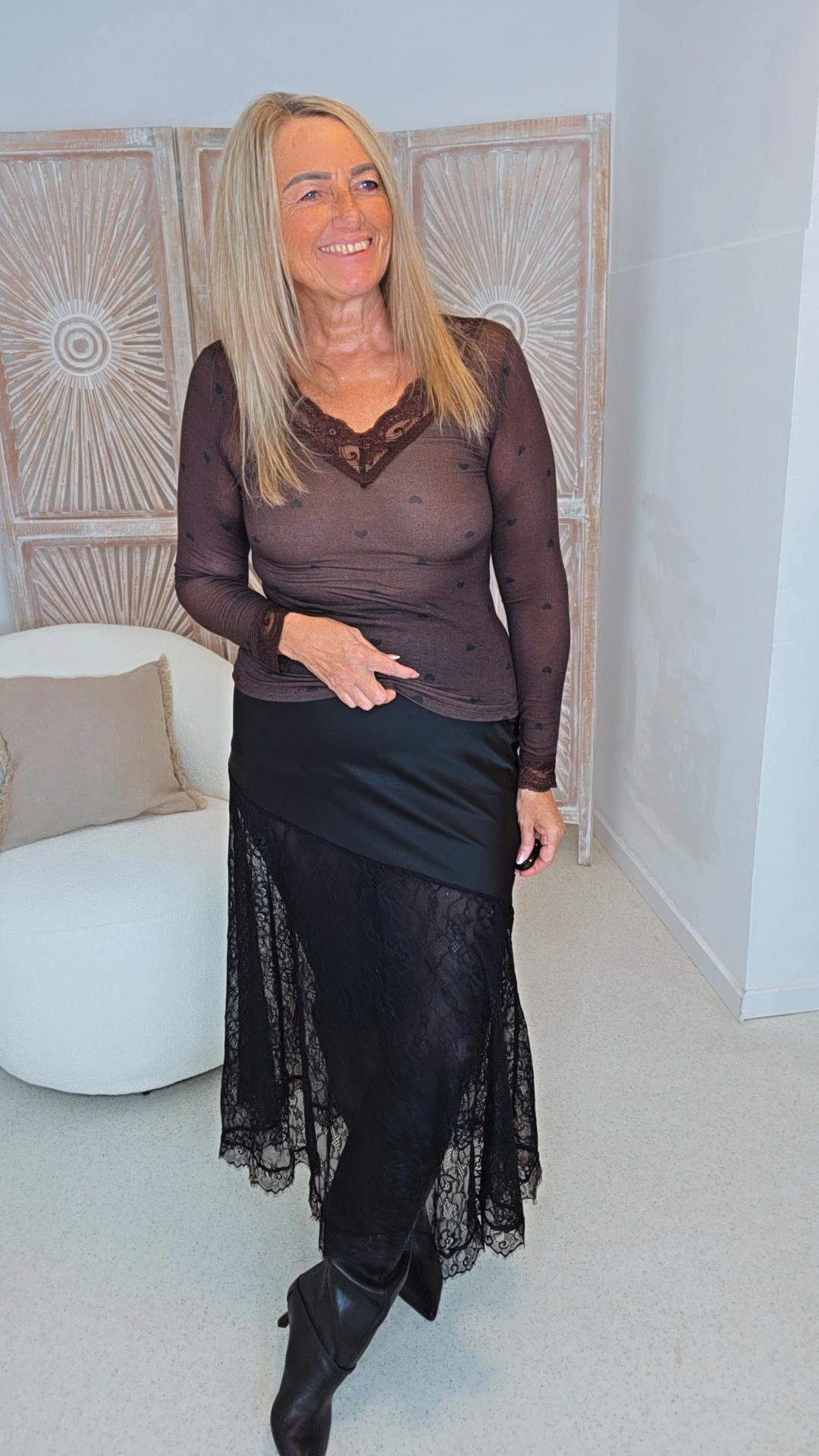 Das schräge Design des oberen Silky-Stoffes verleiht dem Rock eine moderne, dynamische Form, während die feine Spitze einen Hauch von Romantik und Eleganz hinzufügt. Ob mit Sneakern für den Alltag oder mit Boots – dieser Rock lässt sich vielseitig kombinieren und ist ein echtes Highlight in jeder Garderobe.