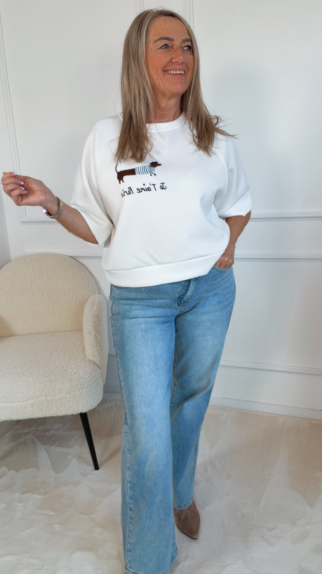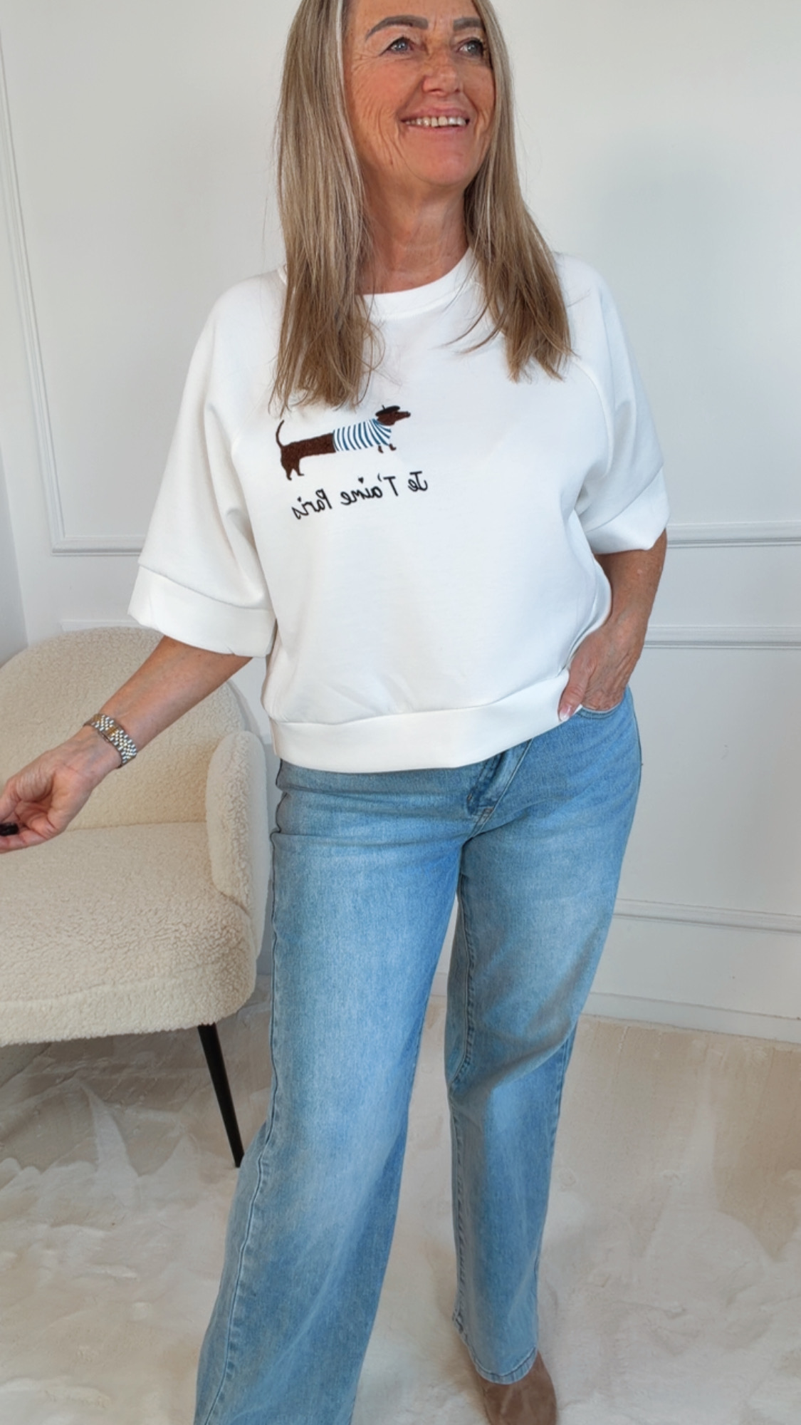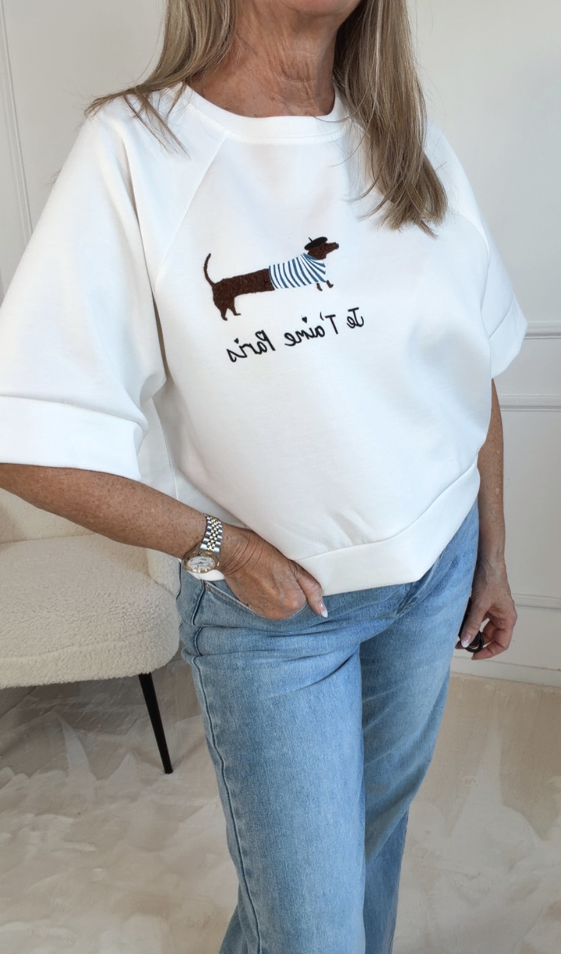 Der niedliche Dackelaufdruck mit dem charmanten Schriftzug „Je t’aime Paris“ verleiht dem Shirt eine verspielte, französische Note und macht jedes Outfit zu etwas ganz Besonderem. Ob im Kindergarten, auf dem Spielplatz oder beim Familienausflug – „Amélie“ bringt Stil und Freude in den Alltag.