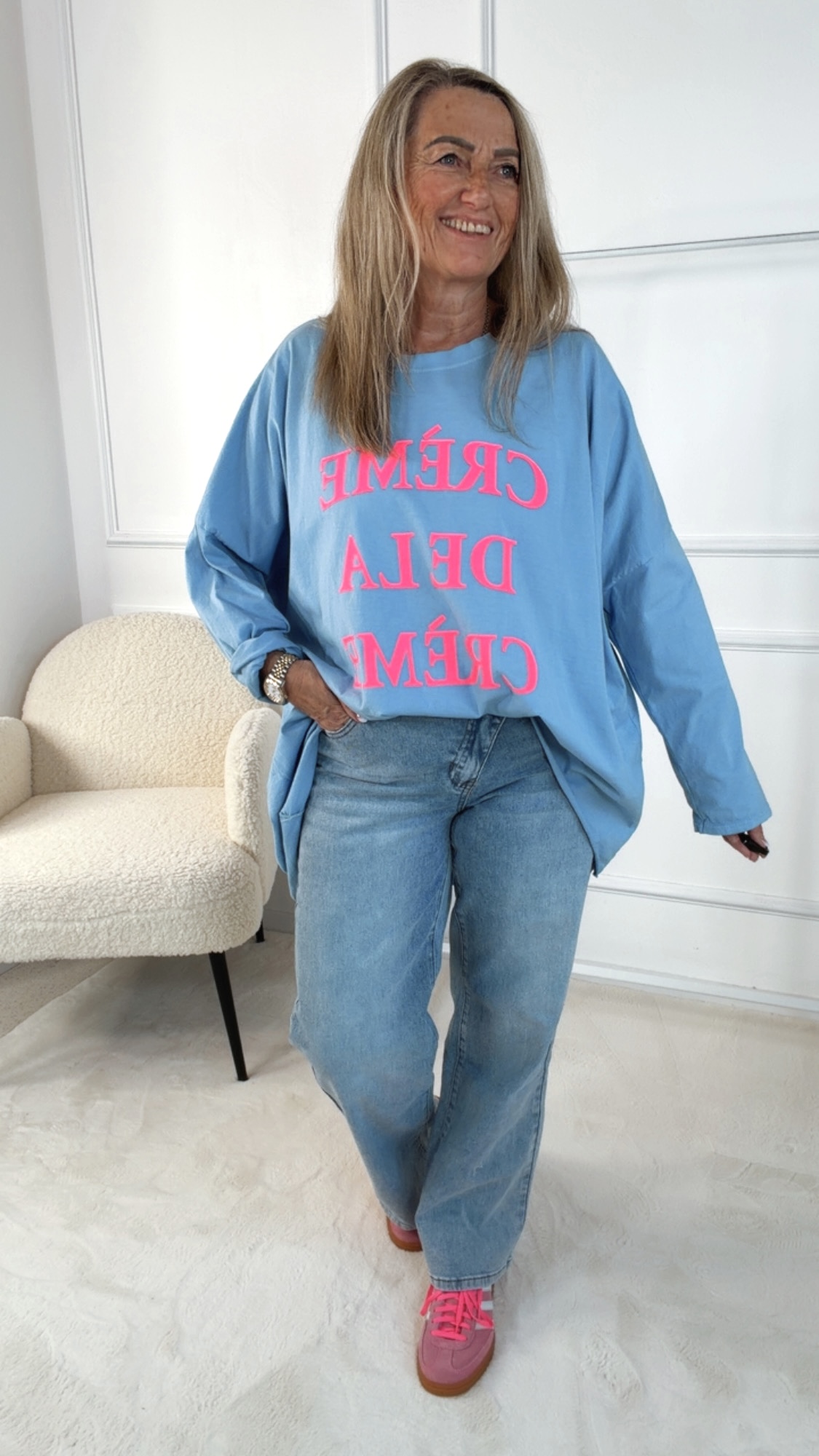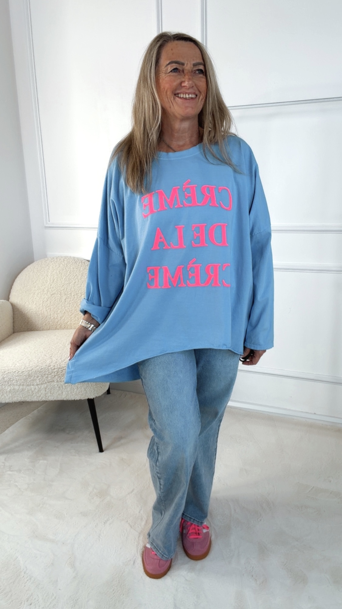 • Dieses Long Shirt im angesagten Vokuhila-Schnitt überzeugt mit einem lässigen und zugleich stylischen Look. Der Rundhalsausschnitt sorgt für eine klassische Silhouette, während die langen Ärmel zum Hochkrempeln vielseitige Styling-Möglichkeiten bieten. Auf der Vorderseite setzt der Schriftzug „Crème de la Crème“ ein modisches Statement und verleiht dem Shirt eine besondere Note. Locker geschnitten und angenehm zu tragen, ist dieses Long Shirt der perfekte Begleiter für entspannte, trendbewusste Alltagsoutfits.