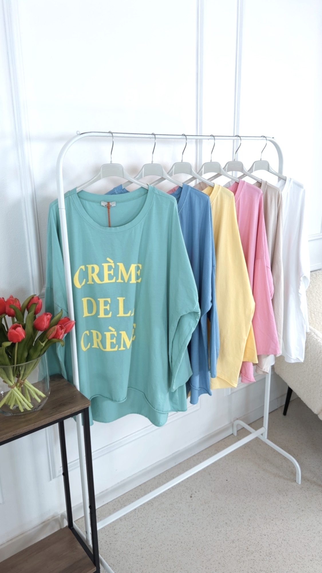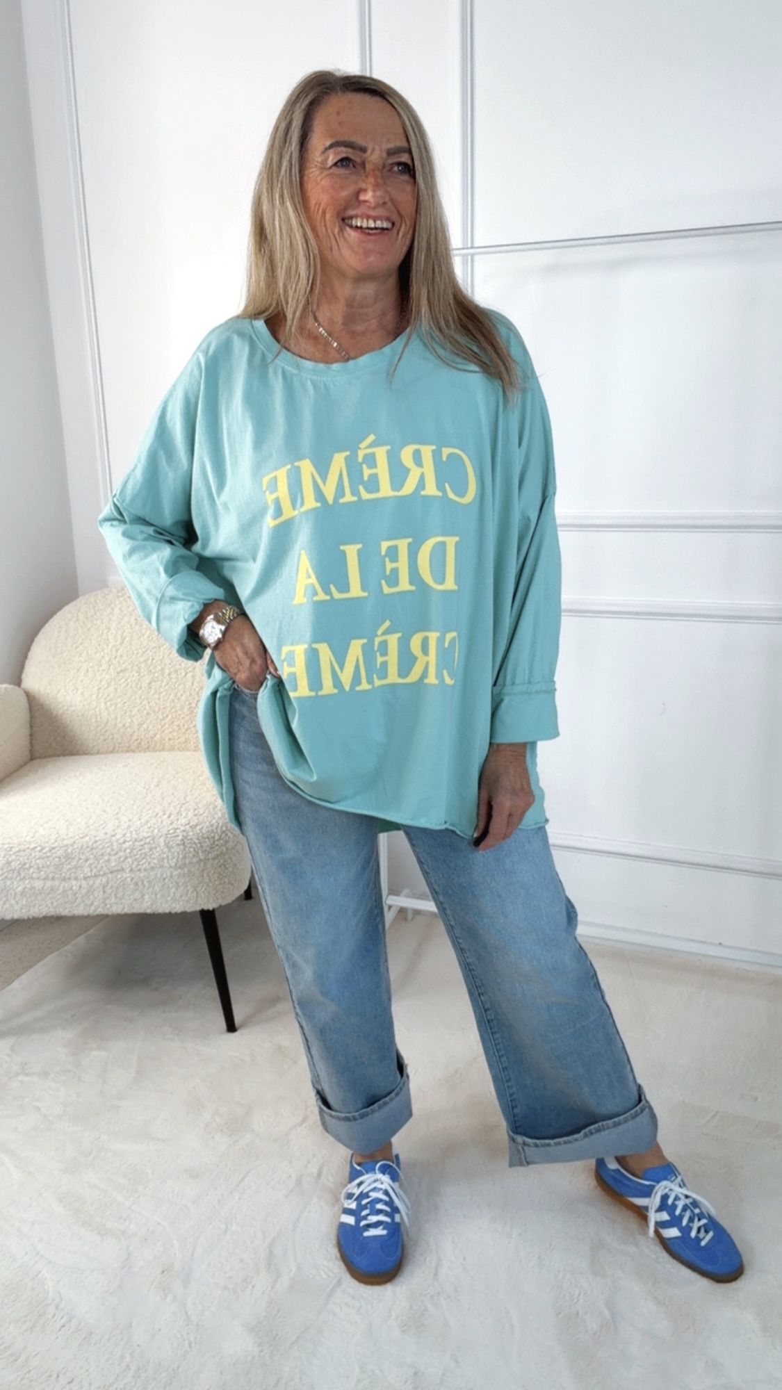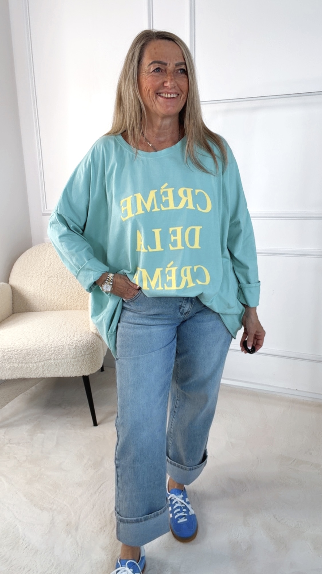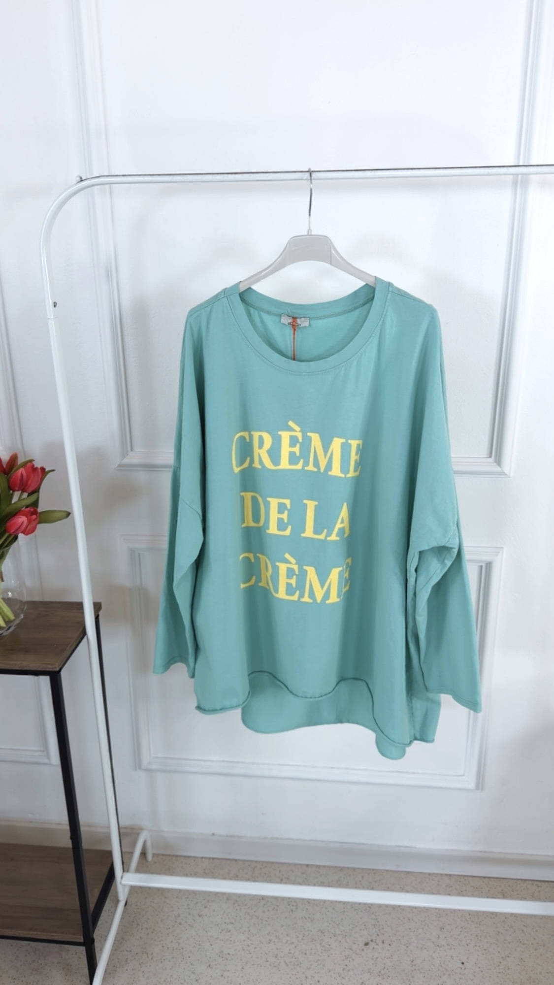 Dieses Long Shirt im angesagten Vokuhila-Schnitt überzeugt mit einem lässigen und zugleich stylischen Look. Der Rundhalsausschnitt sorgt für eine klassische Silhouette, während die langen Ärmel zum Hochkrempeln vielseitige Styling-Möglichkeiten bieten. Auf der Vorderseite setzt der Schriftzug „Crème de la Crème“ ein modisches Statement und verleiht dem Shirt eine besondere Note. Locker geschnitten und angenehm zu tragen, ist dieses Long Shirt der perfekte Begleiter für entspannte, trendbewusste Alltagsoutfits.