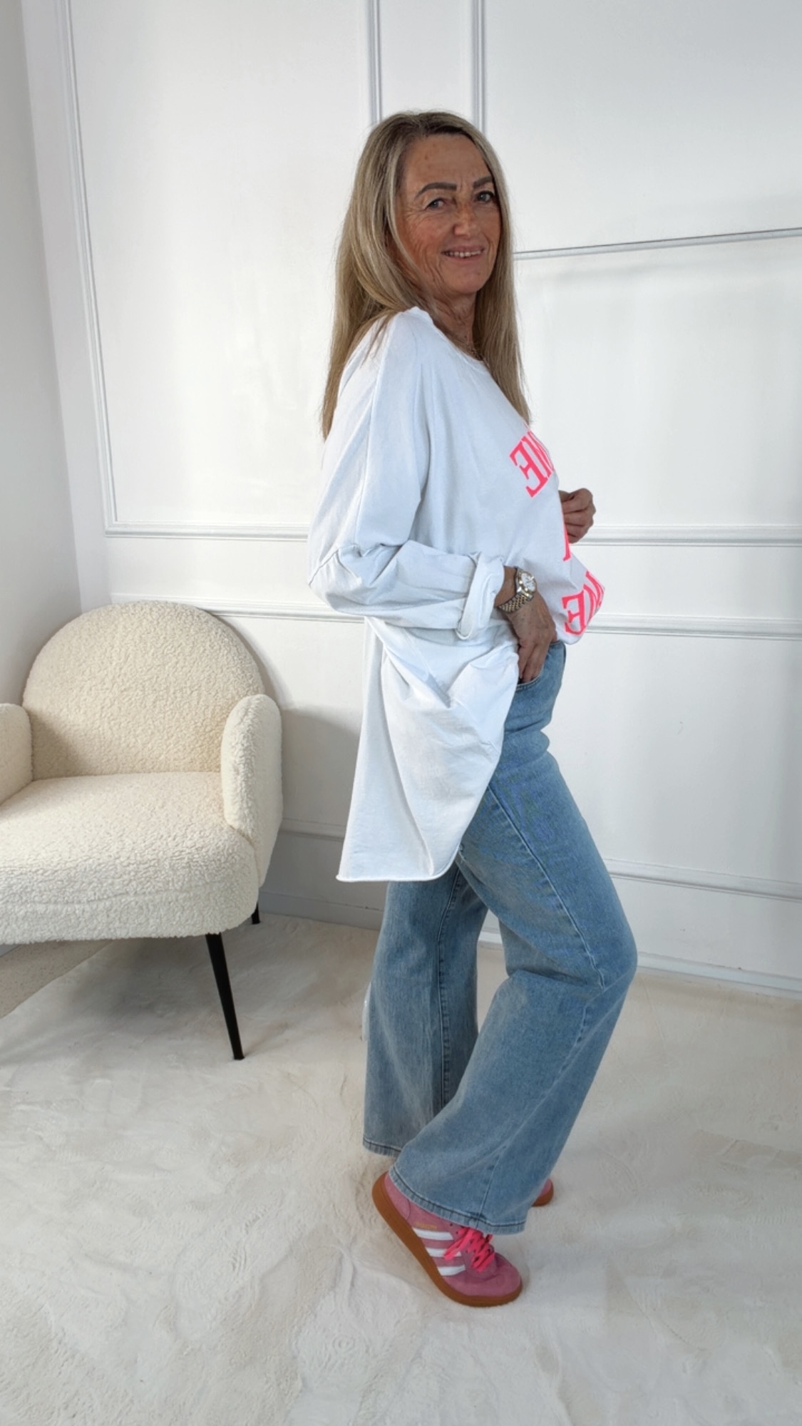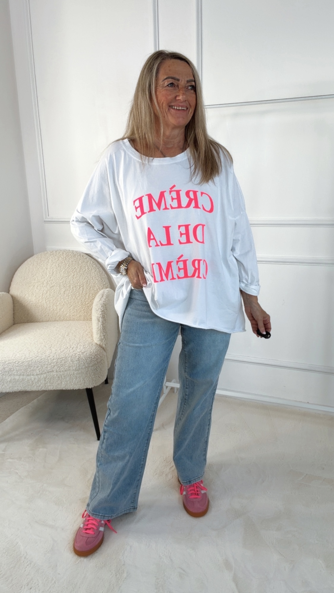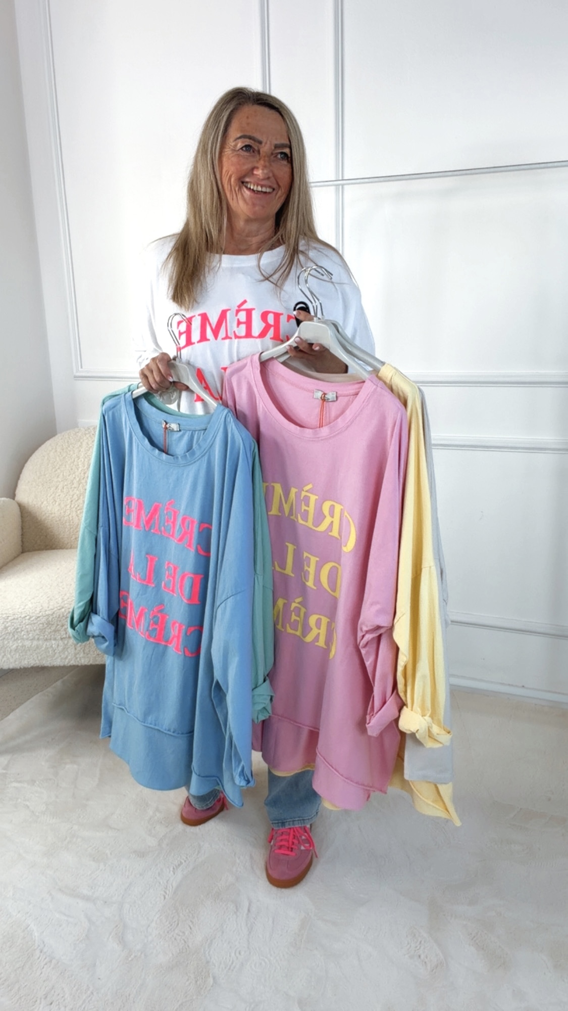 Dieses Long Shirt im angesagten Vokuhila-Schnitt überzeugt mit einem lässigen und zugleich stylischen Look. Der Rundhalsausschnitt sorgt für eine klassische Silhouette, während die langen Ärmel zum Hochkrempeln vielseitige Styling-Möglichkeiten bieten. Auf der Vorderseite setzt der Schriftzug „Crème de la Crème“ ein modisches Statement und verleiht dem Shirt eine besondere Note. Locker geschnitten und angenehm zu tragen, ist dieses Long Shirt der perfekte Begleiter für entspannte, trendbewusste Alltagsoutfits.