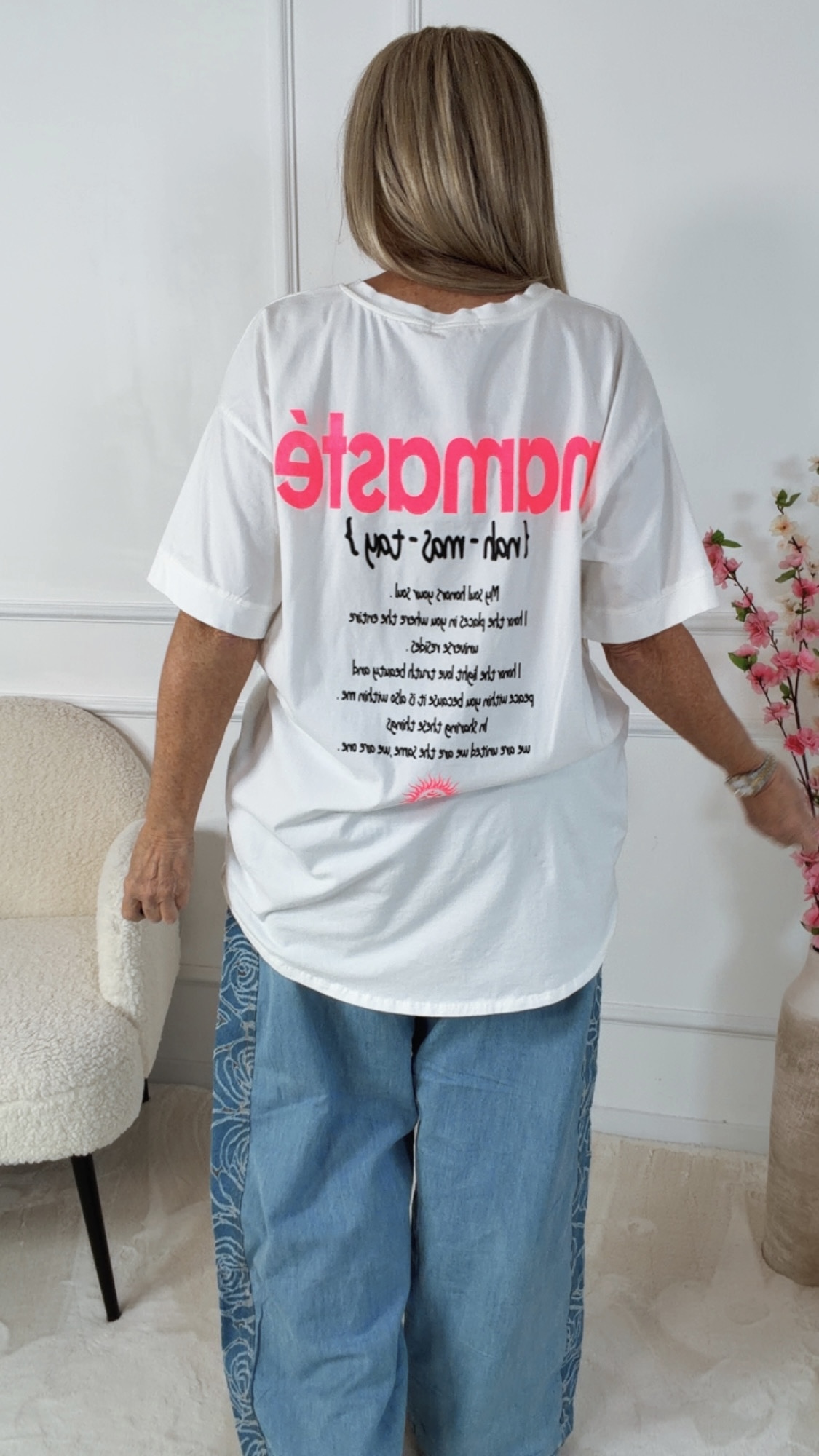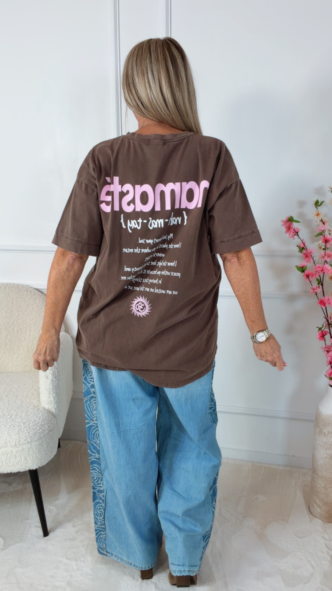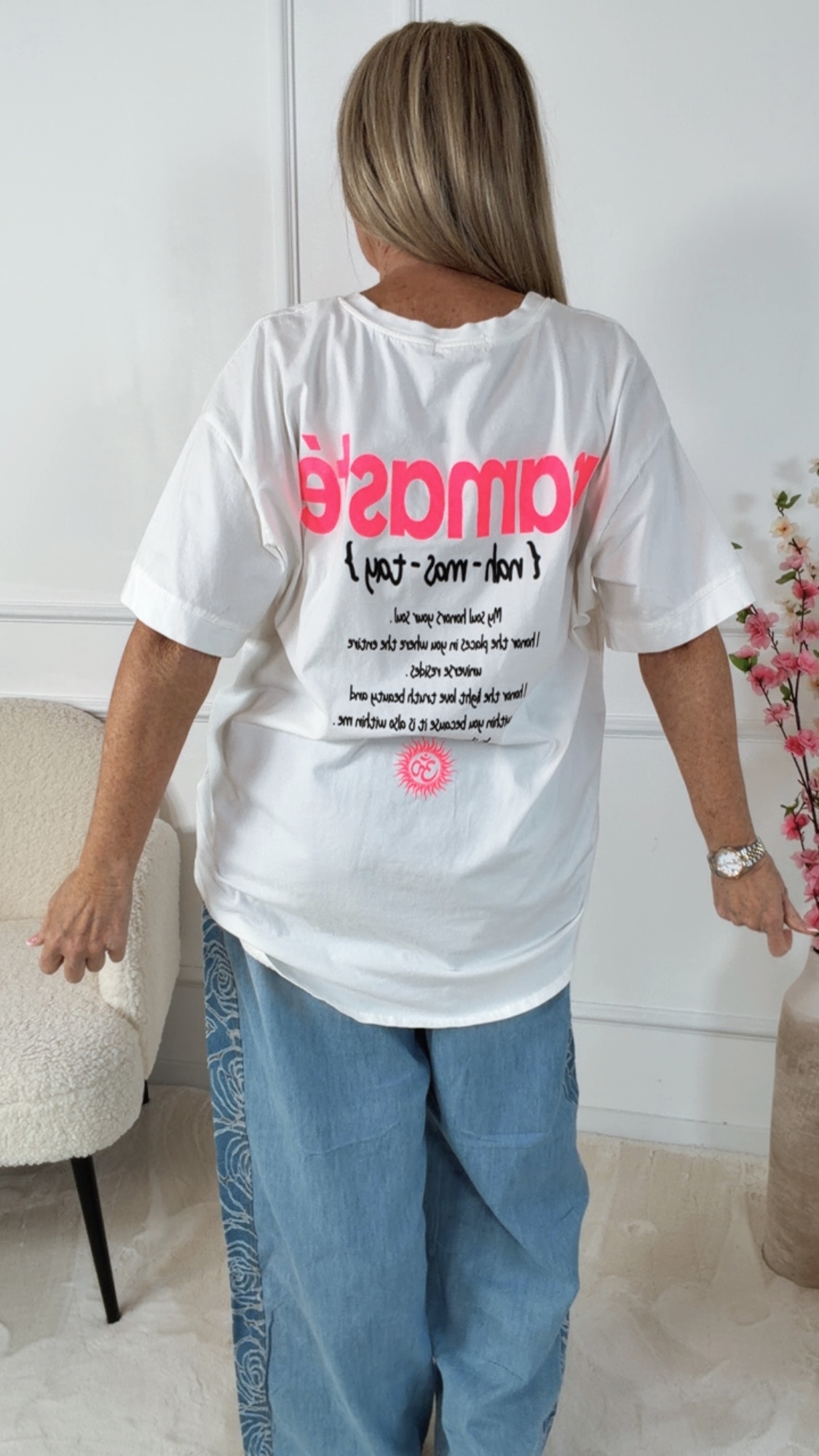 Der Namasté-Print mit Om-Symbol auf der Vorderseite setzt ein stylisches Highlight. Auf der Rückseite befindet sich der große Namasté-Schriftzug mit inspirierendem Text, der dem Shirt eine besondere spirituelle Ausstrahlung verleiht 🧘♀️✨.