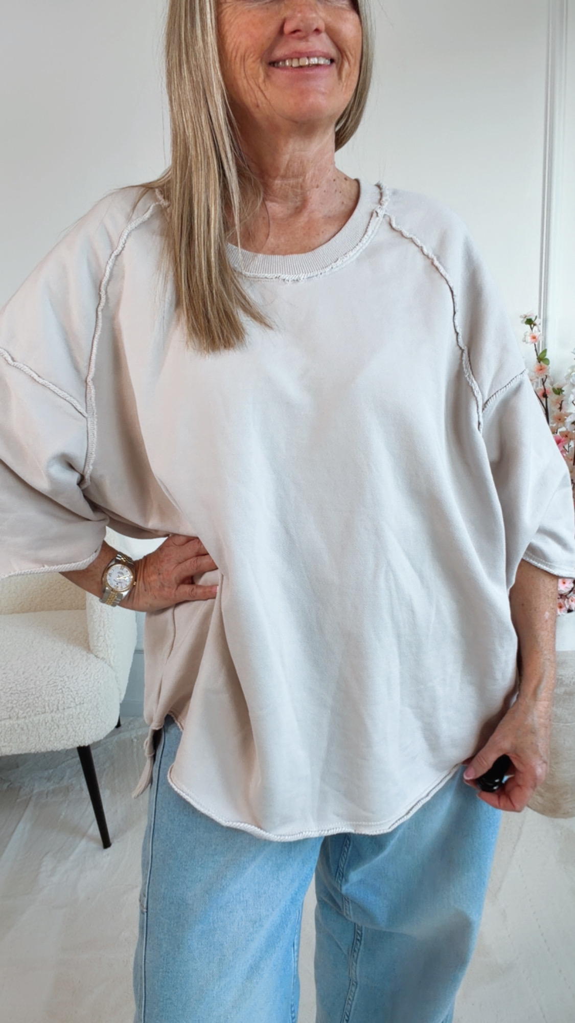 Der stylische „Ottilia Raw-Cut Sweater“ überzeugt mit seinem entspannten Schnitt und den trendigen offenen Raw-Cut-Nähen, die dem Sweatshirt einen modernen, leicht ausgefransten Look verleihen. Die kurzen Ärmel machen das Modell zum perfekten Begleiter für Übergangszeiten und sommerliche Casual-Outfits.