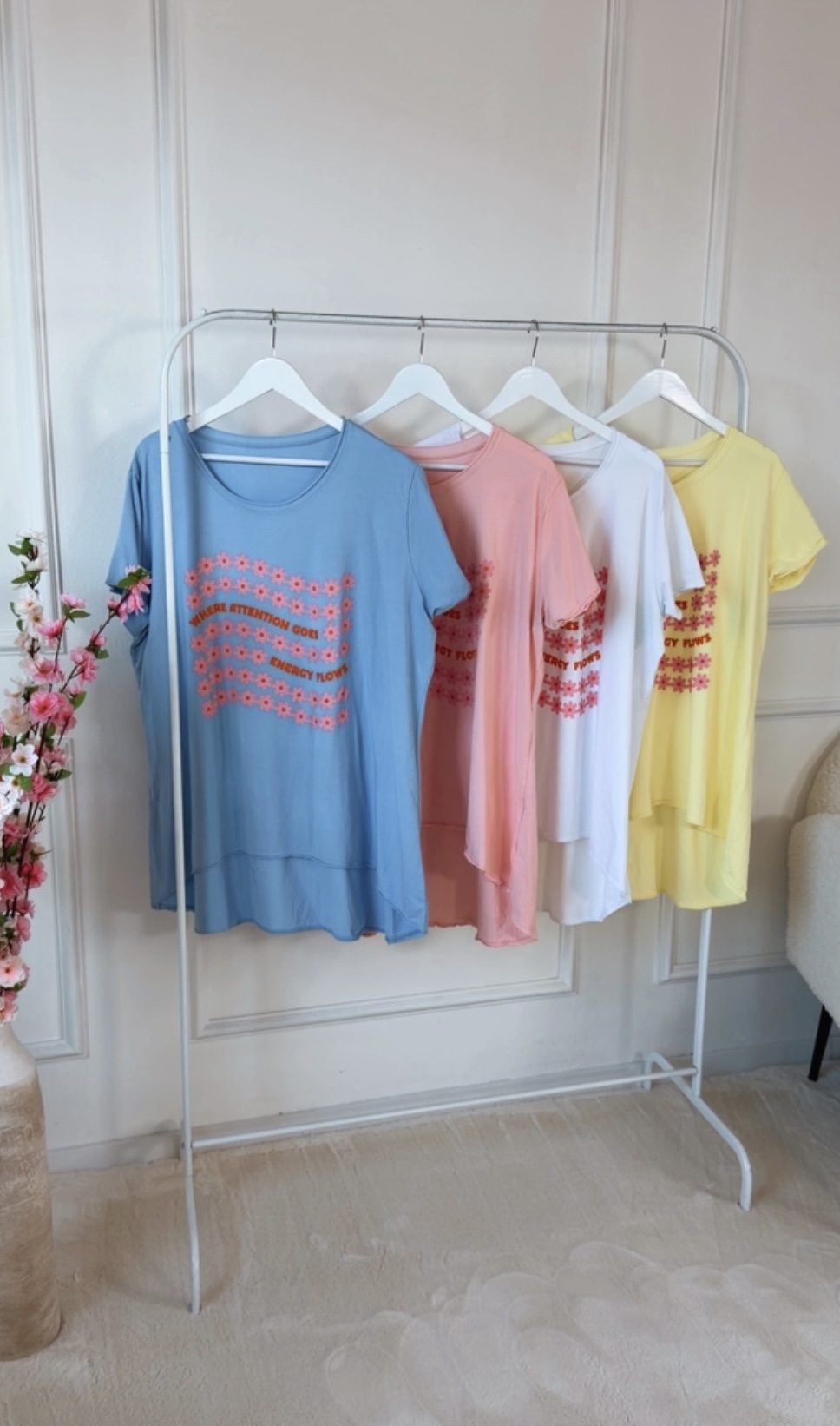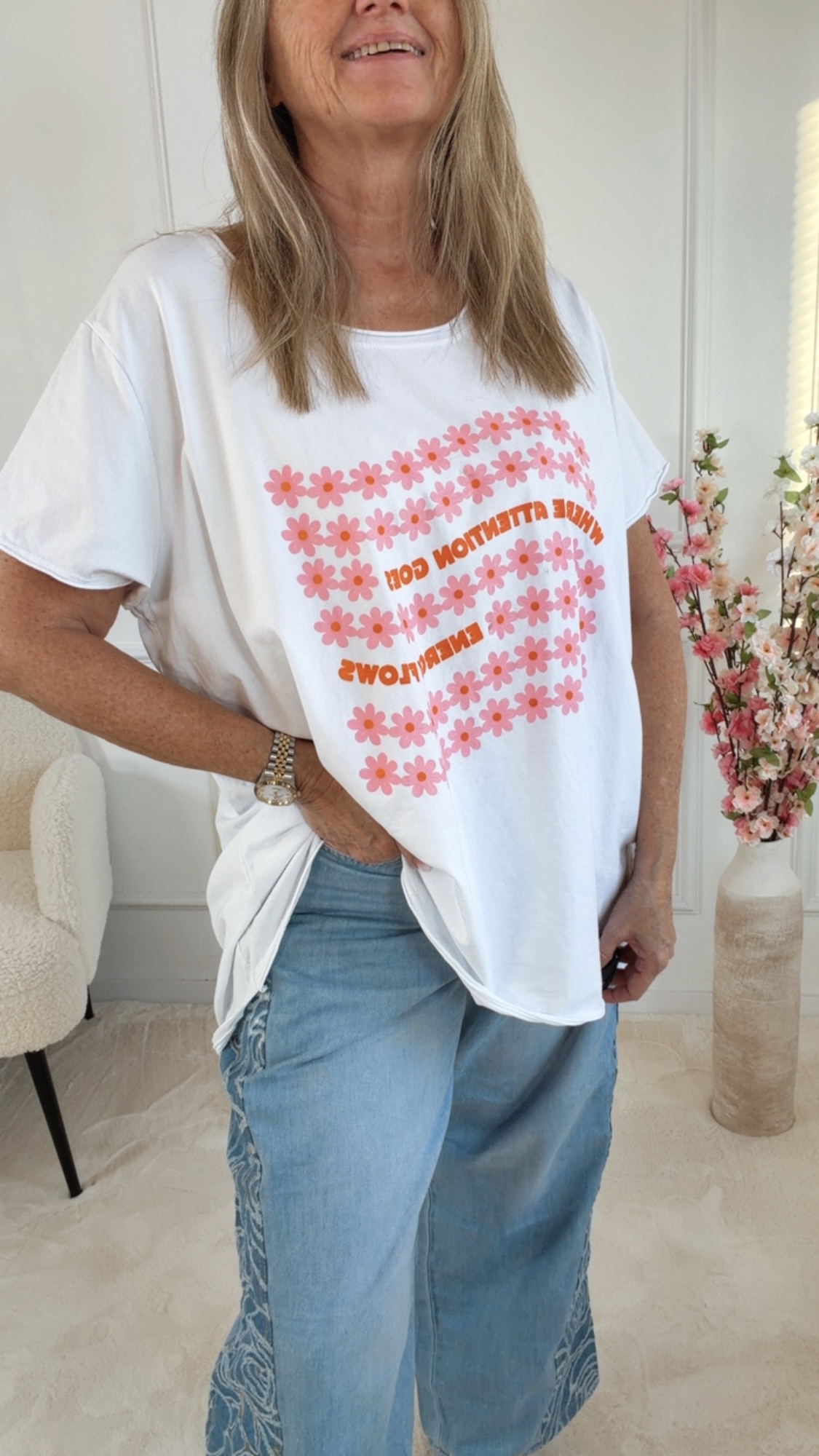 Der wunderschöne Blumenaufdruck auf der Vorderseite verleiht dem Shirt eine fröhliche, feminine Note, während der motivierende Schriftzug „Where attention goes, energy flows“ einen inspirierenden Akzent setzt. Zusammen entsteht ein Look, der gute Laune und positive Energie ausstrahlt.
