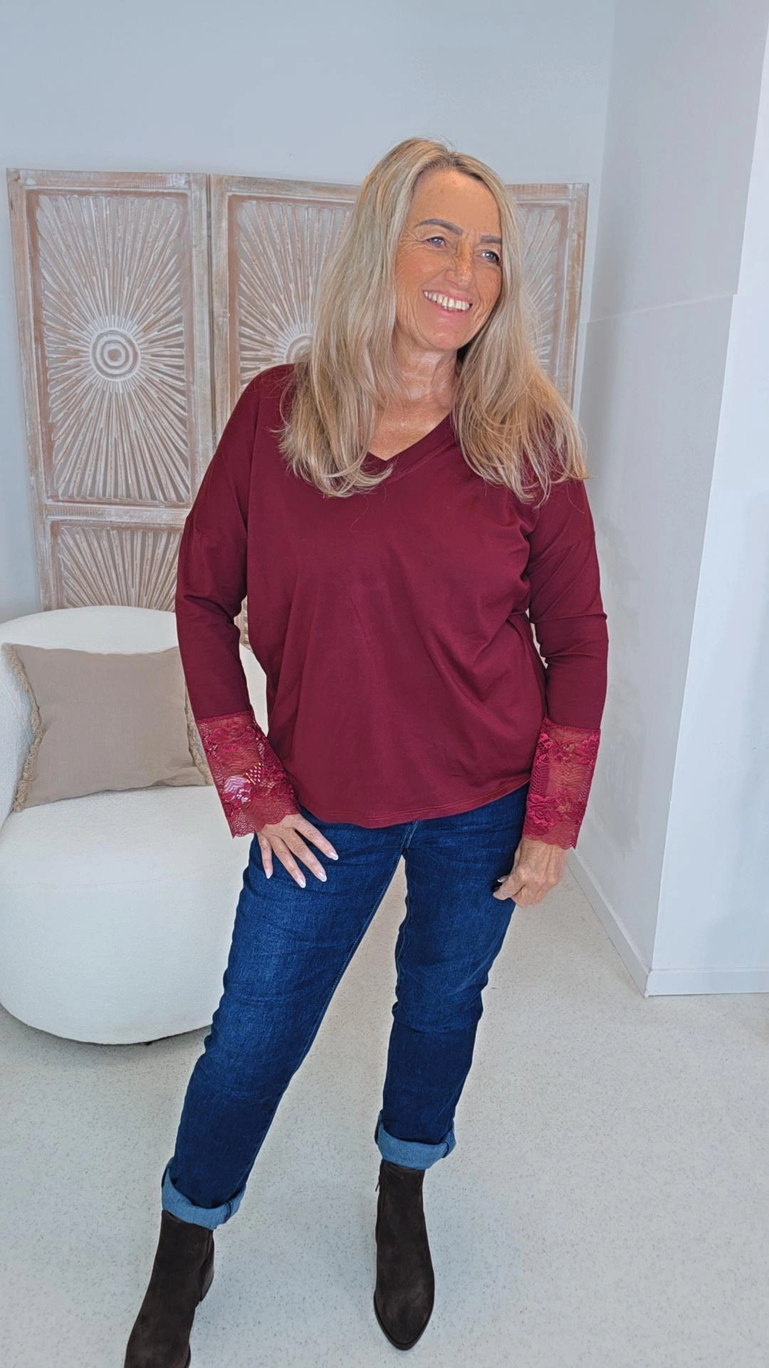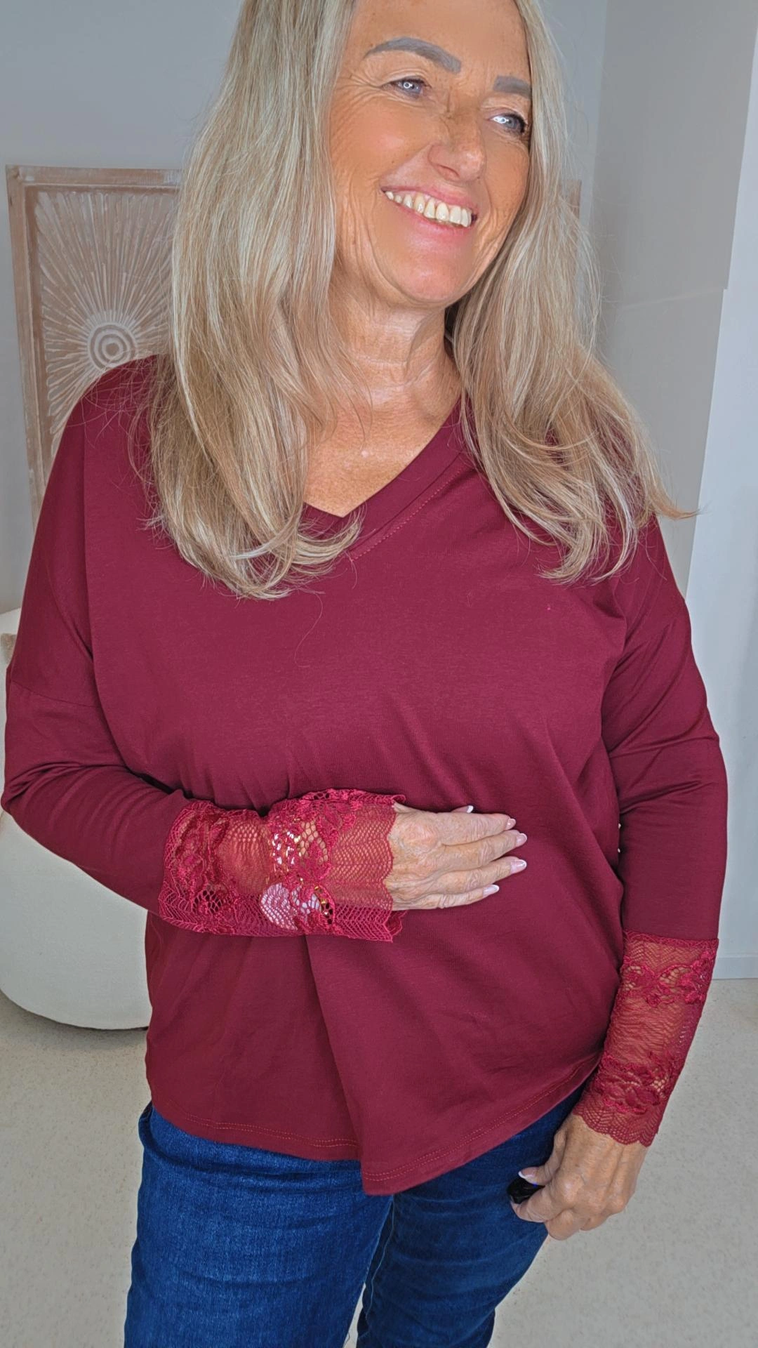 SHIRT RAMONA mit Spitze am Ärmel 34- 42/44 Made in Italy Longsleeve/Langarm mit V-Ausschnitt