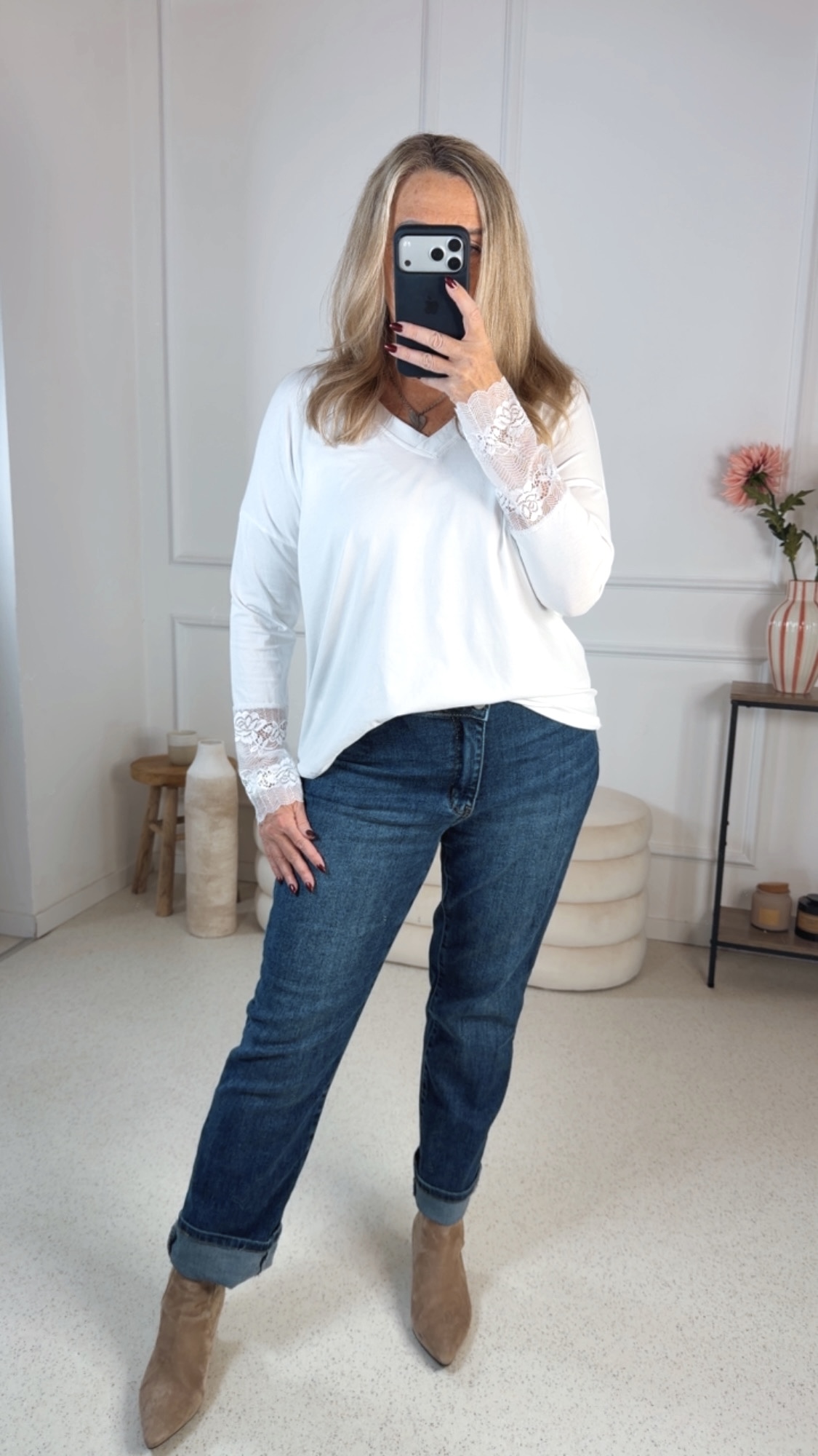 SHIRT RAMONA mit Spitze am Ärmel 34- 42/44 Made in Italy Longsleeve/Langarm mit V-Ausschnitt