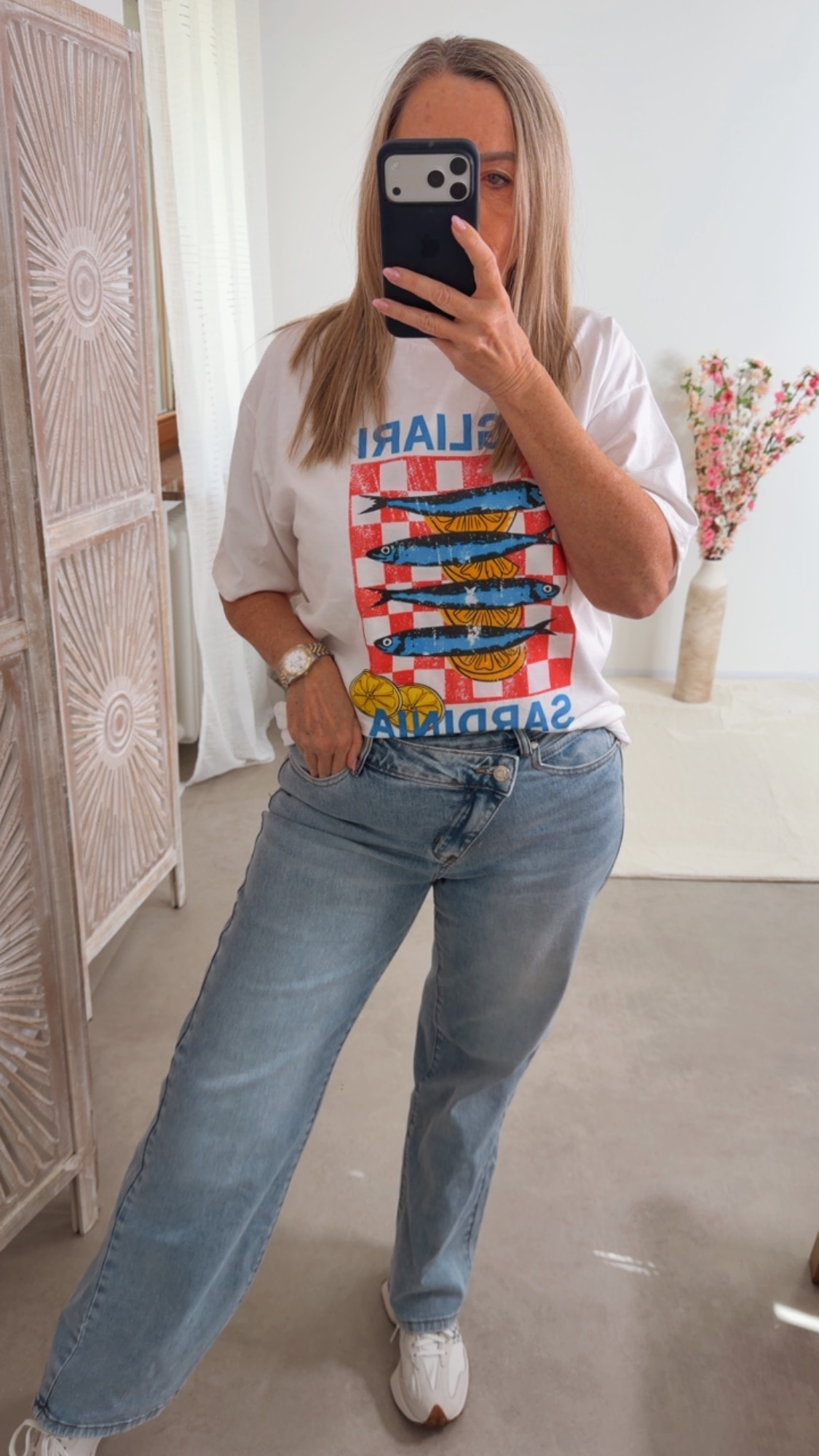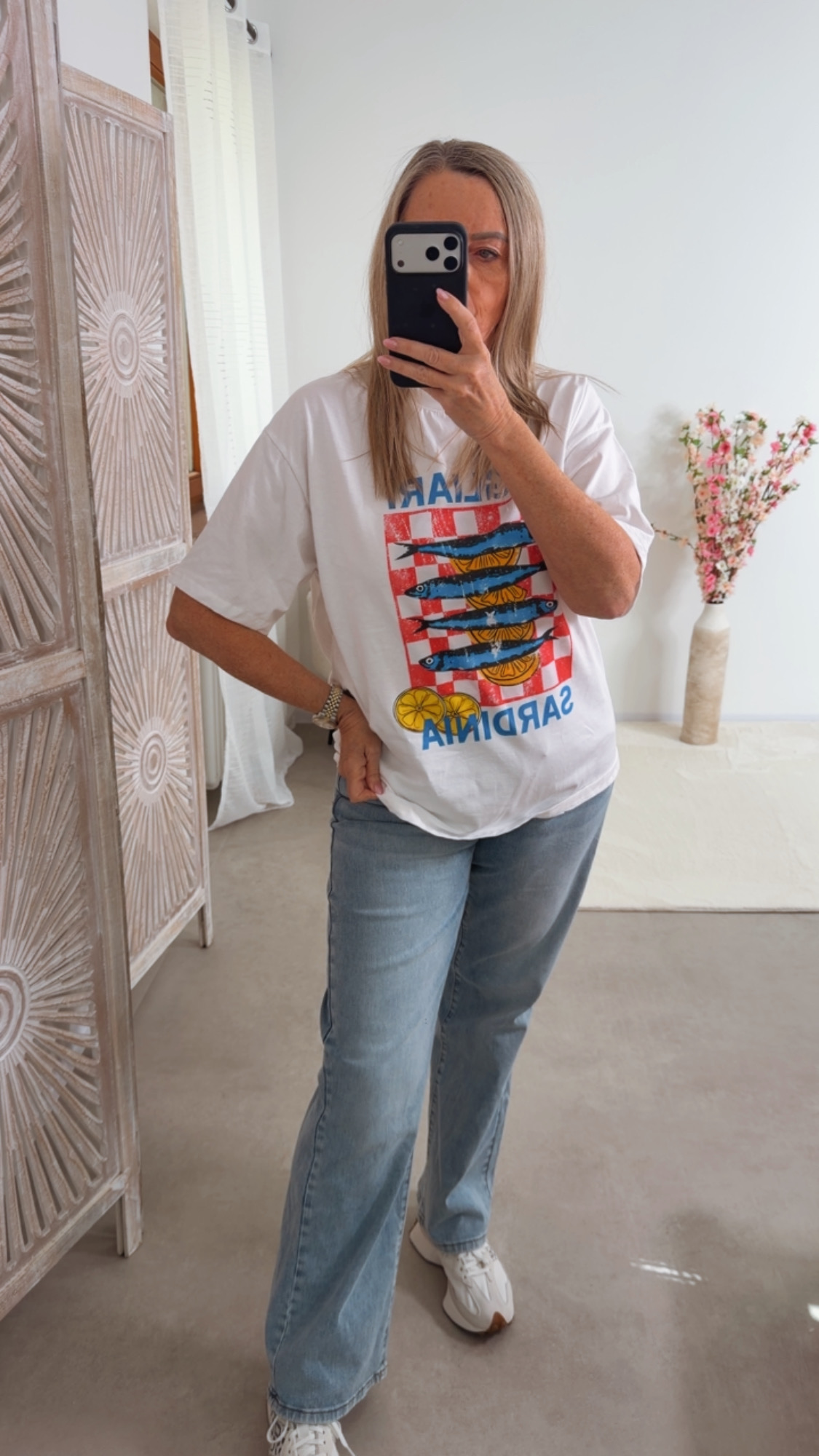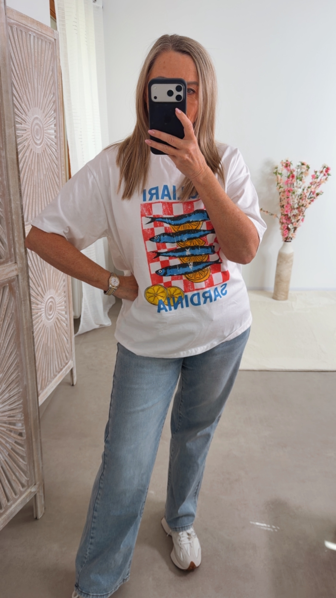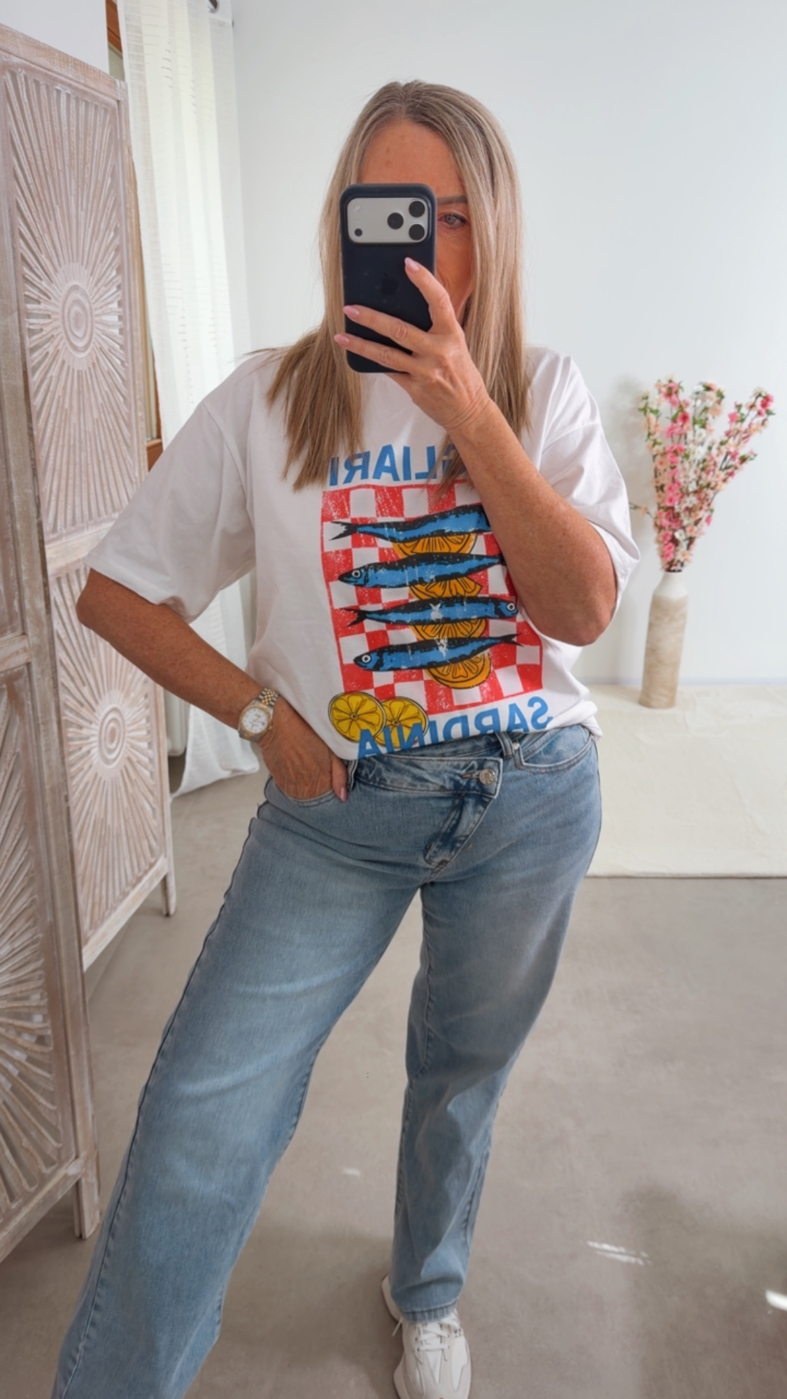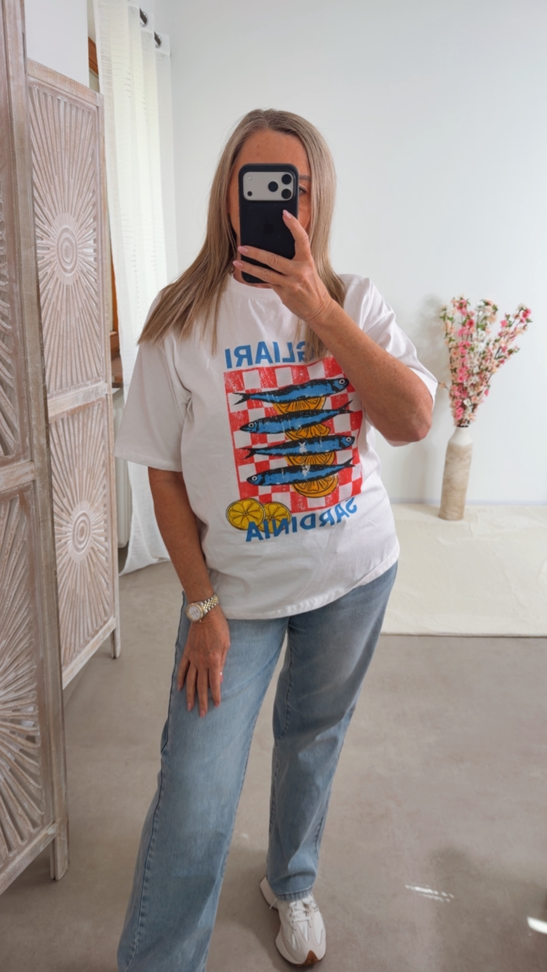 Der farbenfrohe Front-Print mit Sardinien-Vibes sorgt für einen frischen, sommerlichen Look und macht das Shirt zu einem echten Hingucker 🌊🐟🍋