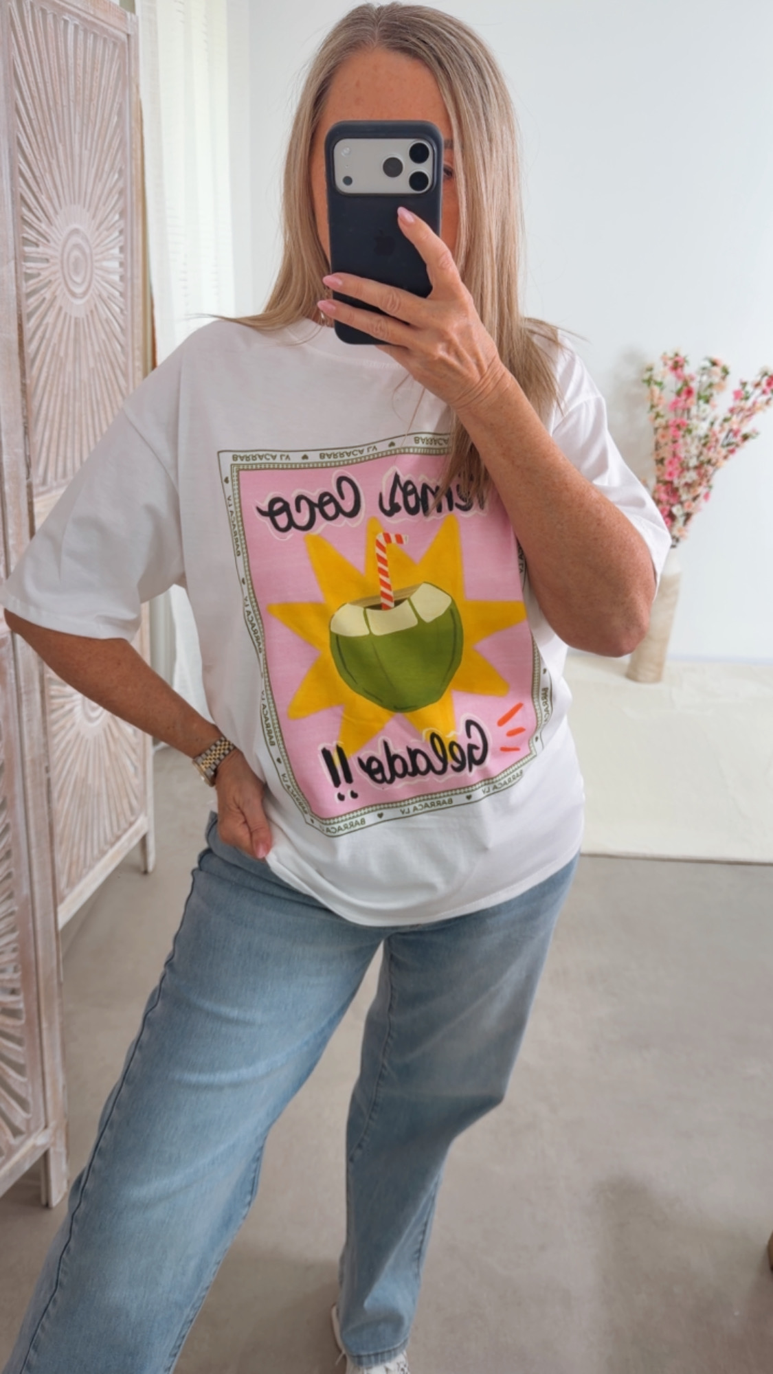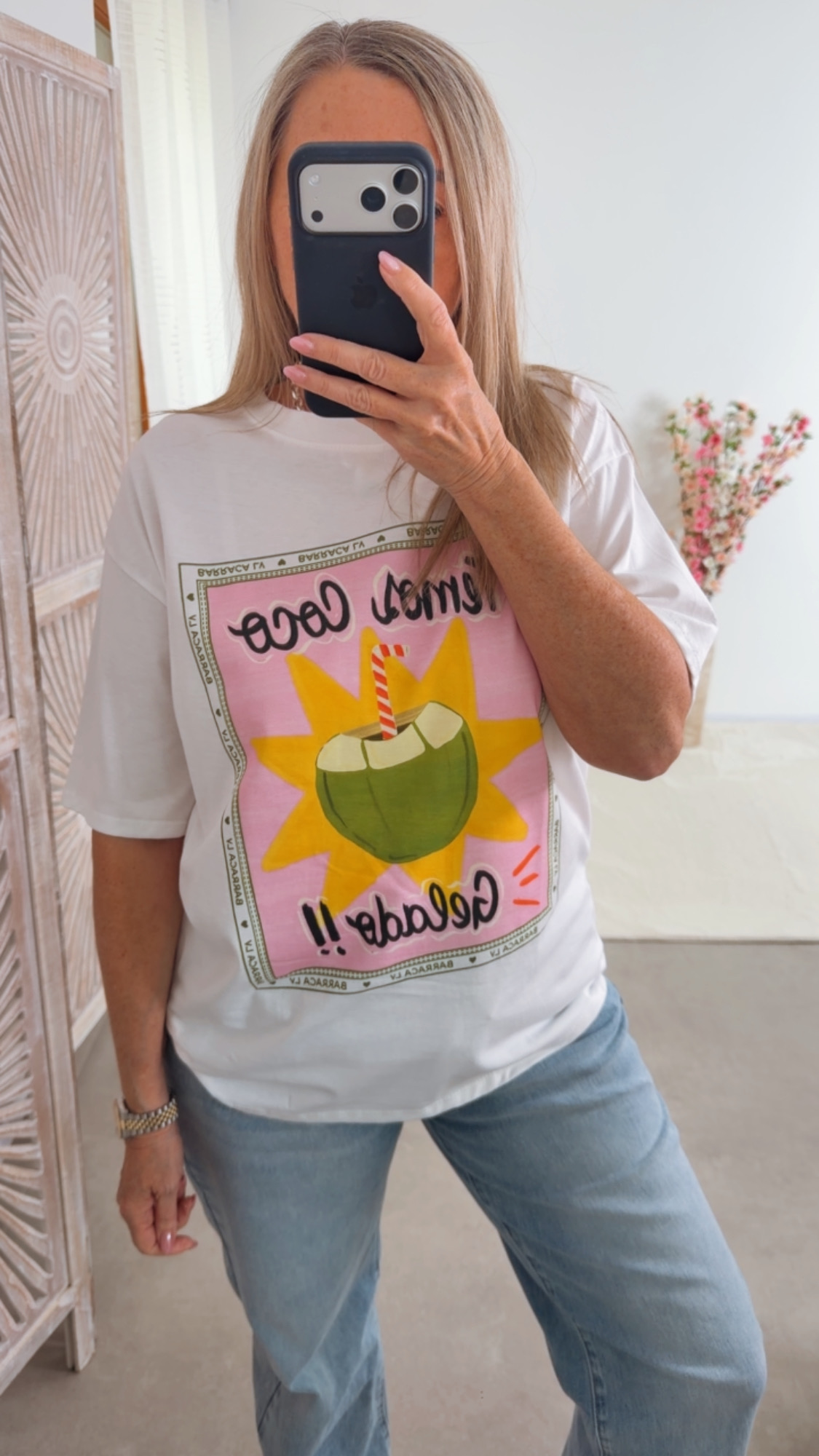 Der farbenfrohe Front-Print mit Kokosnuss-Motiv & Schriftzug sorgt für einen frischen, verspielten Style und macht dieses Shirt zu einem echten Eyecatcher 🍹🌴💛