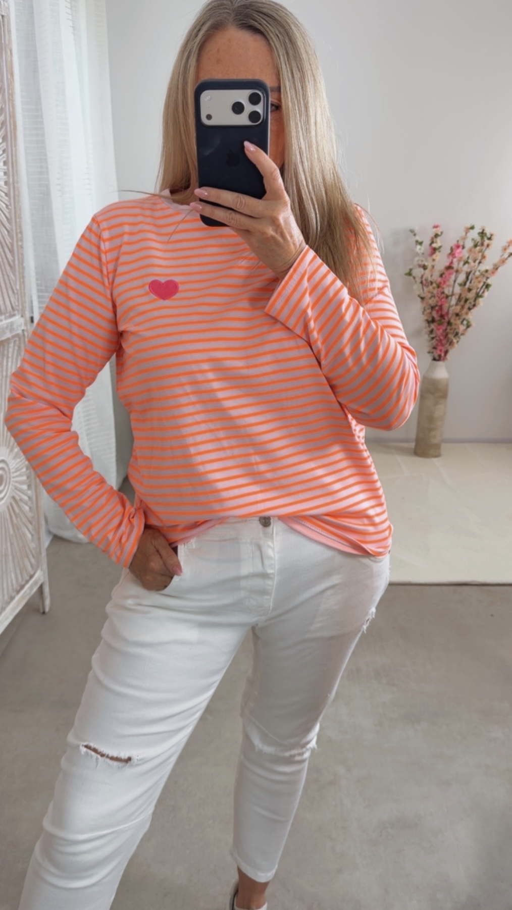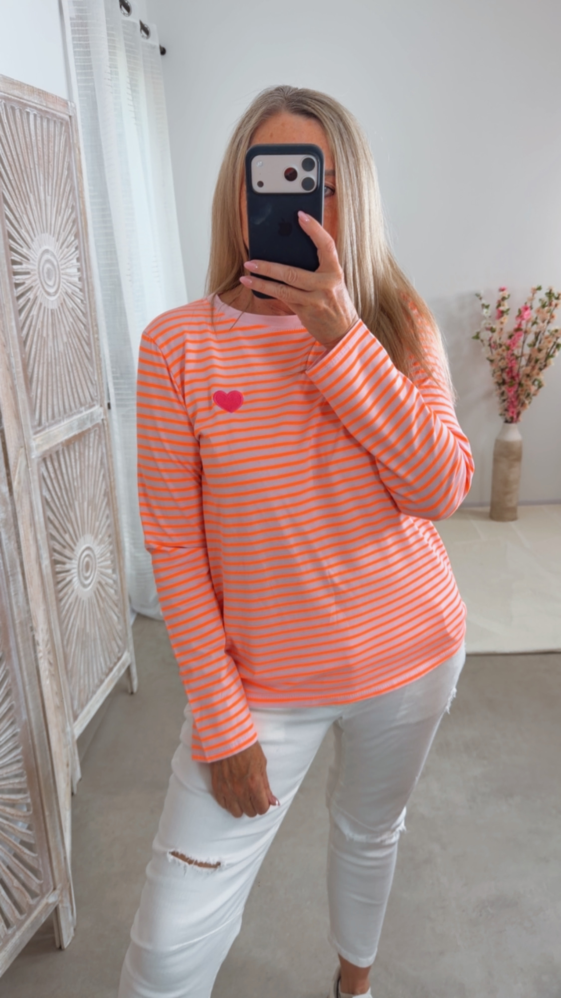 Das wunderschöne Streifenshirt „Procida“ begeistert mit seinem modernen Streifen-Design in leuchtenden Farben 🌈✨ und der süßen Herzstickerei vorne ❤️ – ein echter Hingucker für deinen Alltagslook!