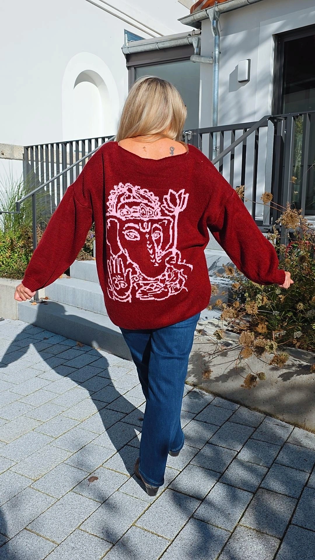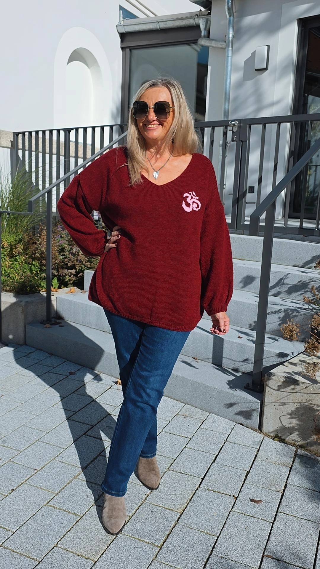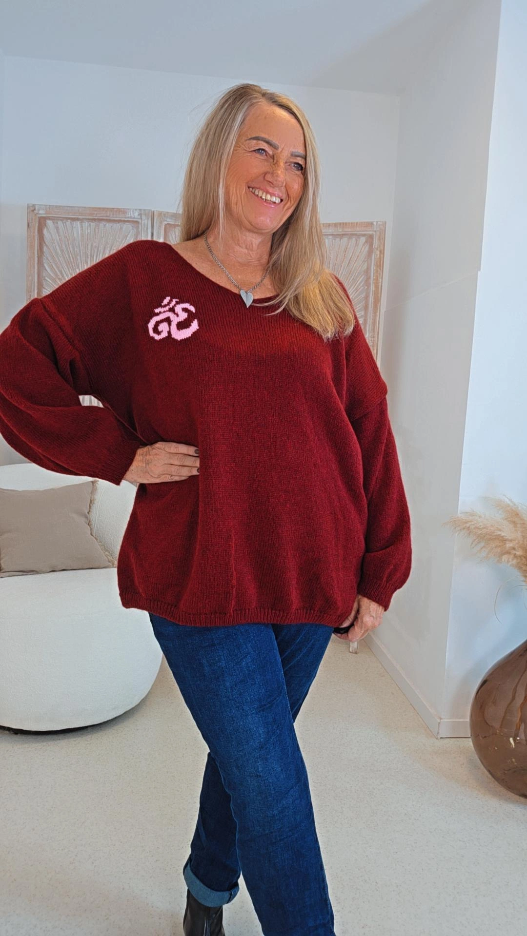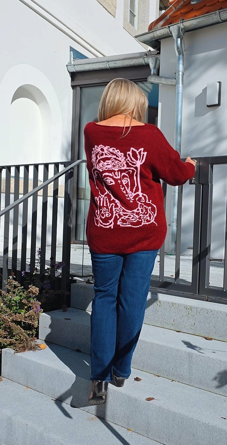 BURGUNDY-ROSA STRICK-PULLOVER YVONNE Rückenmotiv&V-Ausschnitt.3