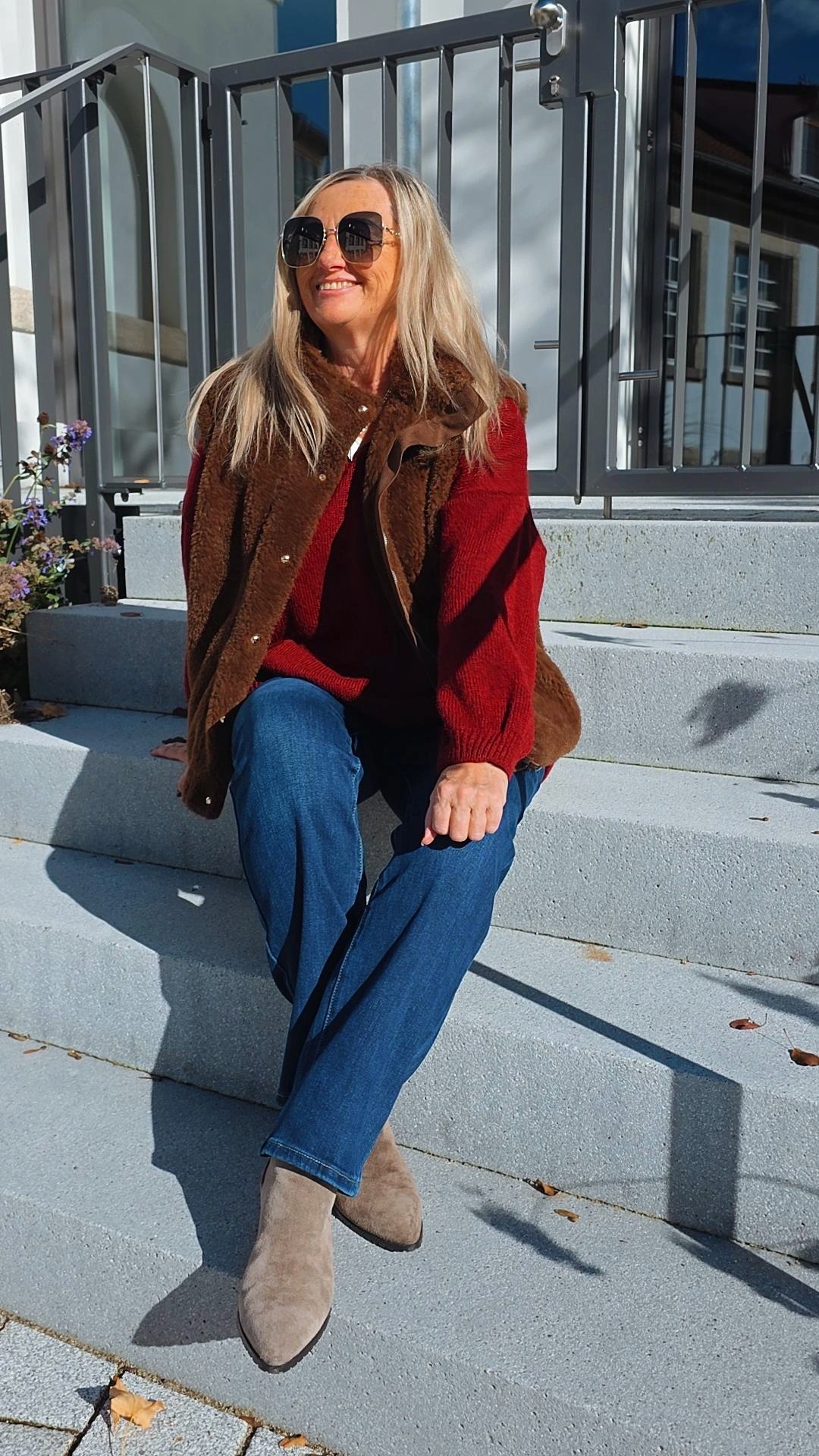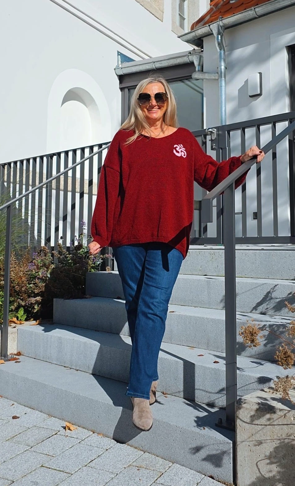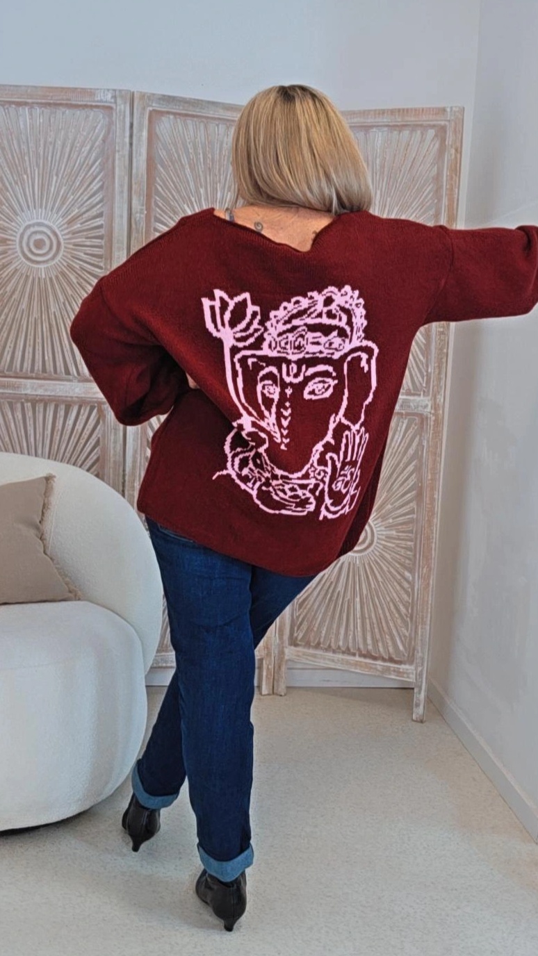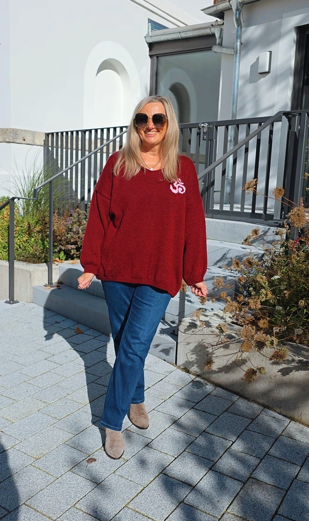 BURGUNDY-ROSA STRICK-PULLOVER YVONNE Rückenmotiv&V-Ausschnitt.3