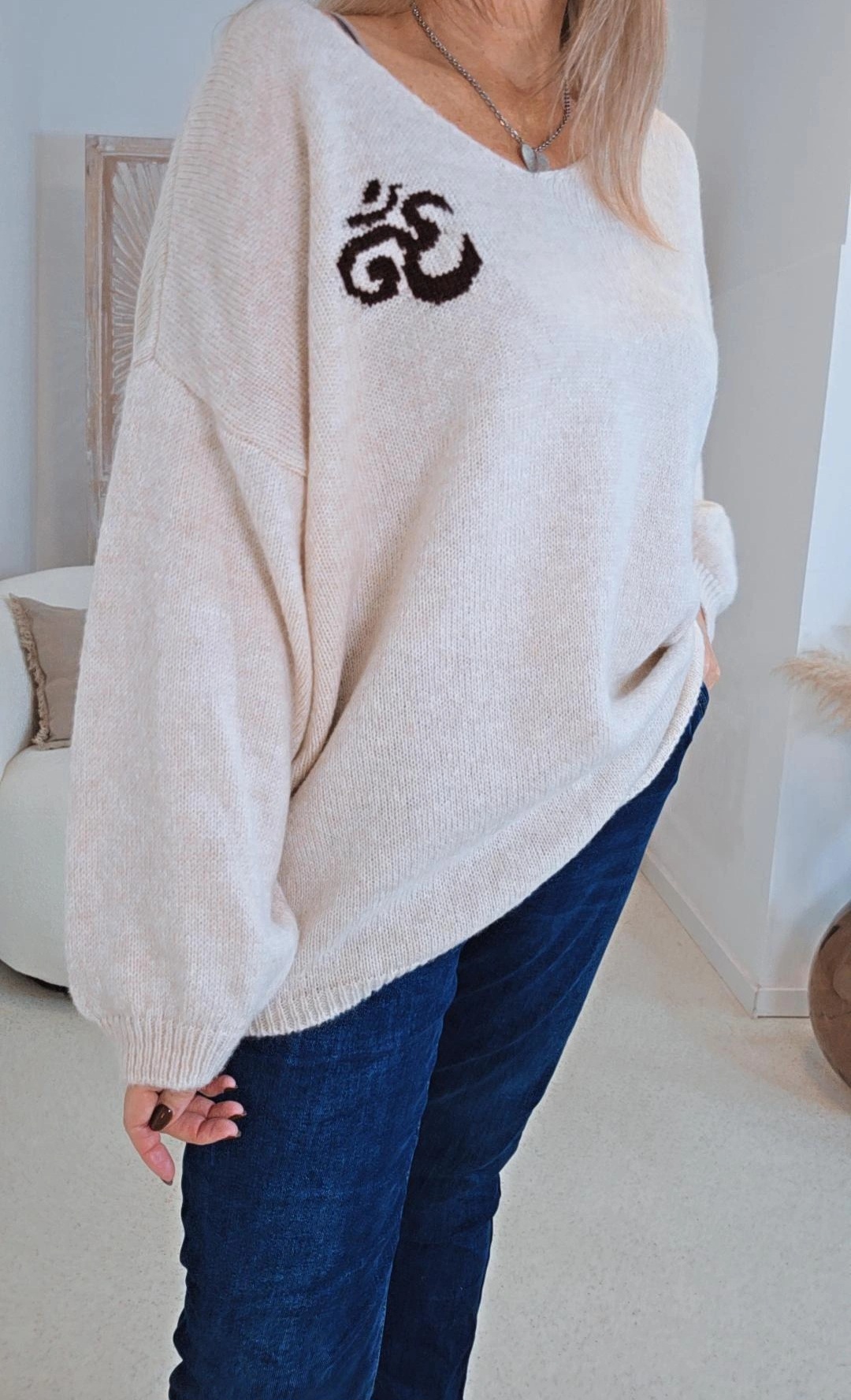 OATMEAL-SCHOKO STRICK-PULLOVER YVONNE Rückenmotiv&V-Ausschnitt.4