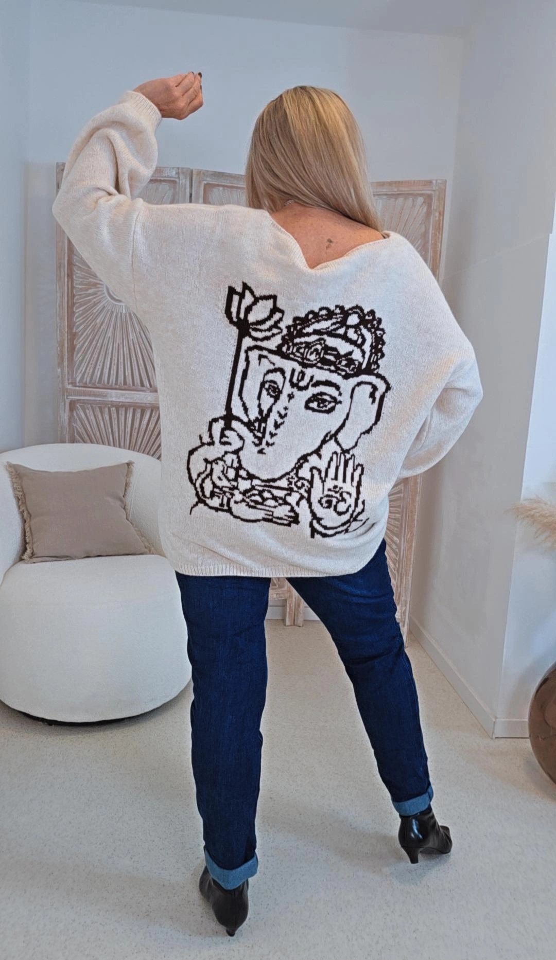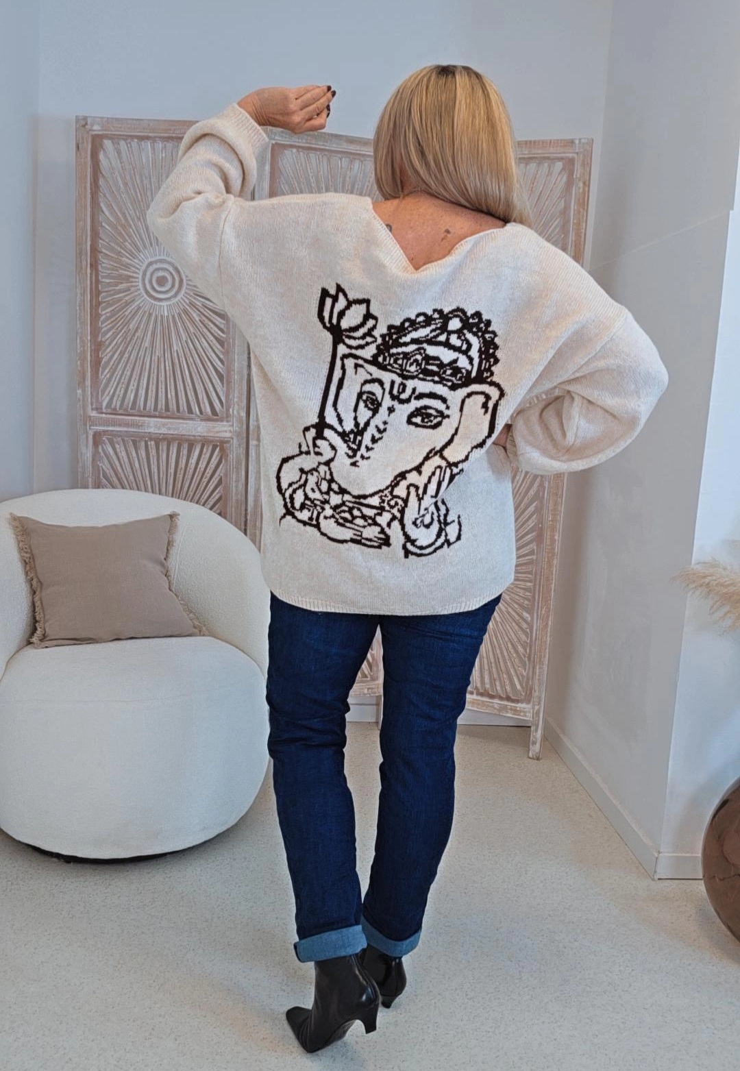 STRICK-PULLOVER YVONNE mit Rückenmotiv Elefant & V-Ausschnitt 34-44 Made in Italy