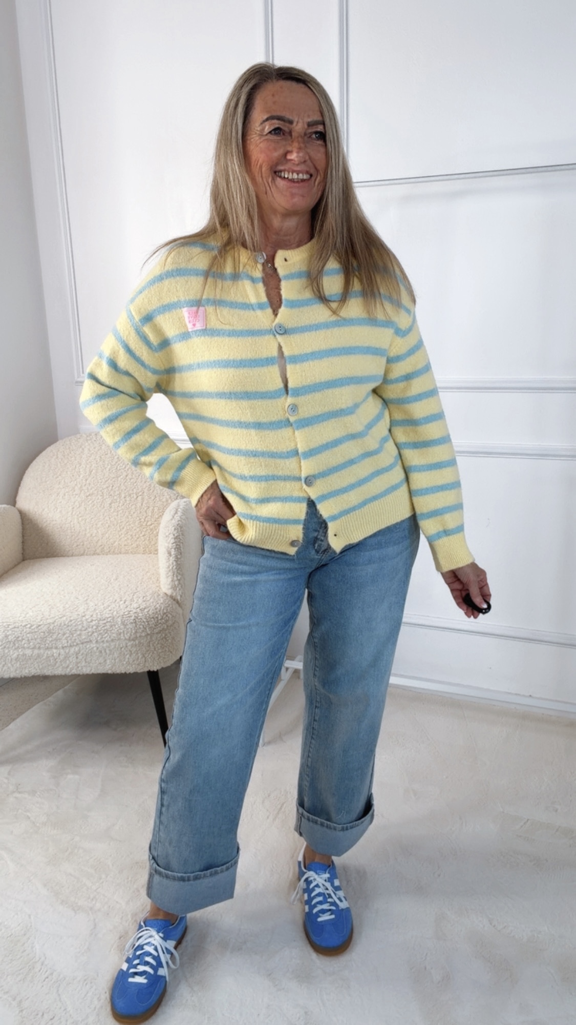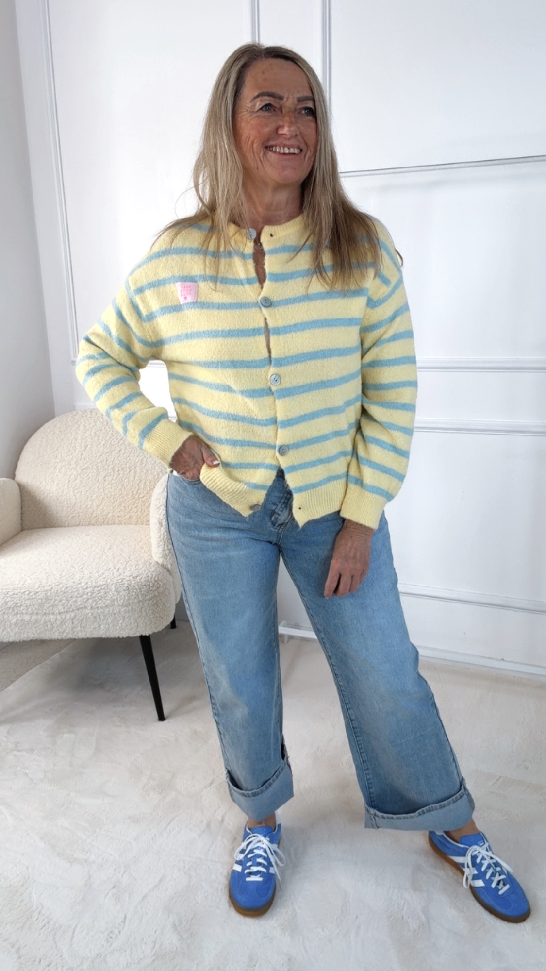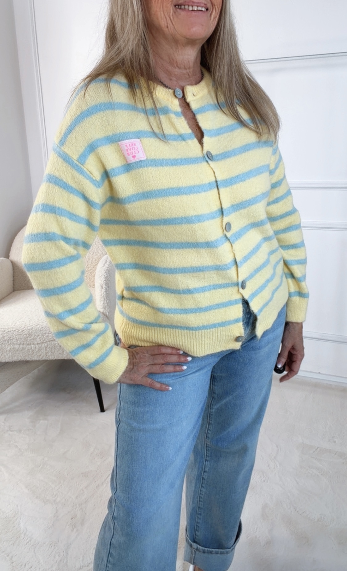 • Diese edle Strickjacke vereint klassischen Stil mit modernen Details. Feine Streifen verleihen dem Design eine zeitlose Note, während die Knopfleiste auf der Vorderseite einen stilvollen Akzent setzt. Abgerundet wird das Design durch den kleinen Patch „Self-Love-Club“, der ein charmantes Statement für Selbstbewusstsein und positive Vibes ist. Angenehm weich und vielseitig kombinierbar, eignet sich die Strickjacke perfekt für elegante Layering-Looks oder gemütliche Everyday-Outfits.