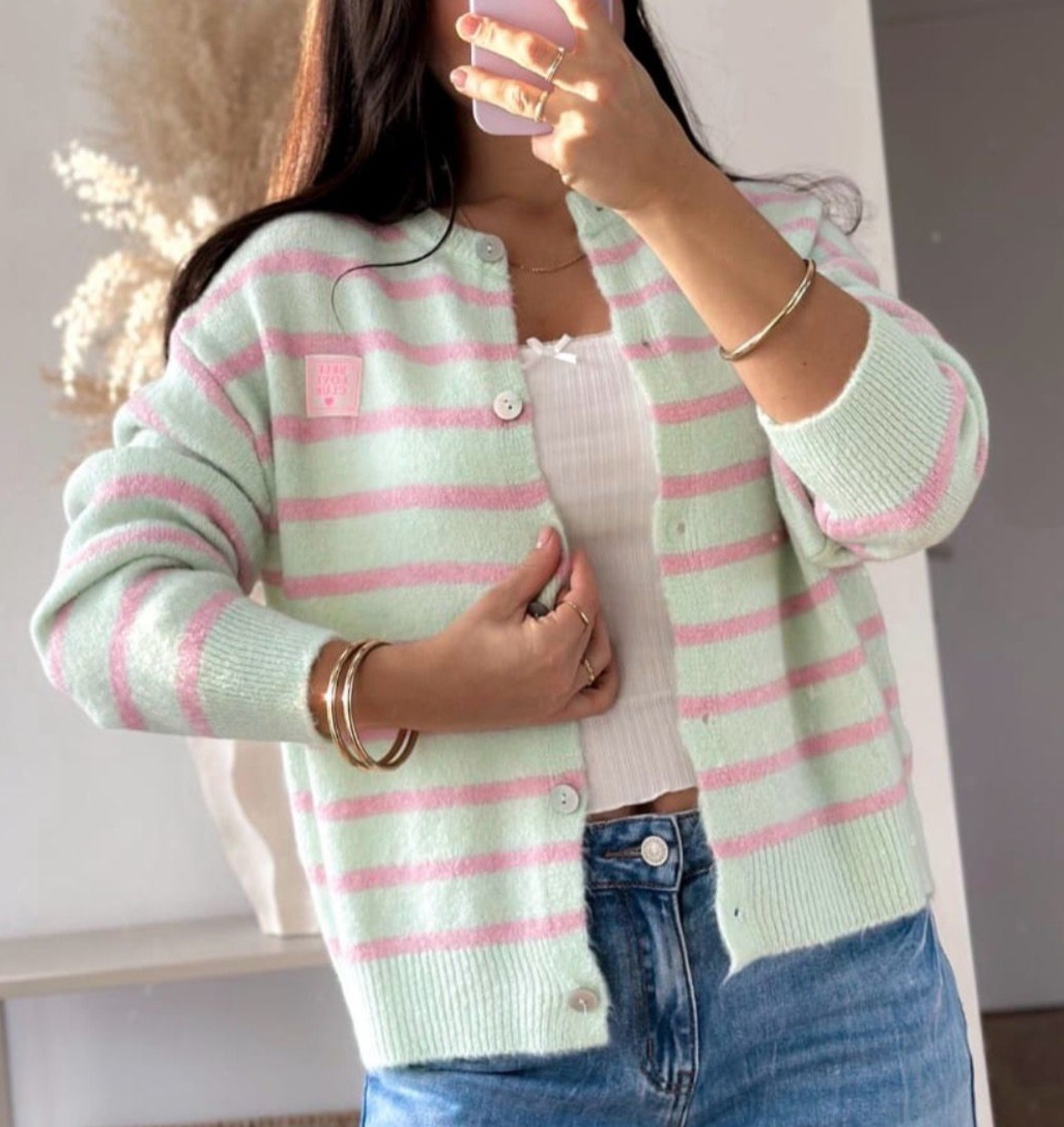 Diese edle Strickjacke vereint klassischen Stil mit modernen Details. Feine Streifen verleihen dem Design eine zeitlose Note, während die Knopfleiste auf der Vorderseite einen stilvollen Akzent setzt. Abgerundet wird das Design durch den kleinen Patch „Self-Love-Club“, der ein charmantes Statement für Selbstbewusstsein und positive Vibes ist. Angenehm weich und vielseitig kombinierbar, eignet sich die Strickjacke perfekt für elegante Layering-Looks oder gemütliche Everyday-Outfits.