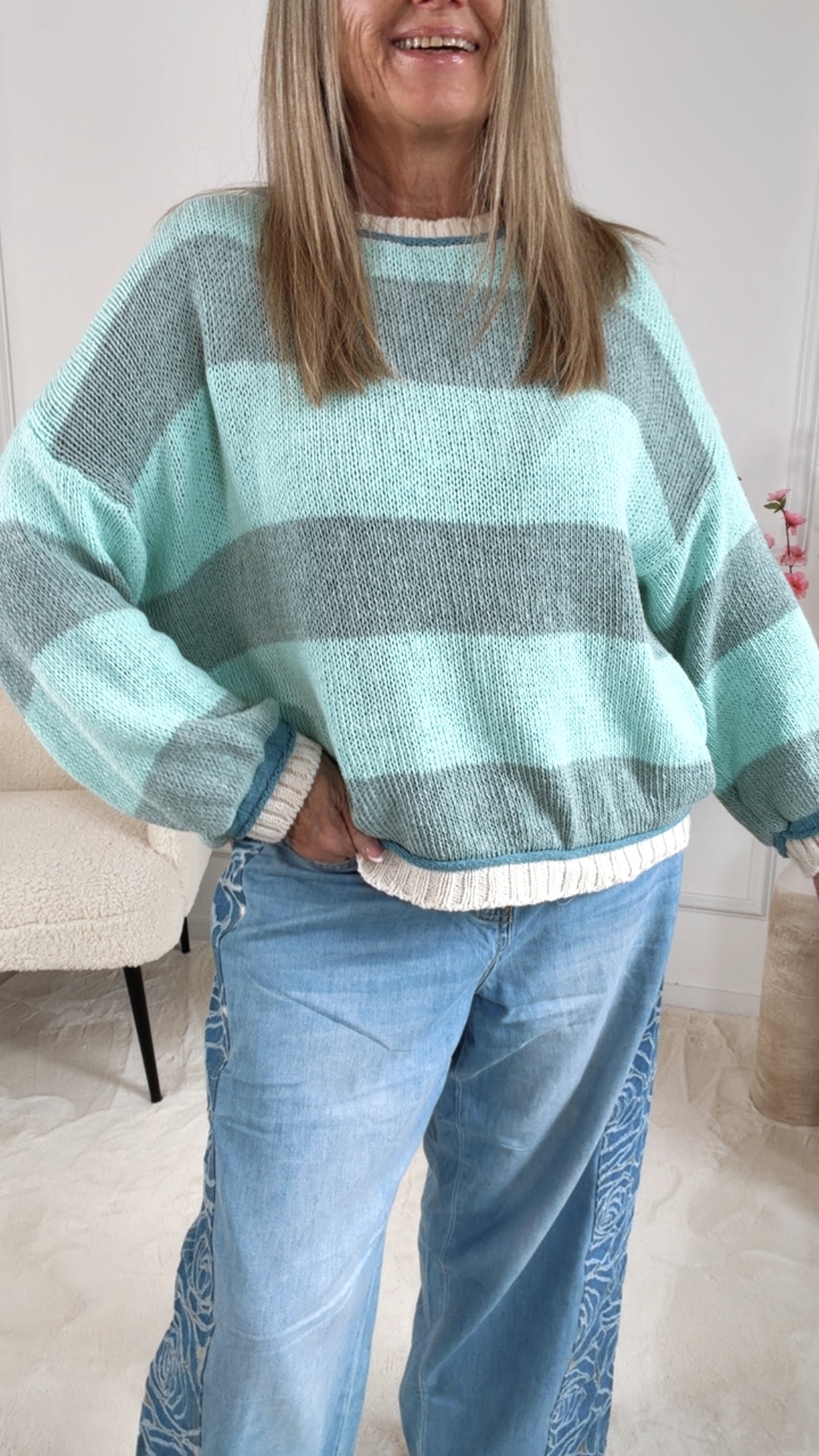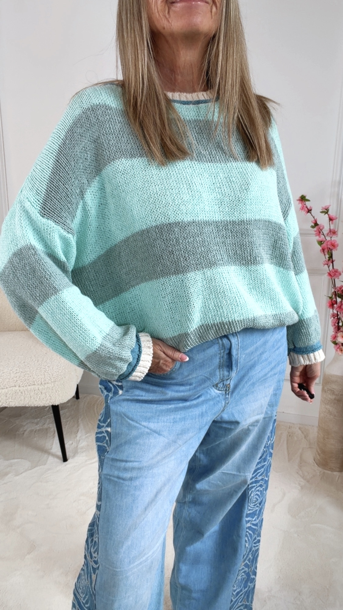 Der modische Pullover „Alessira“ überzeugt mit seinem frischen Aquamarin-Grau Streifen-Design und bringt einen modernen, entspannten Look in deine Garderobe. Die harmonische Farbkombination wirkt leicht und stilvoll und lässt sich perfekt zu Jeans, Stoffhosen oder Röcken kombinieren. 👖✨
