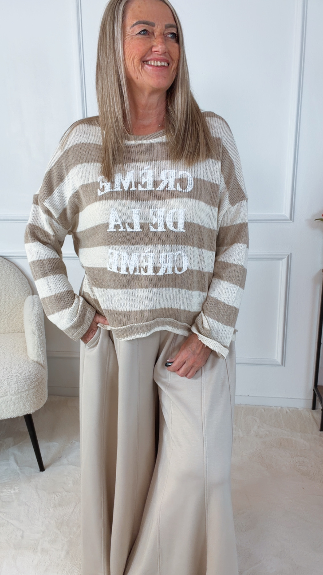 Dieser stylische Strickpullover bringt modernen Chic und gemütlichen Komfort perfekt zusammen. Das markante Blockstreifen-Muster verleiht dem Pullover eine zeitgemäße, grafische Optik, während die bestickte Aufschrift „Crème de la Crème“ auf der Vorderseite einen besonderen, selbstbewussten Akzent setzt.