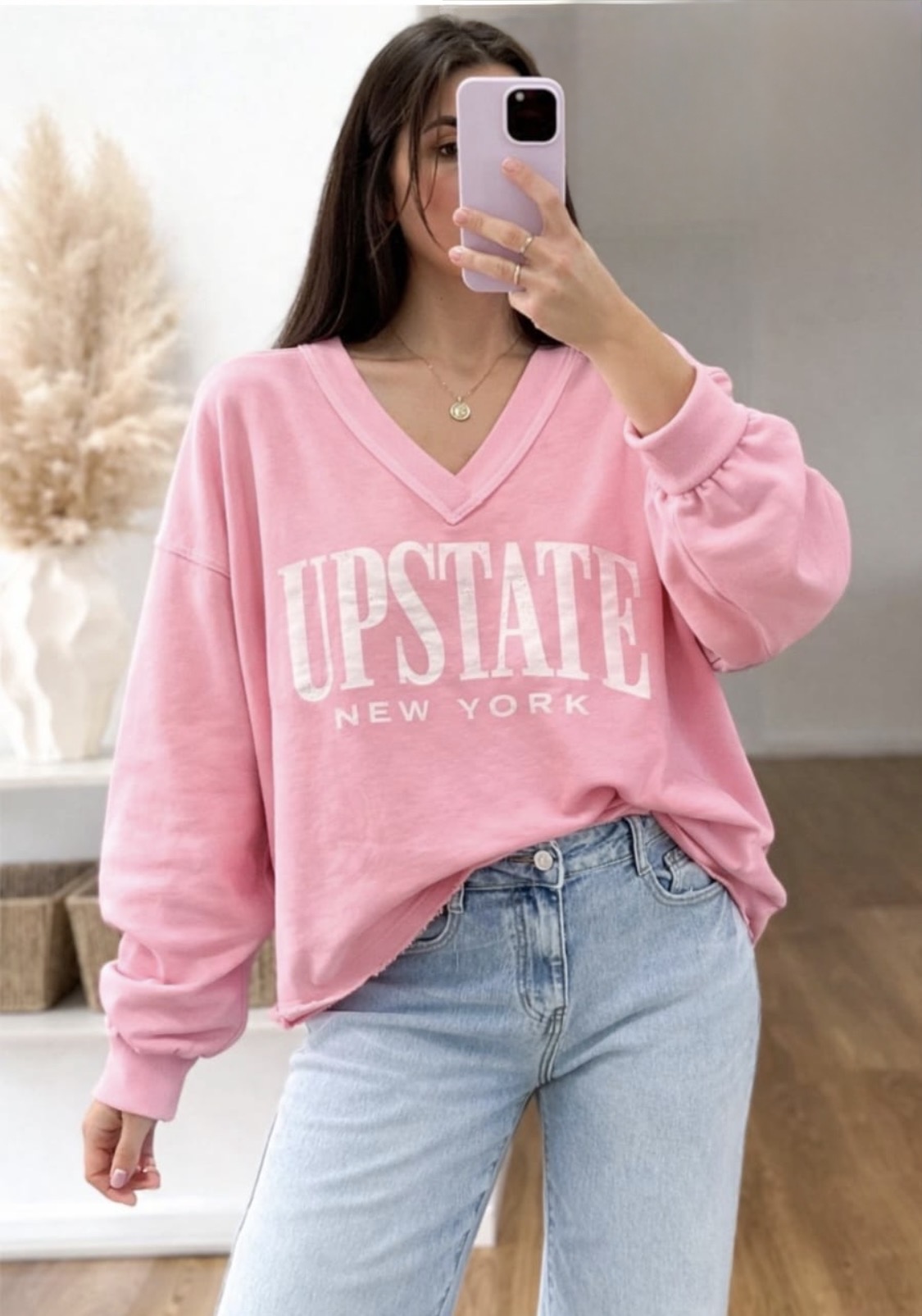 Dieser Sweater mit angesagtem V-Ausschnitt vereint Komfort und Style auf perfekte Weise. Der trendige Aufdruck setzt einen modernen Akzent und macht den Sweater zu einem echten Hingucker. Das weiche Material sorgt für ein angenehmes Tragegefühl, während der Schnitt locker und vielseitig kombinierbar bleibt – ideal für lässige Alltagslooks mit coolem Statement.
