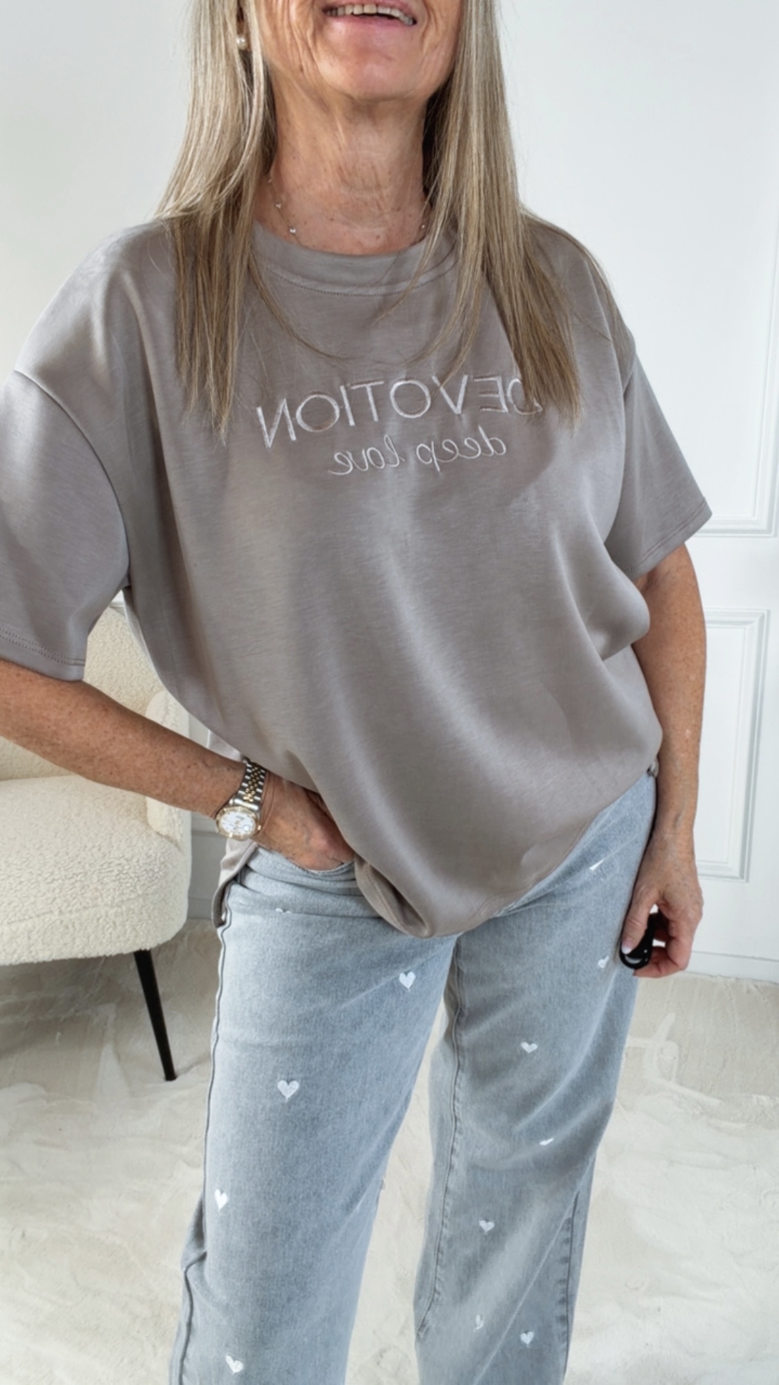 Der elegante Print „Devotion Deep Love“ auf der Vorderseite setzt ein stilvolles Statement und macht das Oberteil zu einem echten Lieblingsstück im Kleiderschrank.