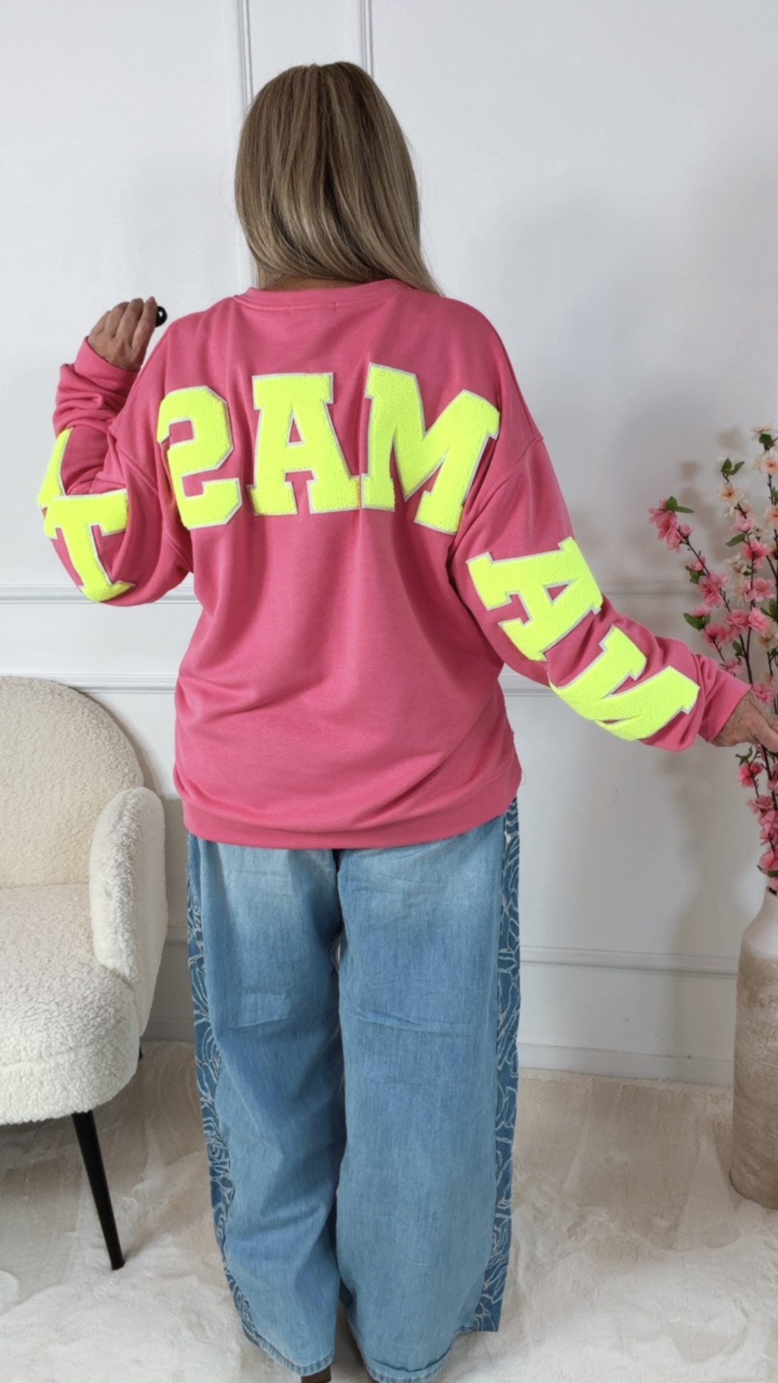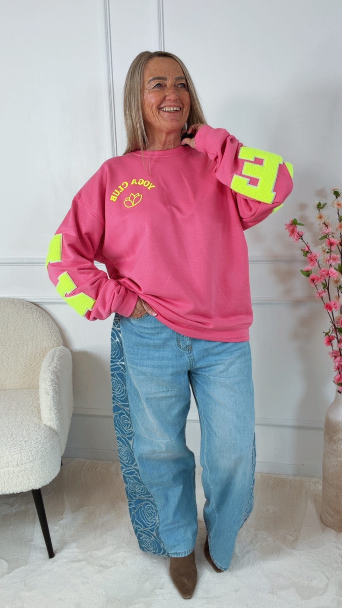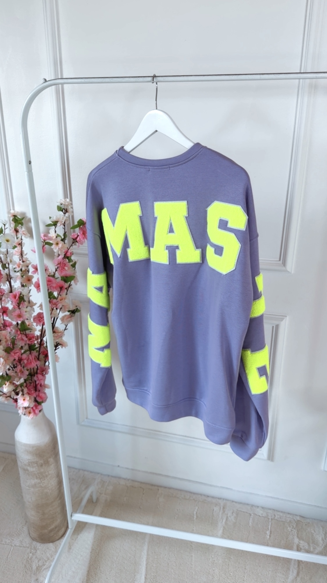Der „Lilja Namaste Sweater“ verbindet gemütlichen Komfort mit einer modernen, spirituellen Ausstrahlung 💜. Der zarte Lilaton wird durch die auffällige Neon-Beflockung perfekt ergänzt und macht den Pullover zu einem echten Hingucker.Auf der Vorderseite sorgt der „Yoga Club“-Print für eine stylische Note, während auf der Rückseite und den Ärmeln die große „NAMASTE“ Beflockung für ein starkes Statement sorgt ✨. Die flauschige Struktur der Beflockung gibt dem Sweater einen besonderen 3D-Effekt und macht ihn zu einem echten Highlight.