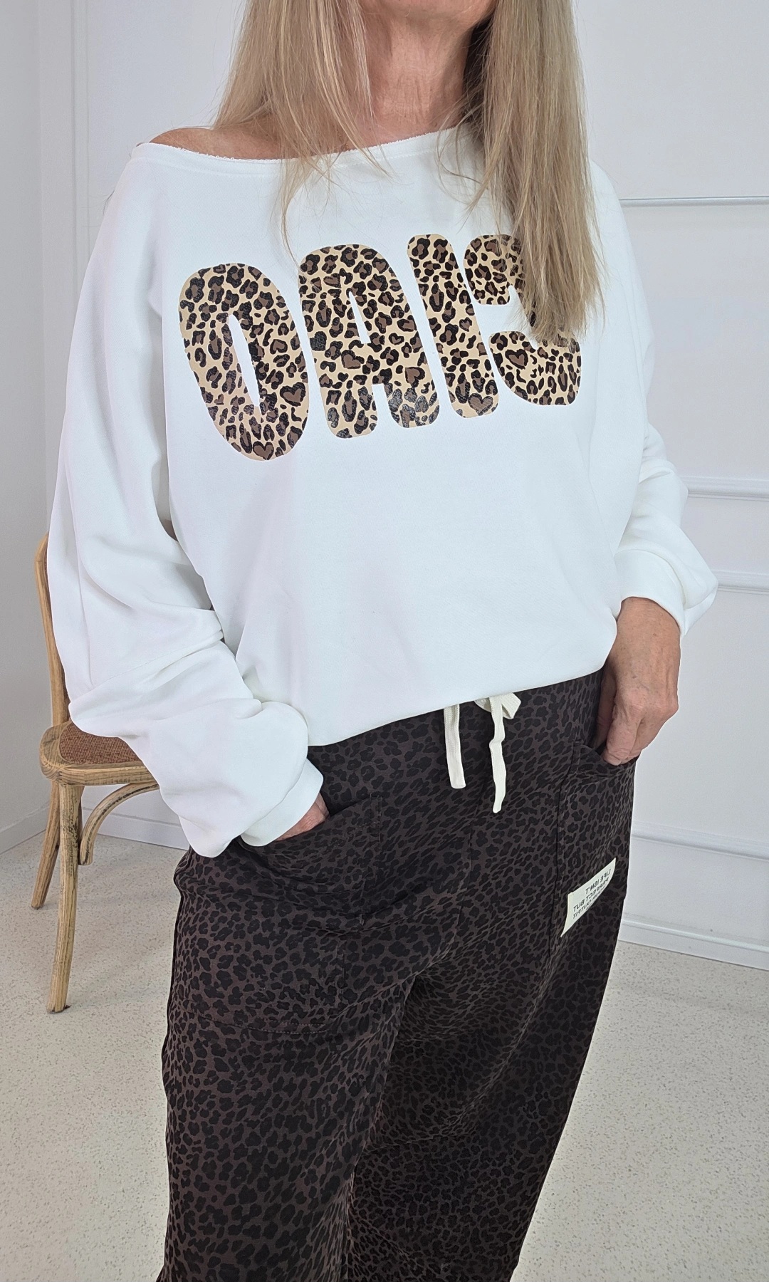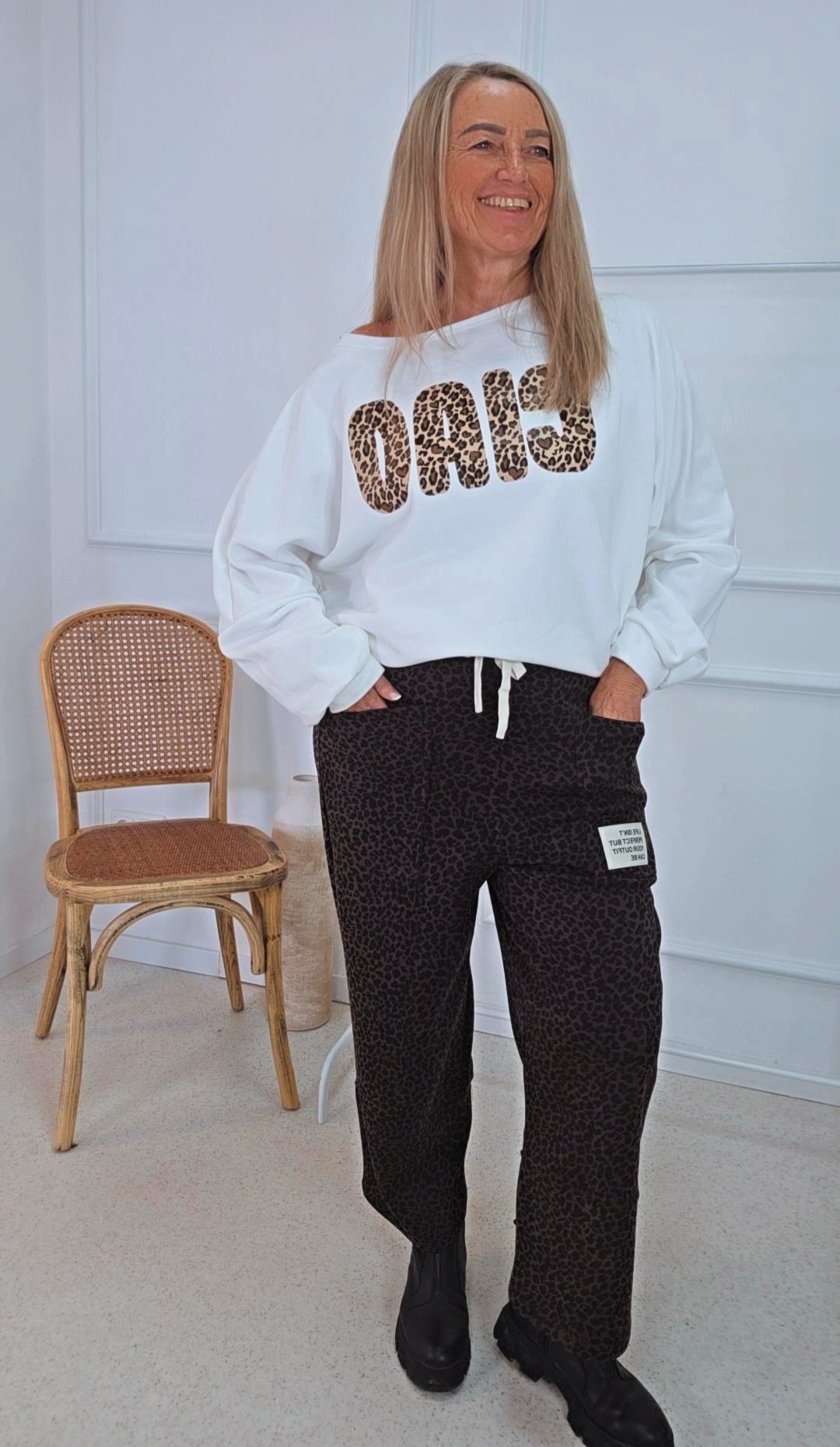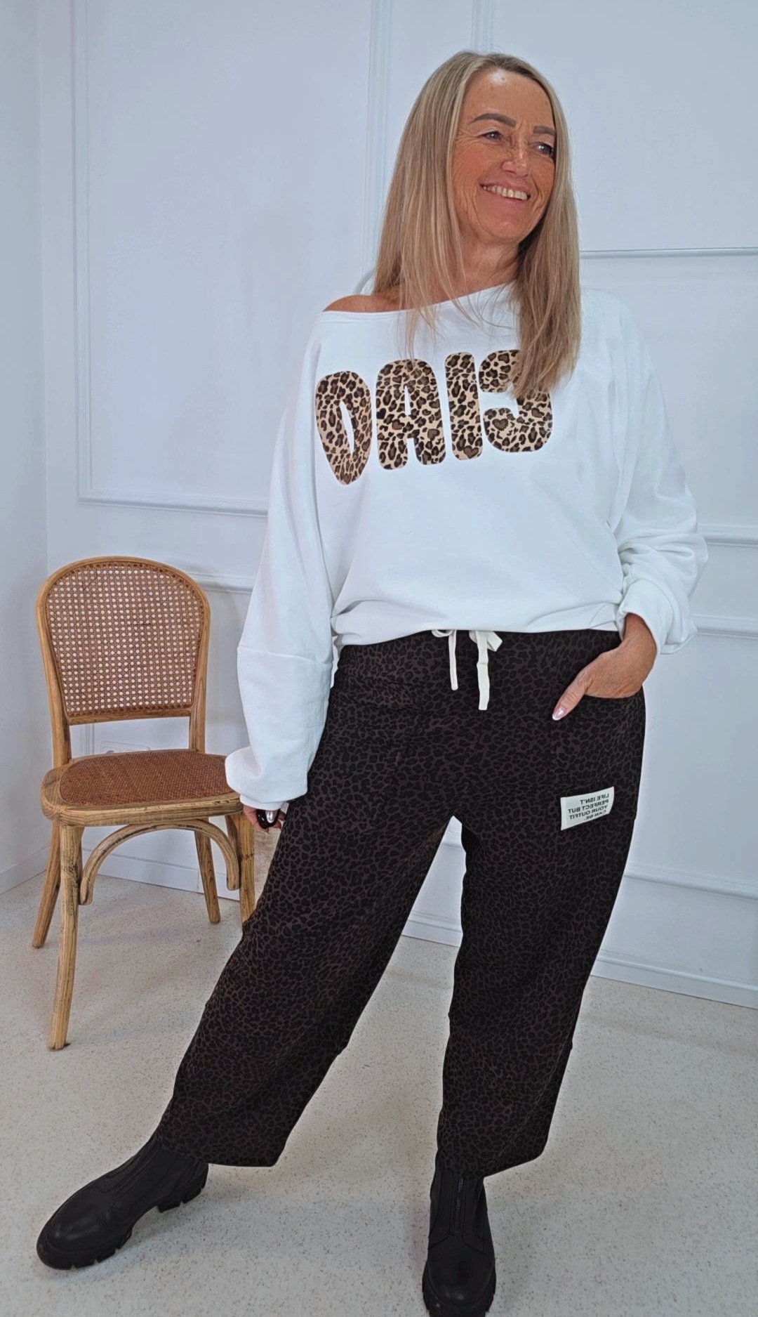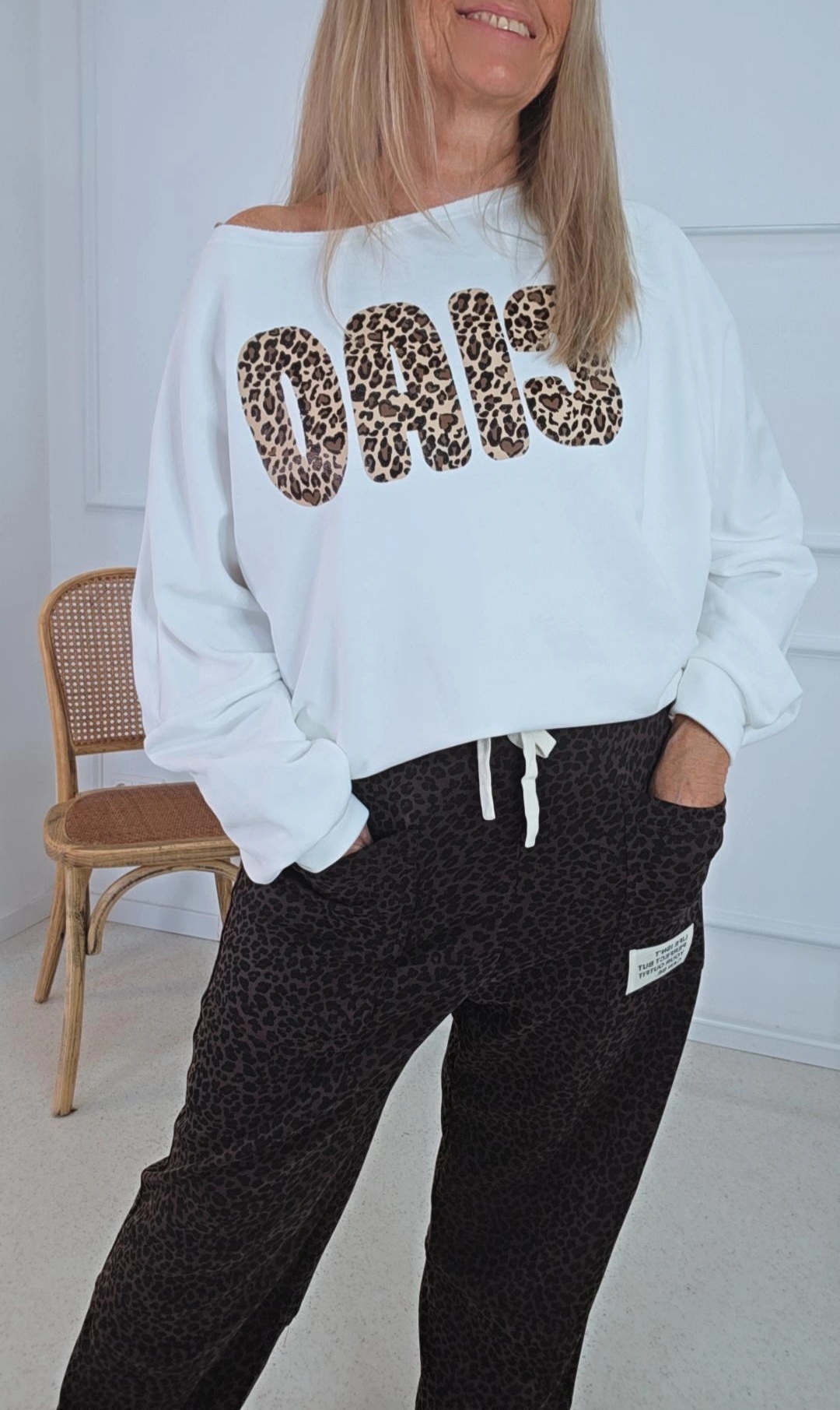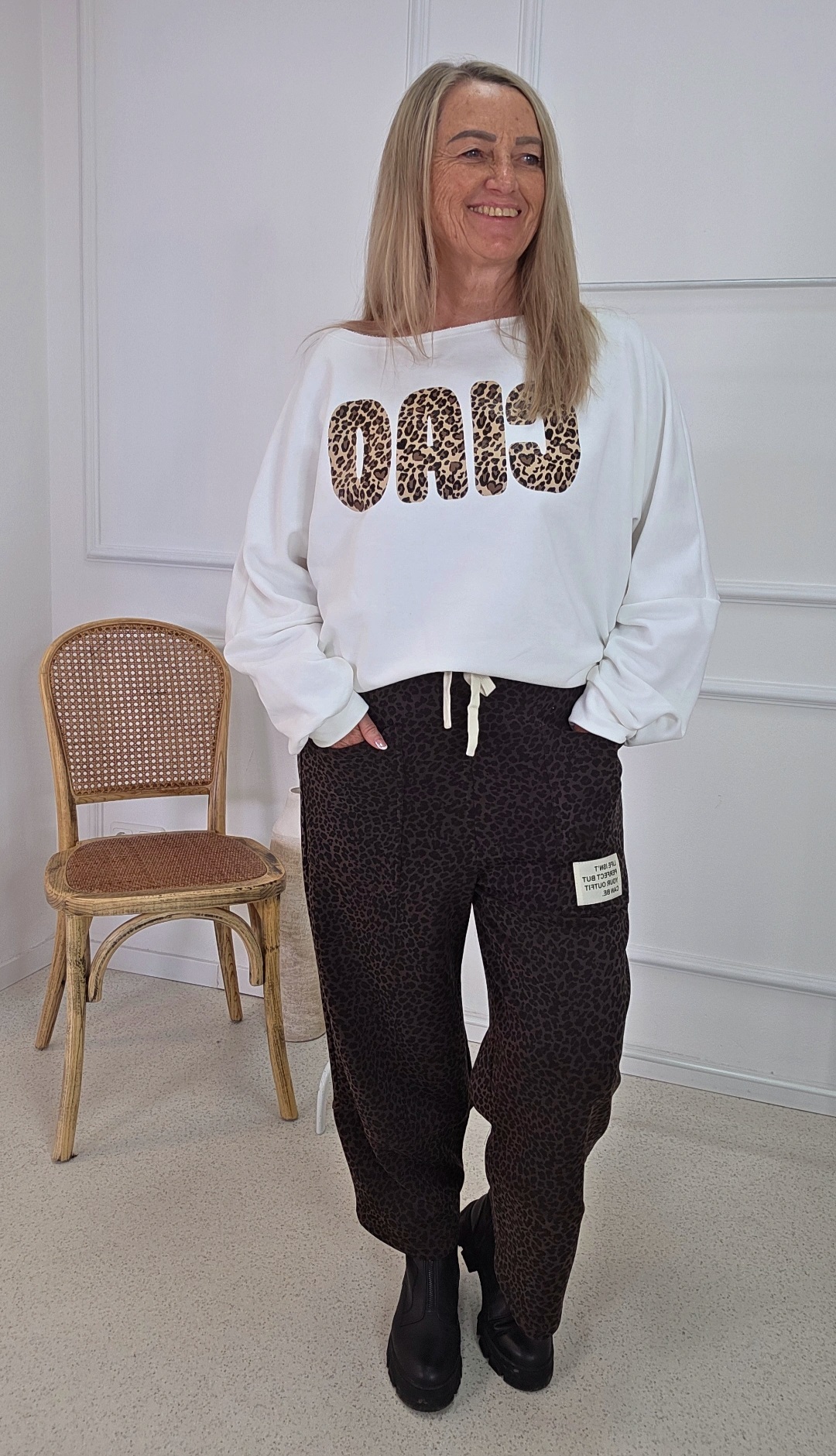 Dieser stylische Sweater ist ein echtes Statement-Piece! Der auffällige „CIAO“-Schriftzug im trendigen Leo-Muster verleiht dem klassischen Sweater einen modernen, verspielten Look. Hergestellt aus weicher Baumwollmischung, sorgt er für hohen Tragekomfort und eine angenehme Passform – perfekt für lässige Alltagslooks oder gemütliche Stunden zu Hause.
