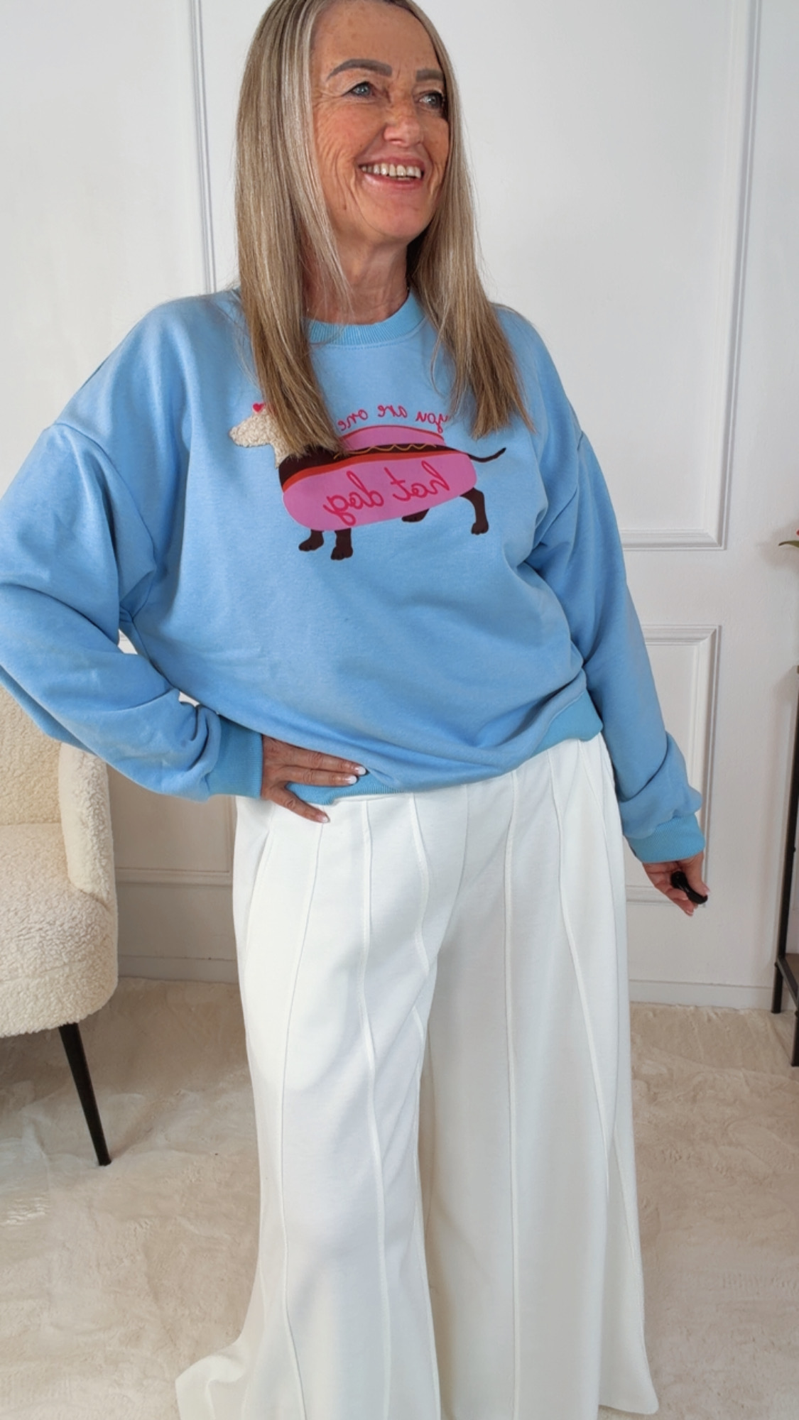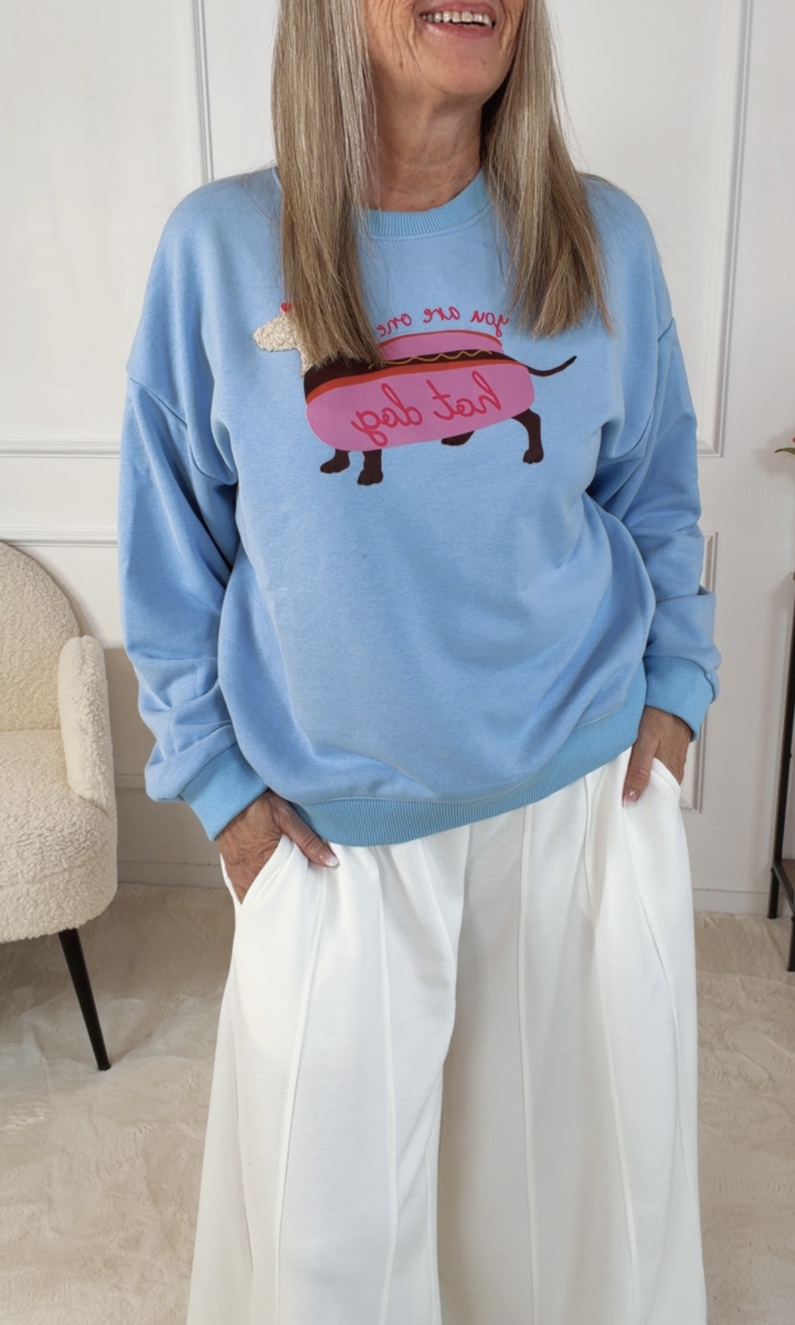 Dieses liebevoll gestaltete Sweatshirt vereint französischen Charme mit niedlichem Design. Der detailreich gestickte Dackel mit der Aufschrift „Hot Dog“ macht es zu einem echten Hingucker – perfekt für alle, die Mode mit Persönlichkeit lieben.