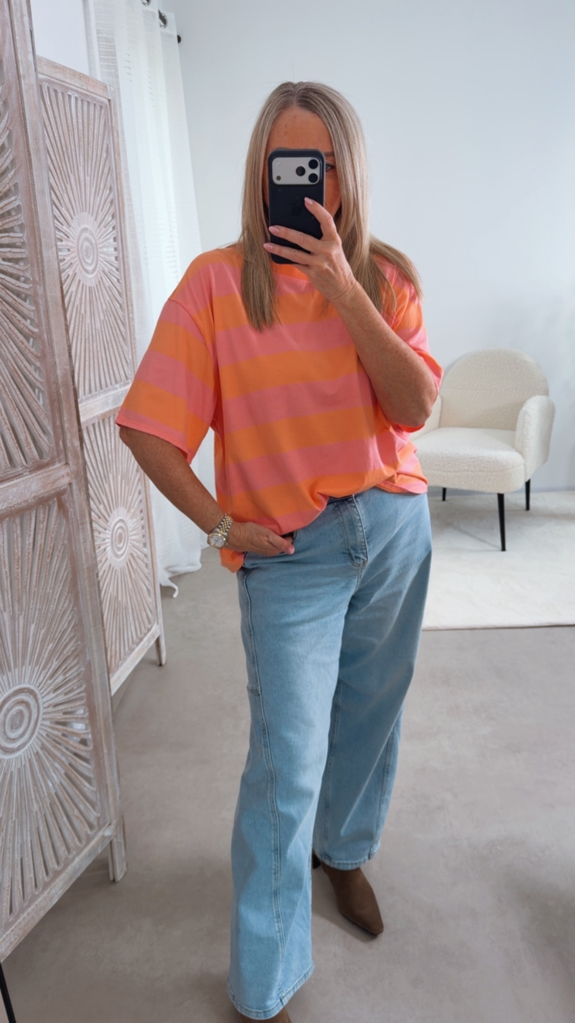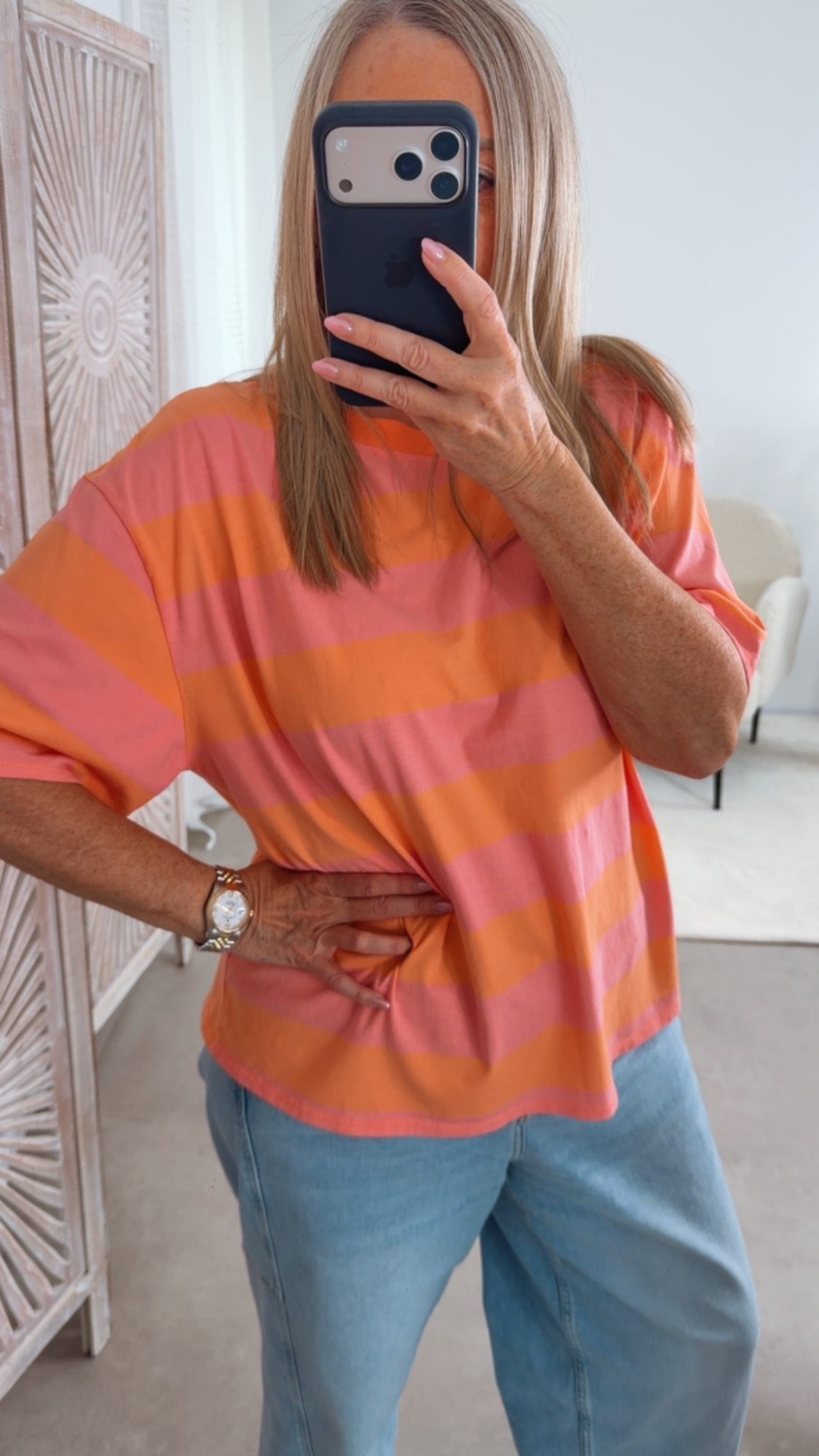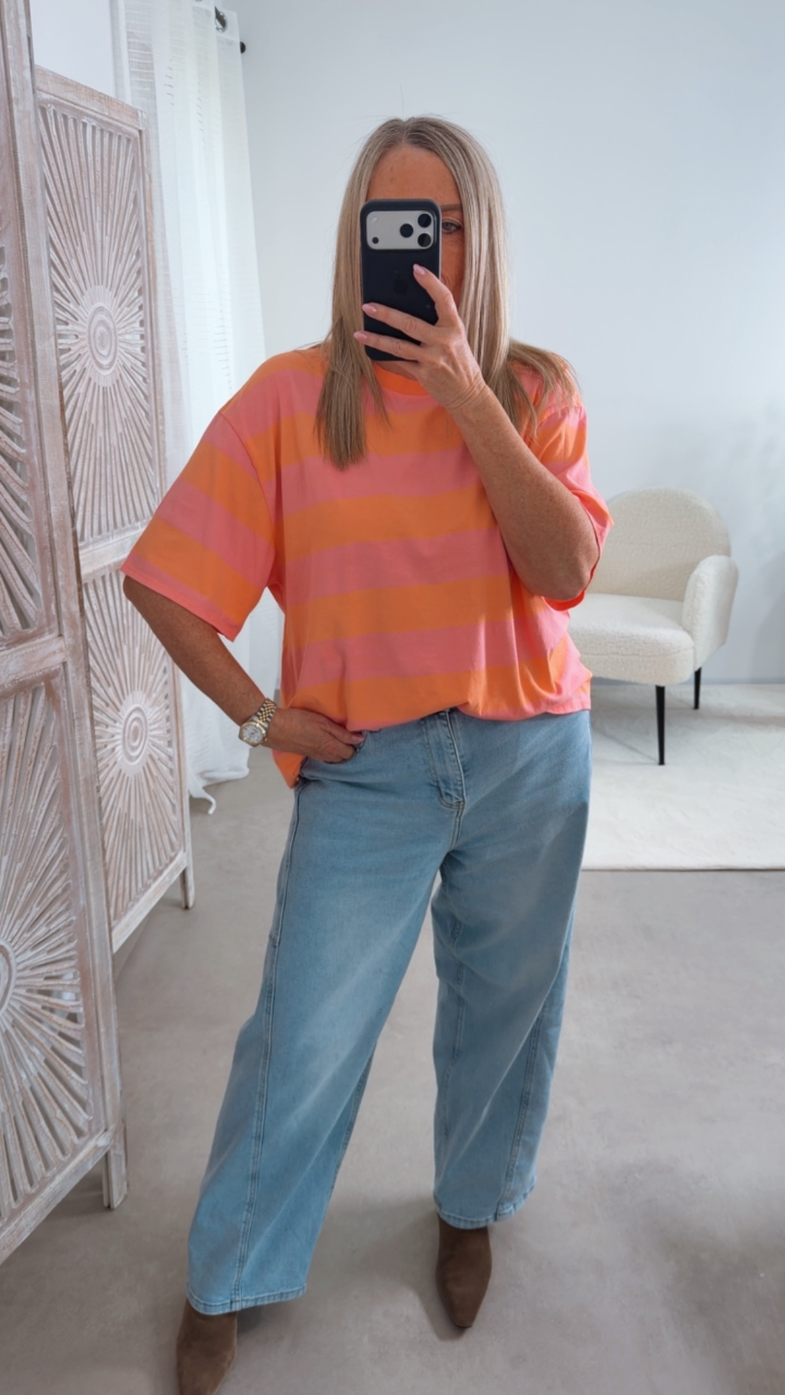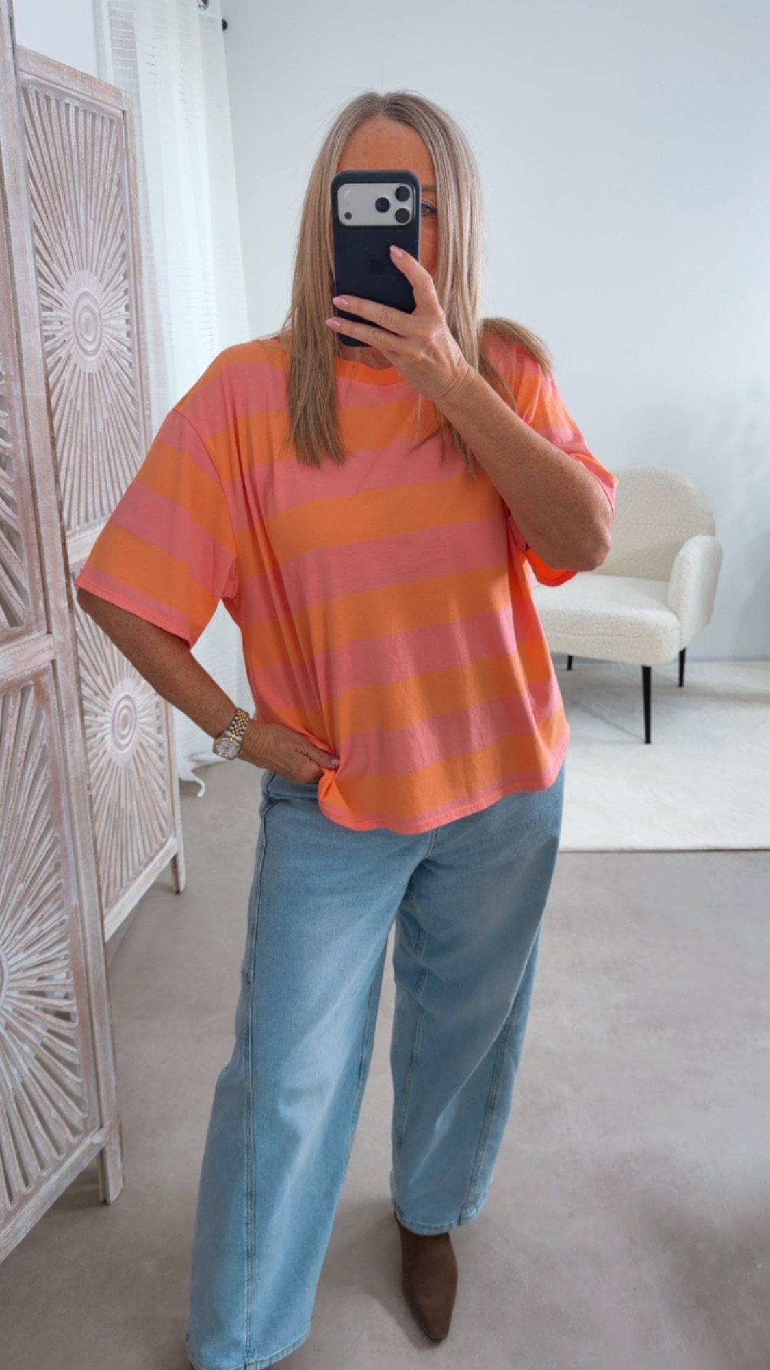 Das stylische T-Shirt „Elyzoria“ begeistert mit seinem modernen Blockstreifen-Design in leuchtenden Farben 😍🧡💗 – perfekt für alle, die ihrem Outfit einen frischen, sommerlichen Touch verleihen möchten! ☀️✨