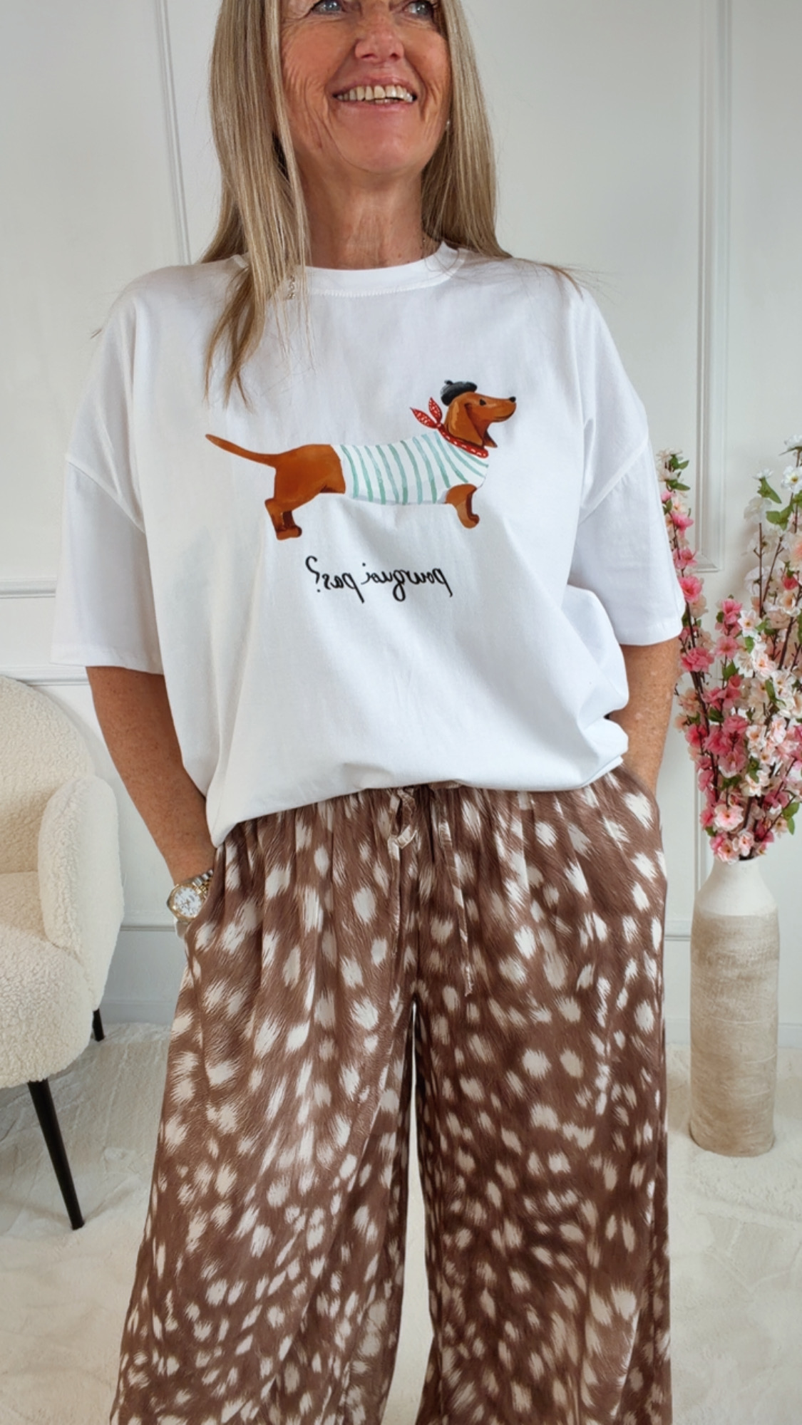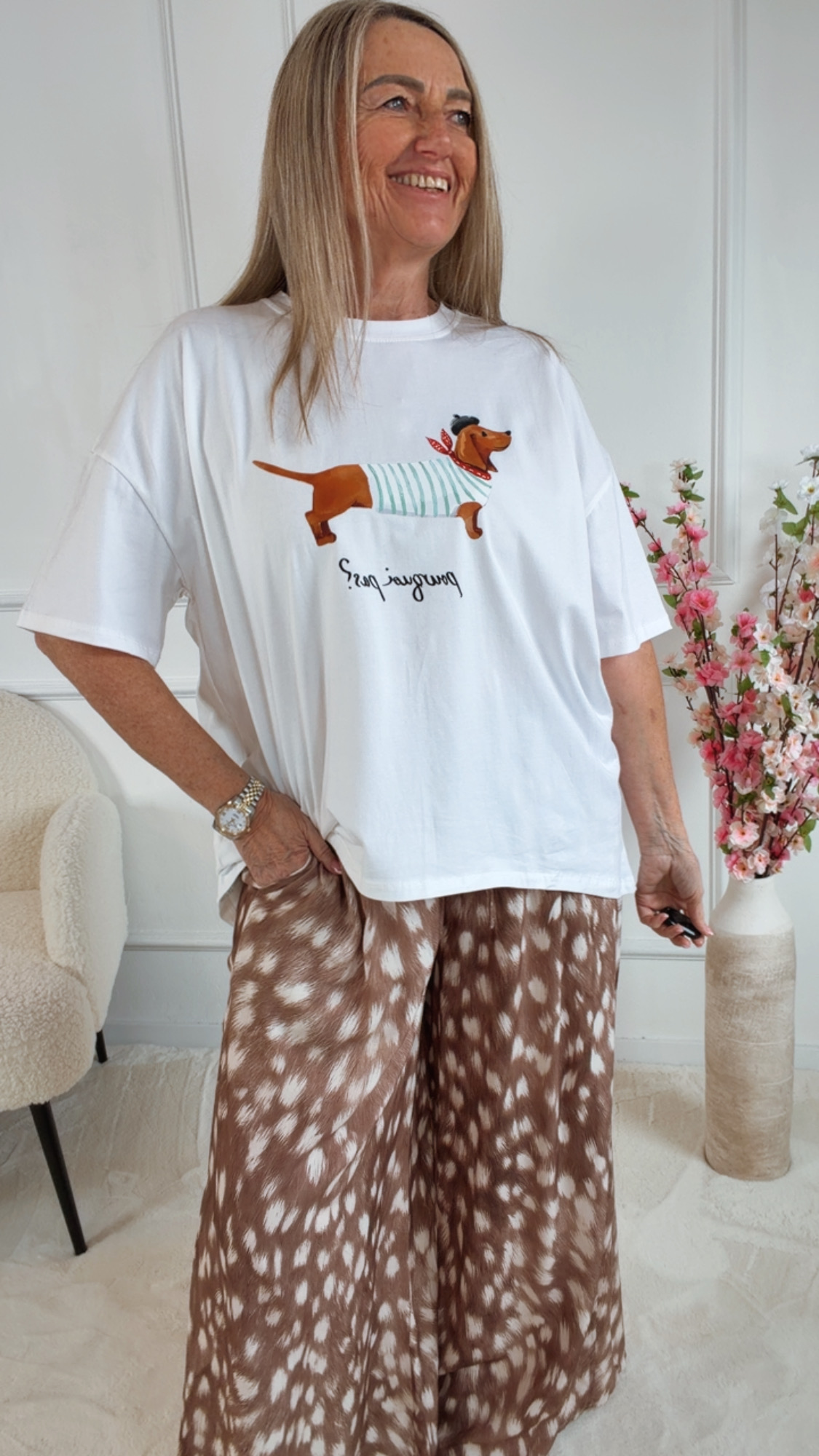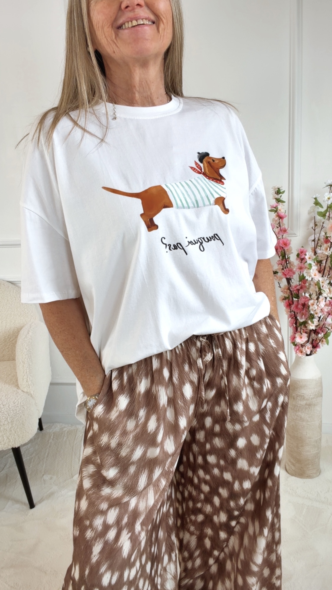 Hochwertiger Dackelprint mit „POURQUOI PAS?“-Schriftzug