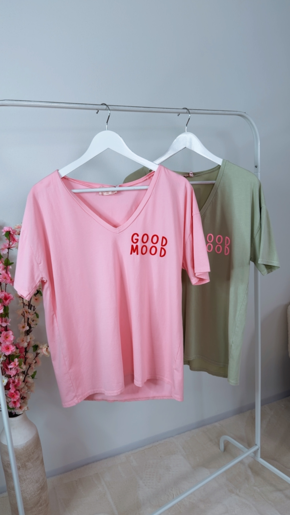 Der kleine „Good Mood“-Druck auf der Vorderseite setzt ein süßes Statement und bringt sofort gute Laune in deinen Alltag 😊🌸