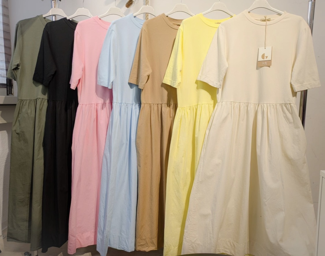 Der obere Teil im T-Shirt-Stil sorgt für einen entspannten Look, während der leicht geraffte Rock dem Kleid eine verspielte, feminine Note verleiht. 🌿✨