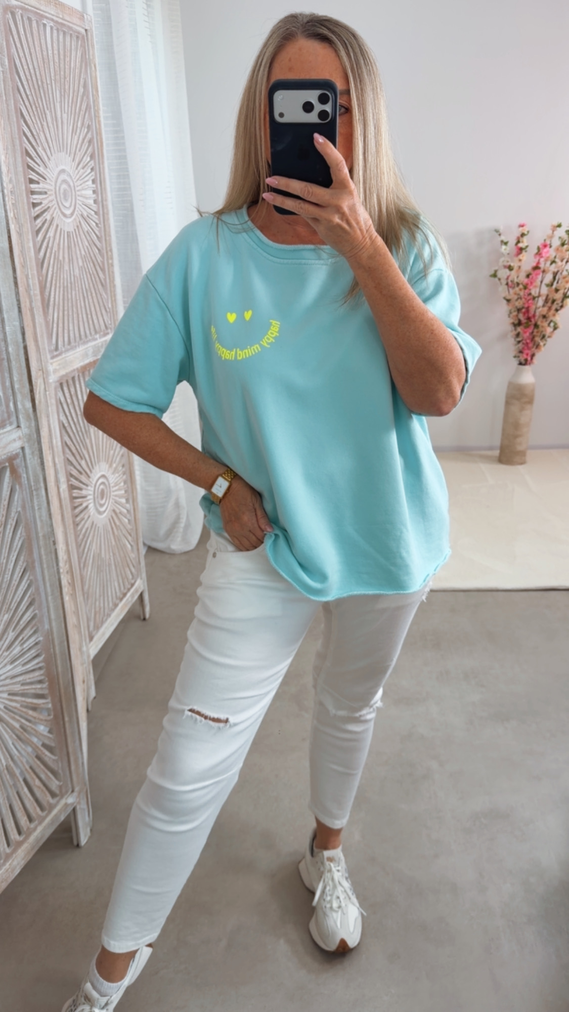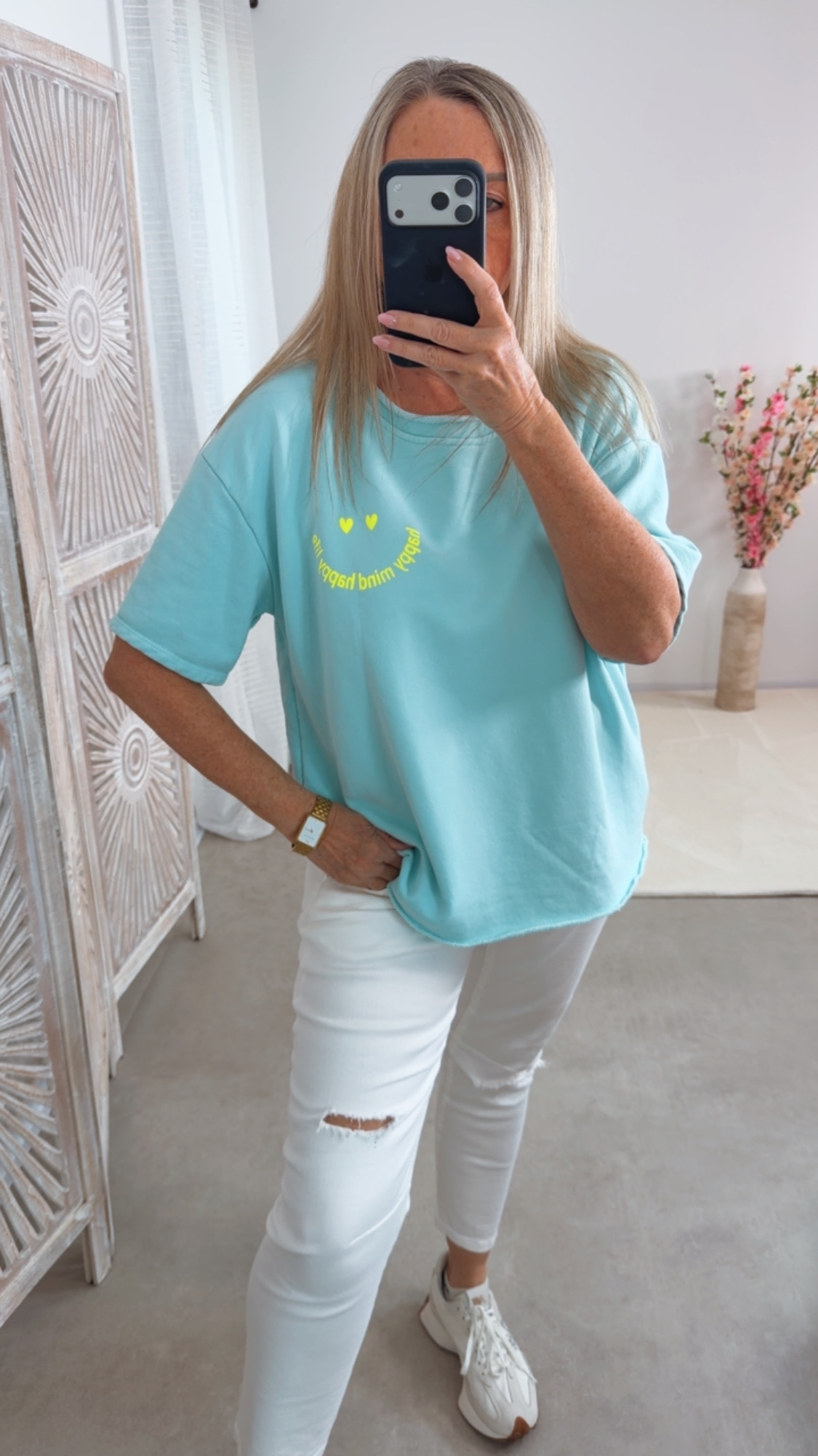 Der stylische T-Shirt-Sweater „Elovira“ begeistert mit seinem modernen Look und dem inspirierenden Schriftzug „Happy Mind, Happy Life“ 💛✨