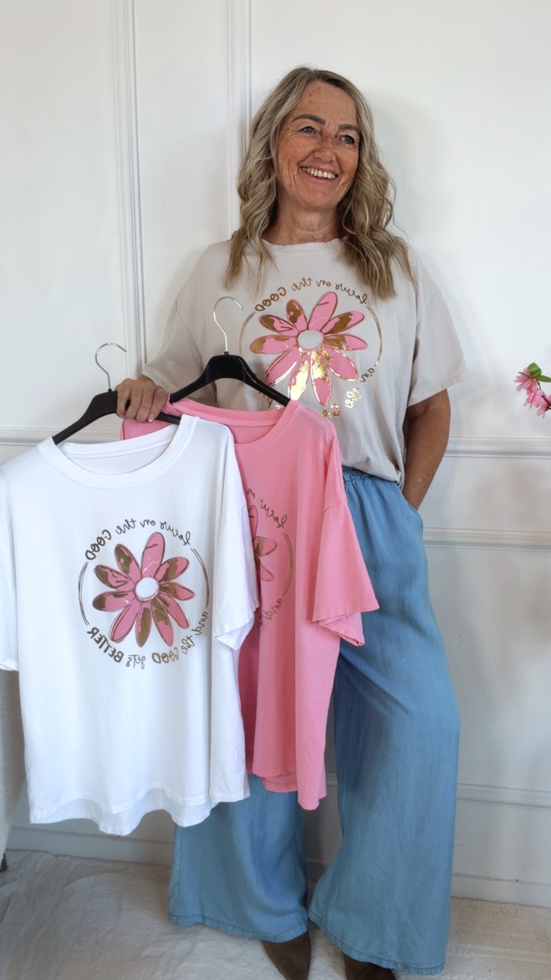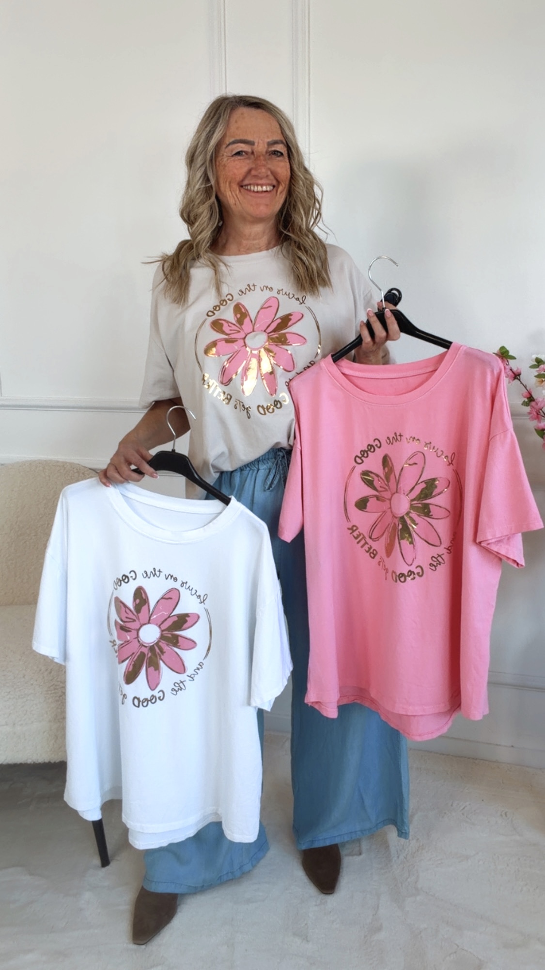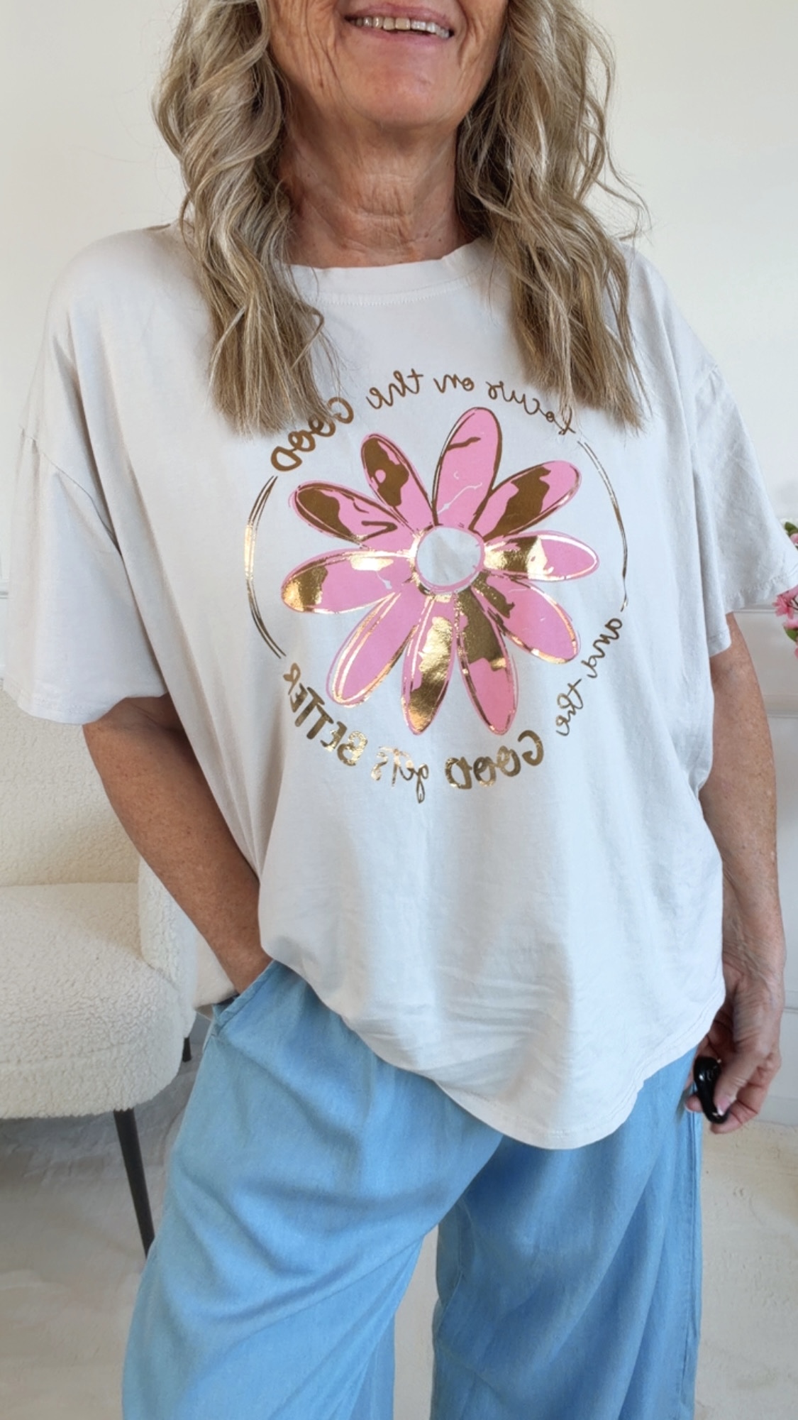 Das bezaubernde T-Shirt „Velanora“ überzeugt mit seinem liebevollen Blumen-Print und dem inspirierenden Schriftzug – perfekt für alle, die Mode mit positiver Ausstrahlung lieben! 🌼💫
