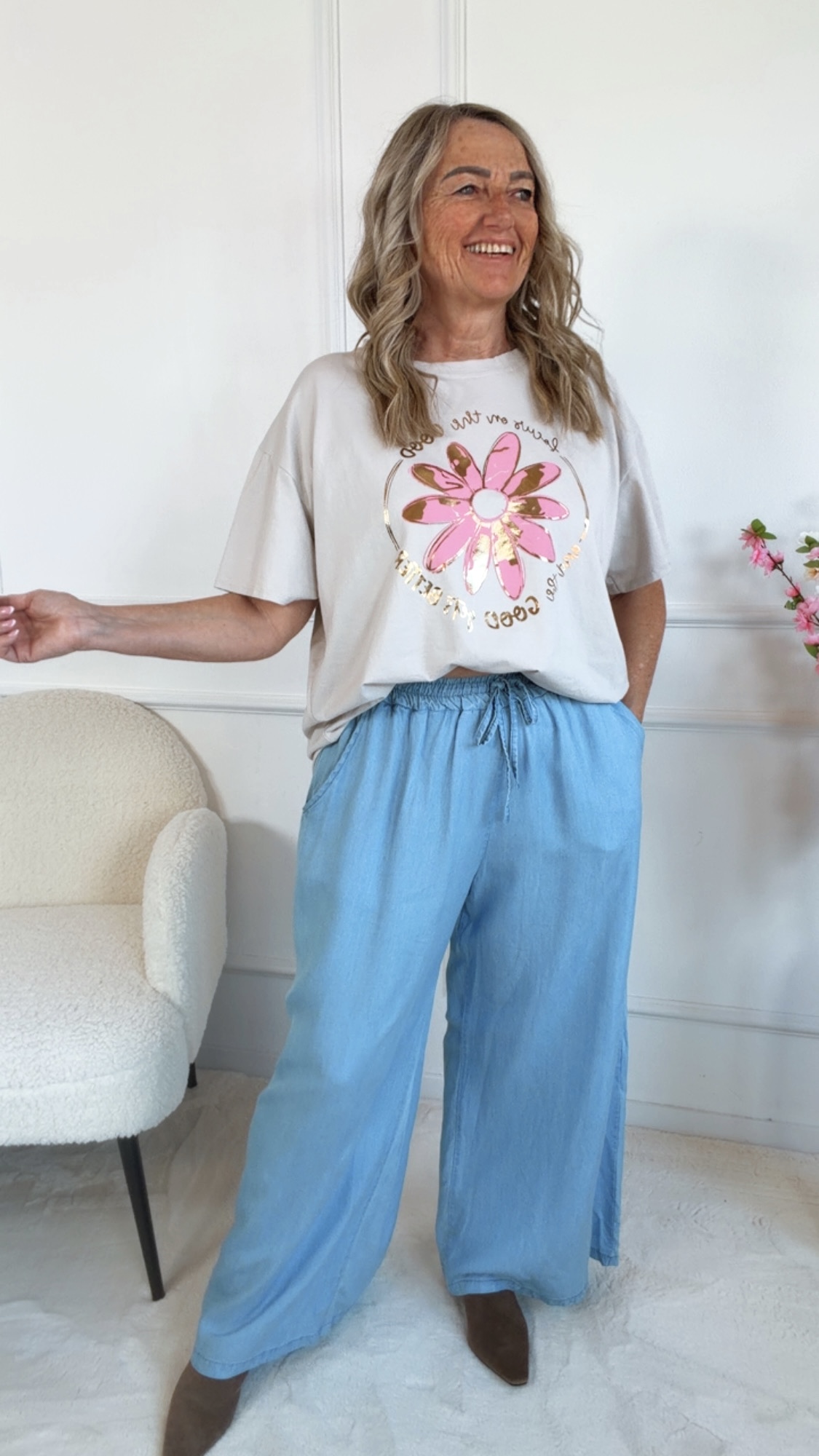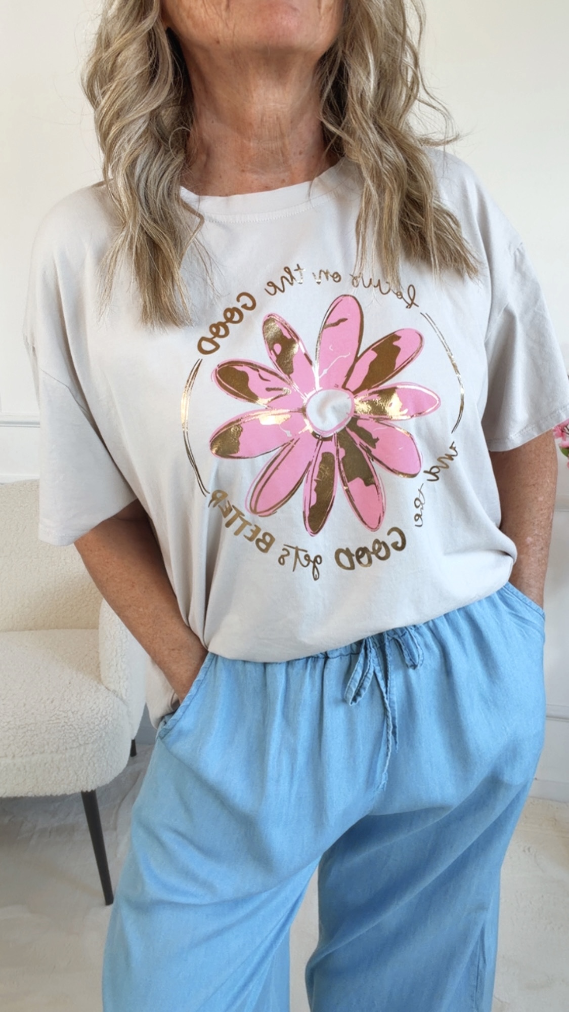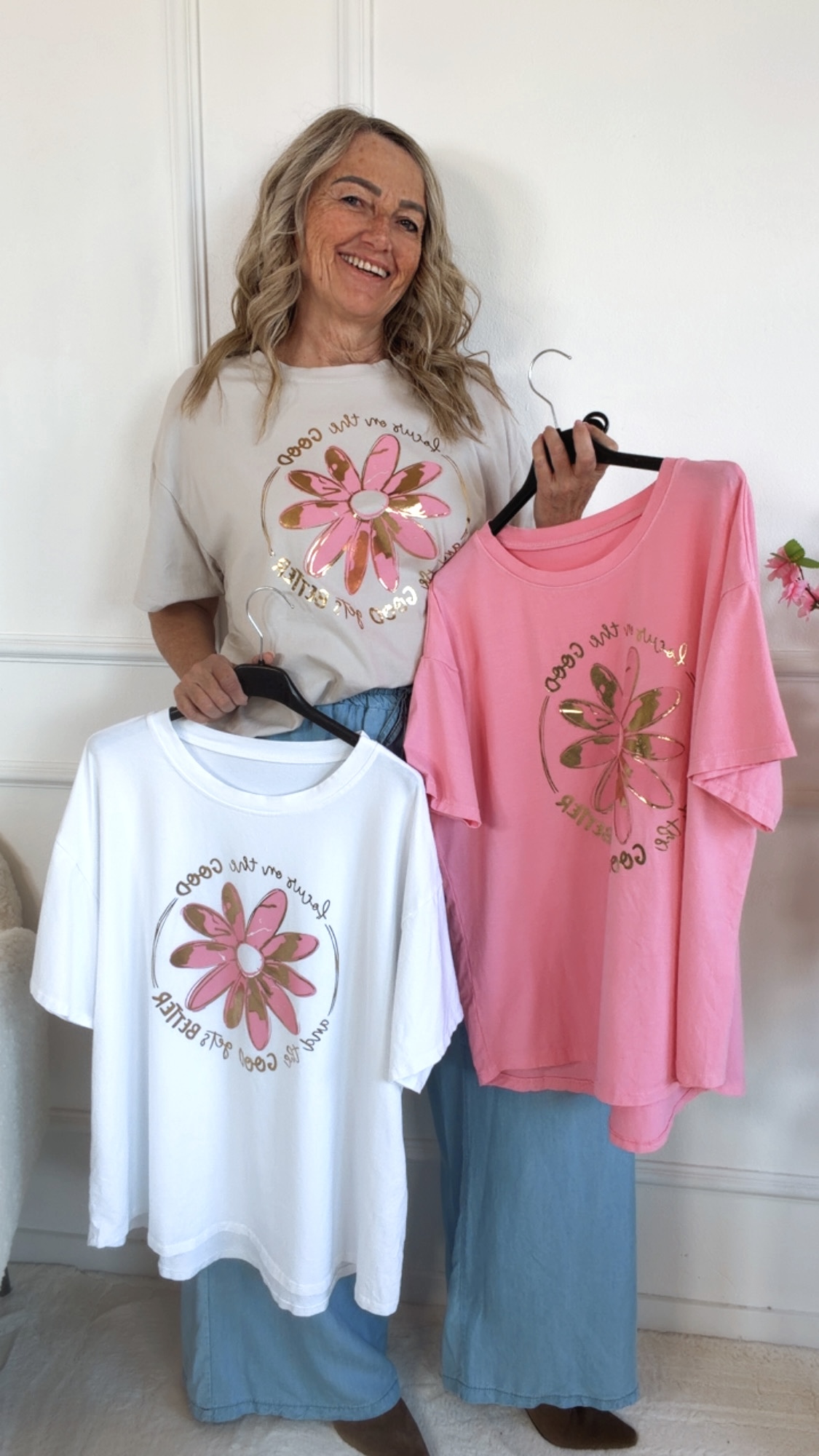 Das bezaubernde T-Shirt „Velanora“ überzeugt mit seinem liebevollen Blumen-Print und dem inspirierenden Schriftzug – perfekt für alle, die Mode mit positiver Ausstrahlung lieben! 🌼💫