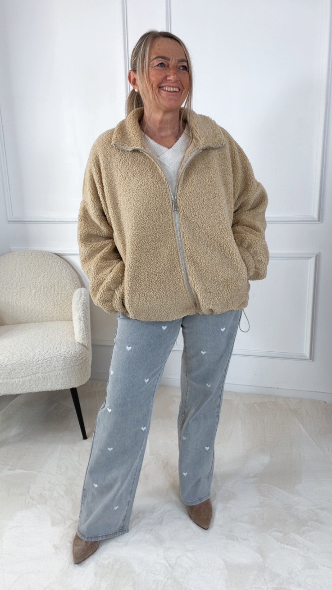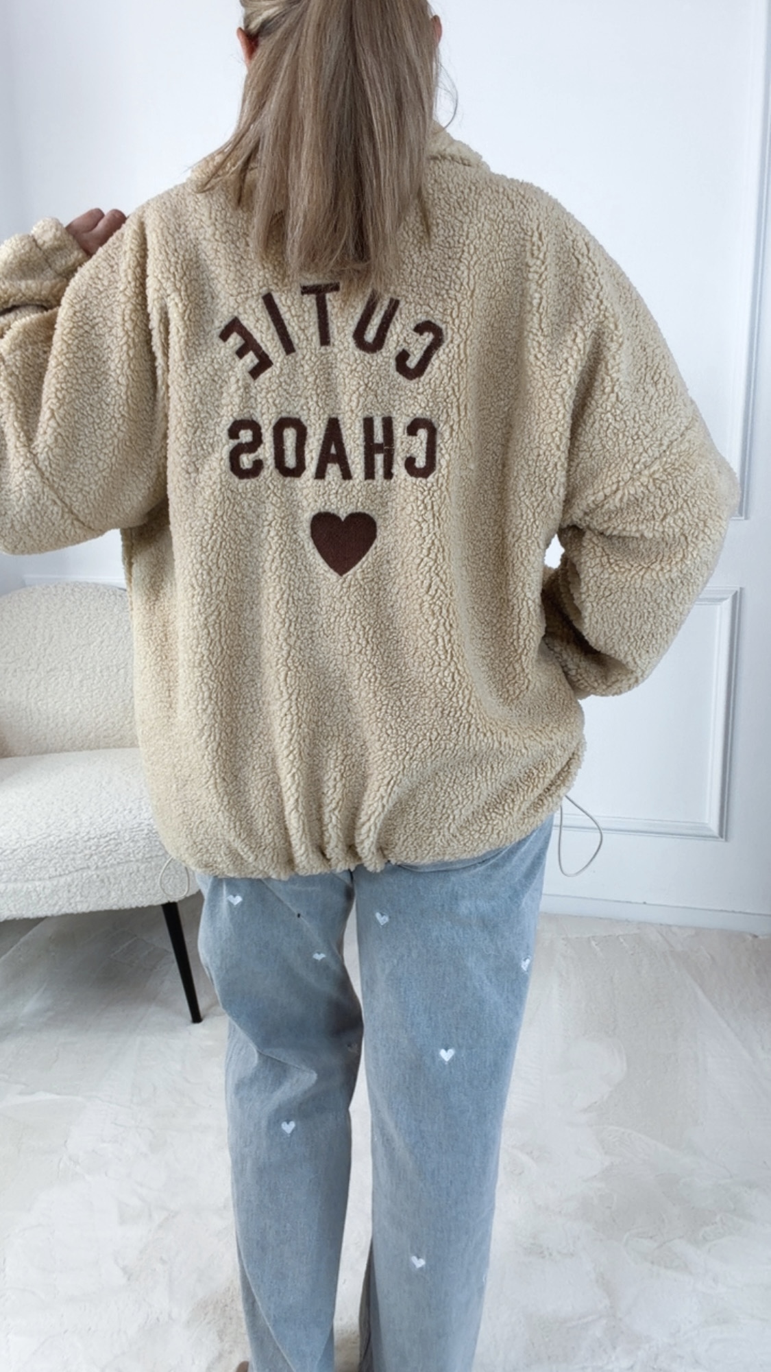 Diese Teddyjacke ist der perfekte Mix aus cozy Komfort und auffälligem Design. Das kuschelig weiche Material sorgt für ein angenehmes Tragegefühl, während der Gummizug am unteren Saum eine schöne Passform und einen lässigen Sitz garantiert. Der durchgehende Reißverschluss macht die Jacke besonders praktisch und vielseitig kombinierbar. Zwei Seitentaschen bieten Platz für kleine Essentials. Highlight ist der markante Rückenaufdruck „CUTIE CHAOS“, der dem Look eine selbstbewusste, trendige Note verleiht und die Jacke zu einem echten Statement-Piece macht.