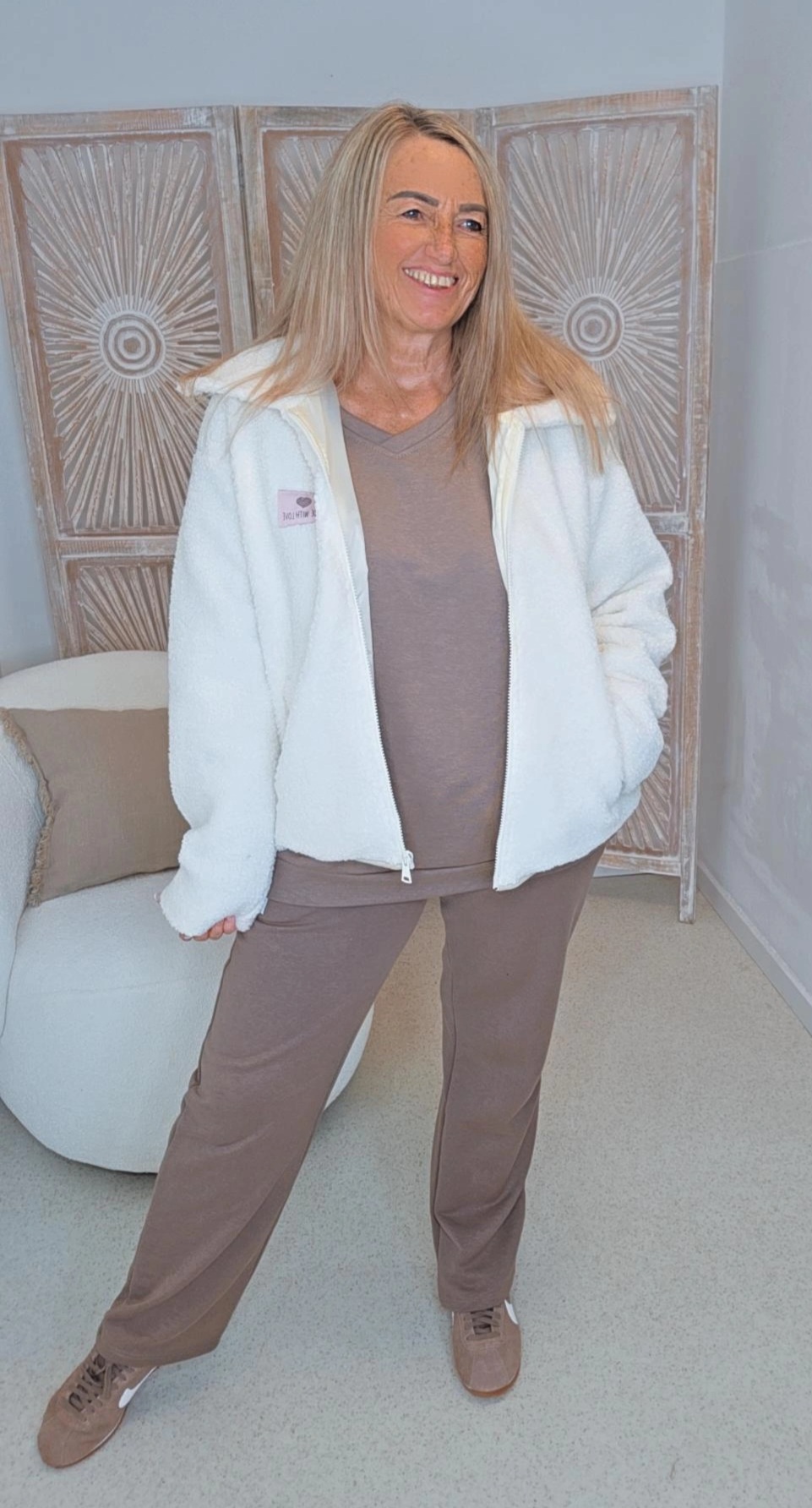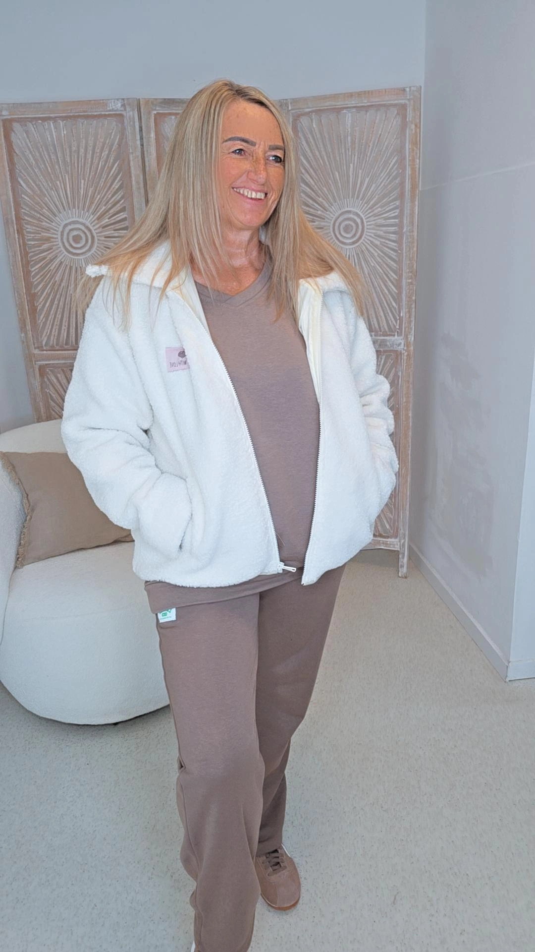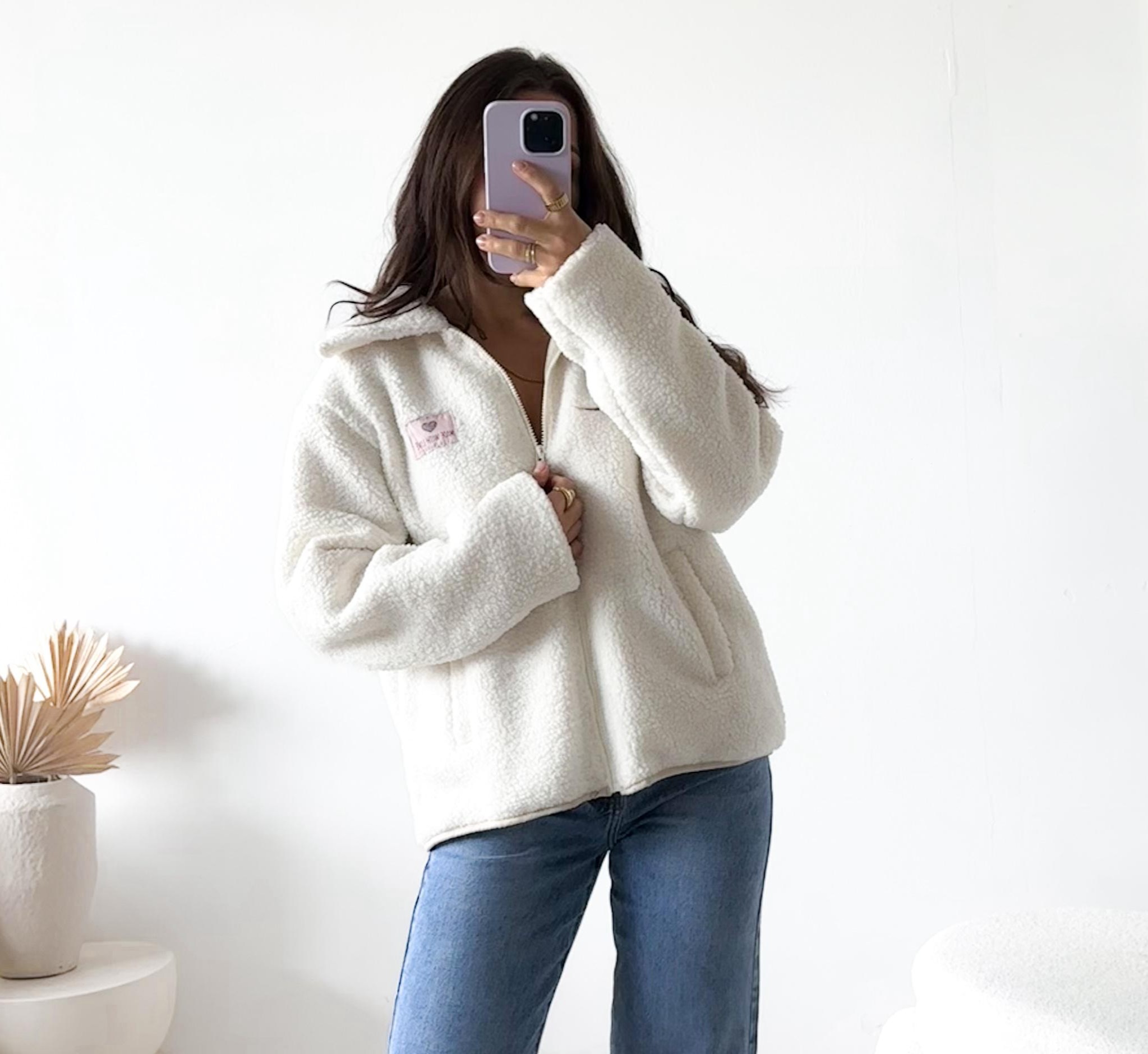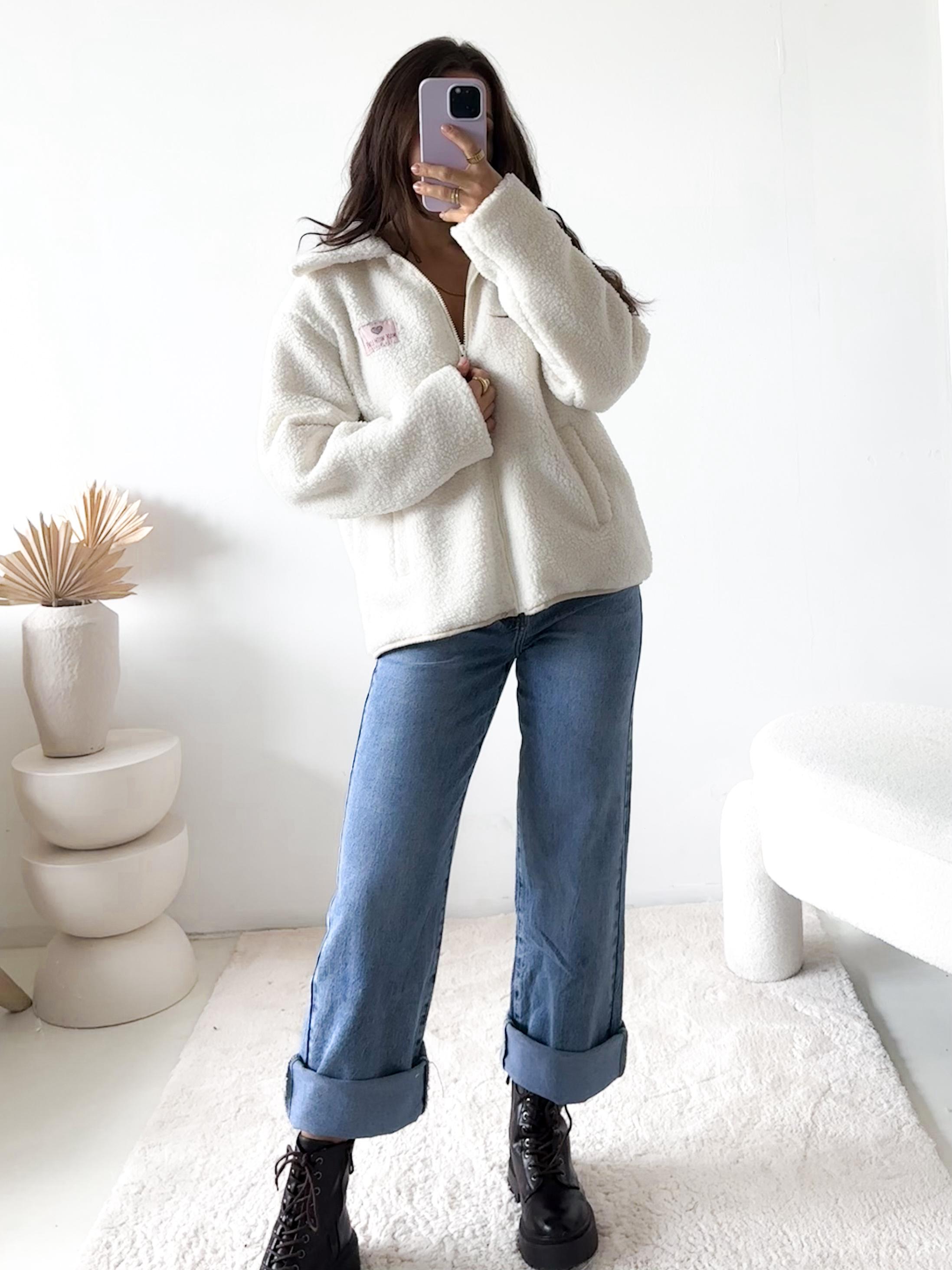 Diese kuschelige Teddyjacke vereint Style und Komfort auf perfekte Weise. Das weiche, flauschige Material sorgt für ein angenehmes Tragegefühl und hält dich auch an kühlen Tagen warm. Der klassische Kragen und der durchgehende Reißverschluss verleihen der Jacke einen modernen, sportlich-eleganten Look.