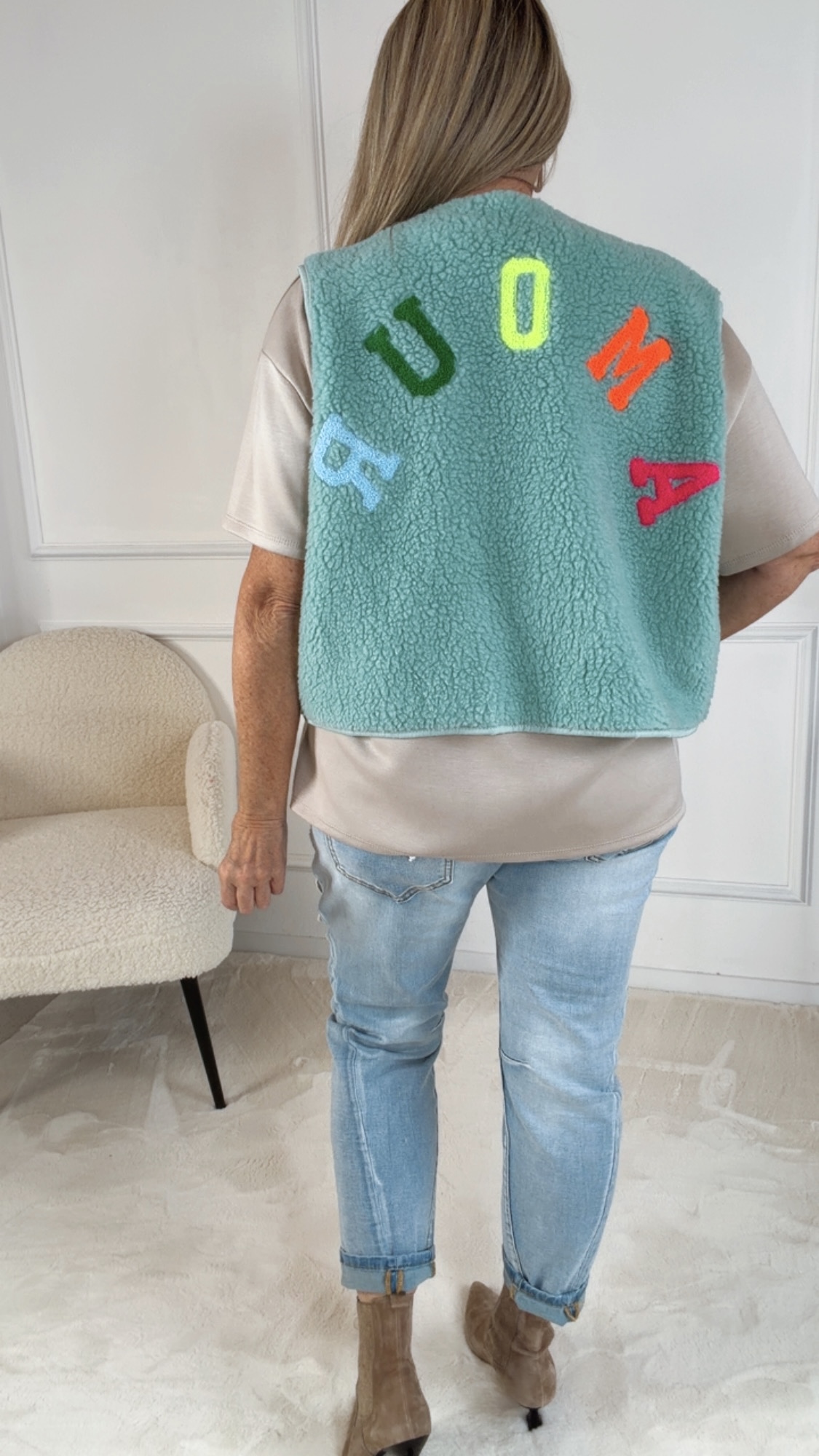 Besonderes Highlight ist der große „Amour“-Rückenaufdruck, der der Weste einen individuellen und modernen Charakter verleiht. Die lockere Passform ermöglicht vielseitige Styling-Optionen – ob über einem Longsleeve, Pullover oder einer Bluse getragen.