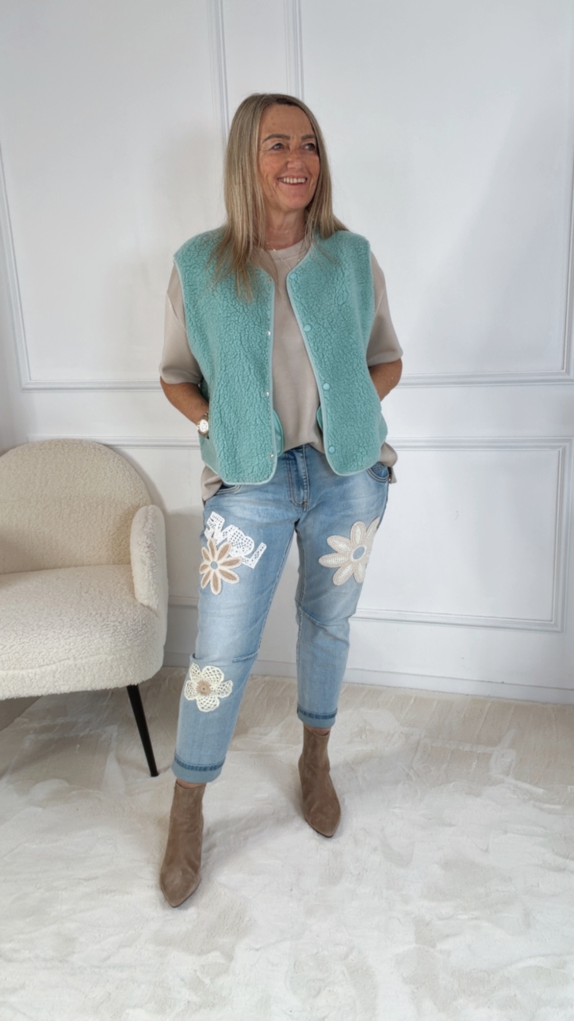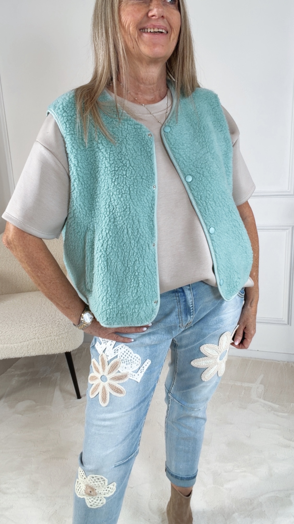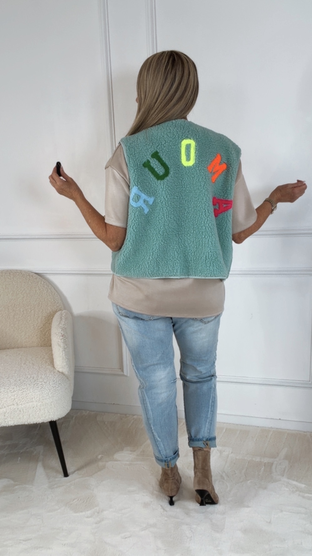 Ideal für die Übergangszeit oder als zusätzliches Layering-Piece an kühleren Tagen, überzeugt die Teddyweste durch Komfort und Stil gleichermaßen.