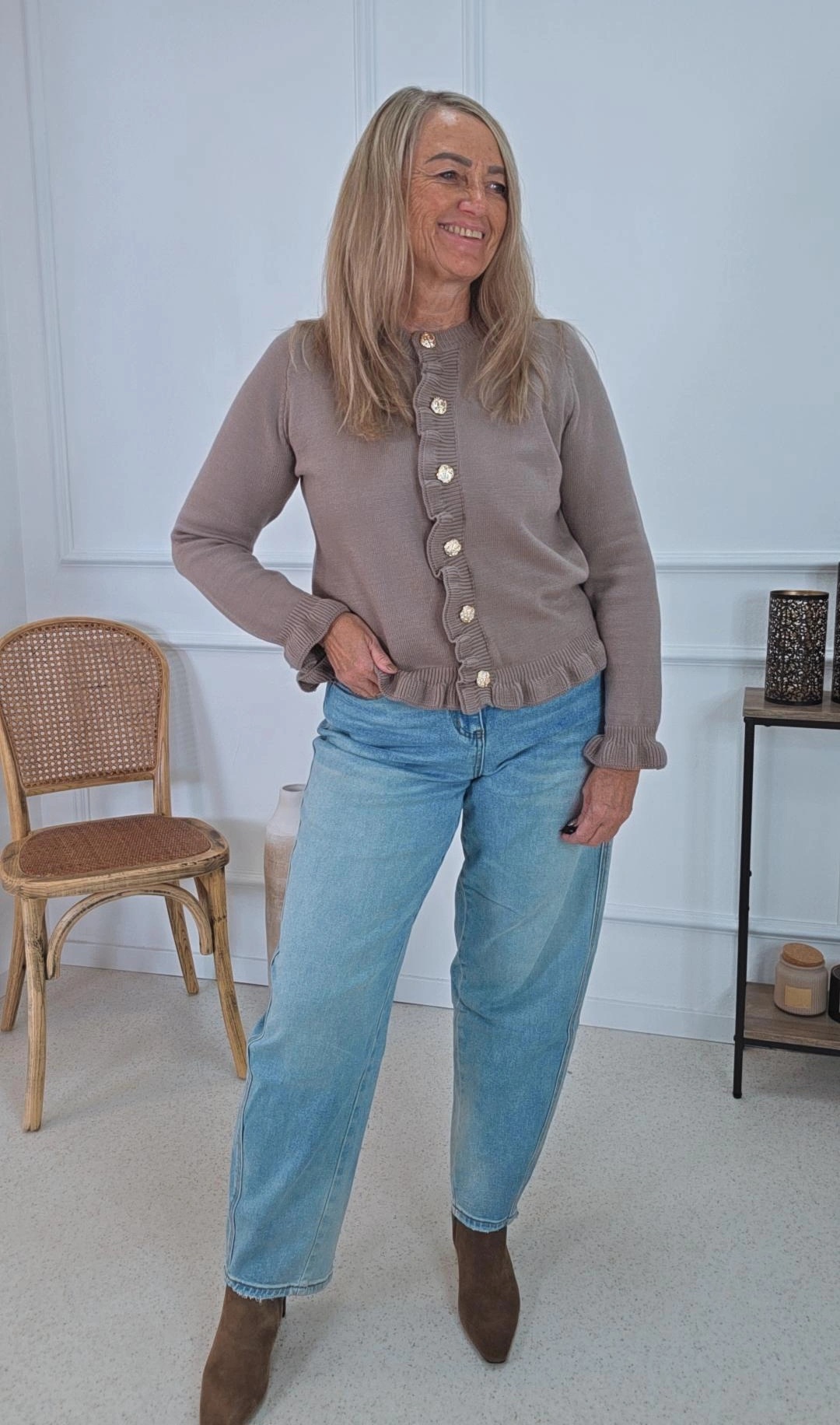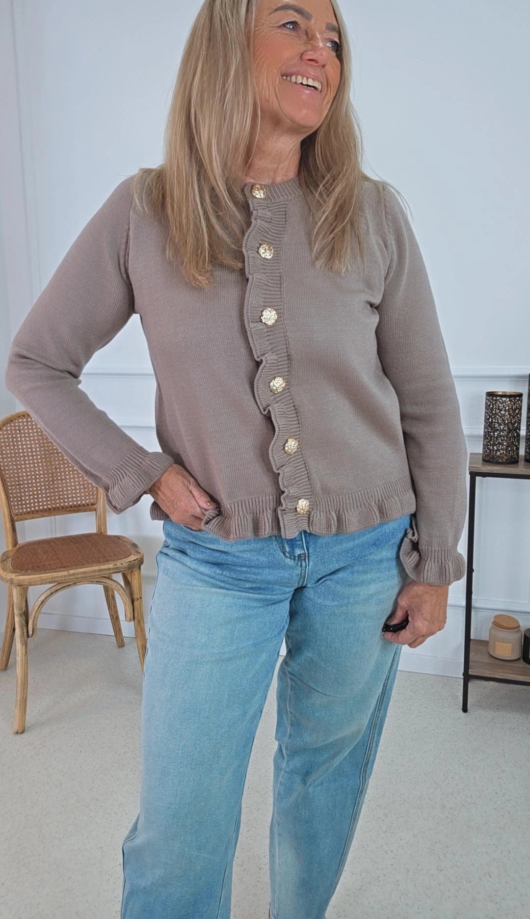 ✨ Kurzstrick-Cardigan mit Volants & goldfarbenen Knöpfen