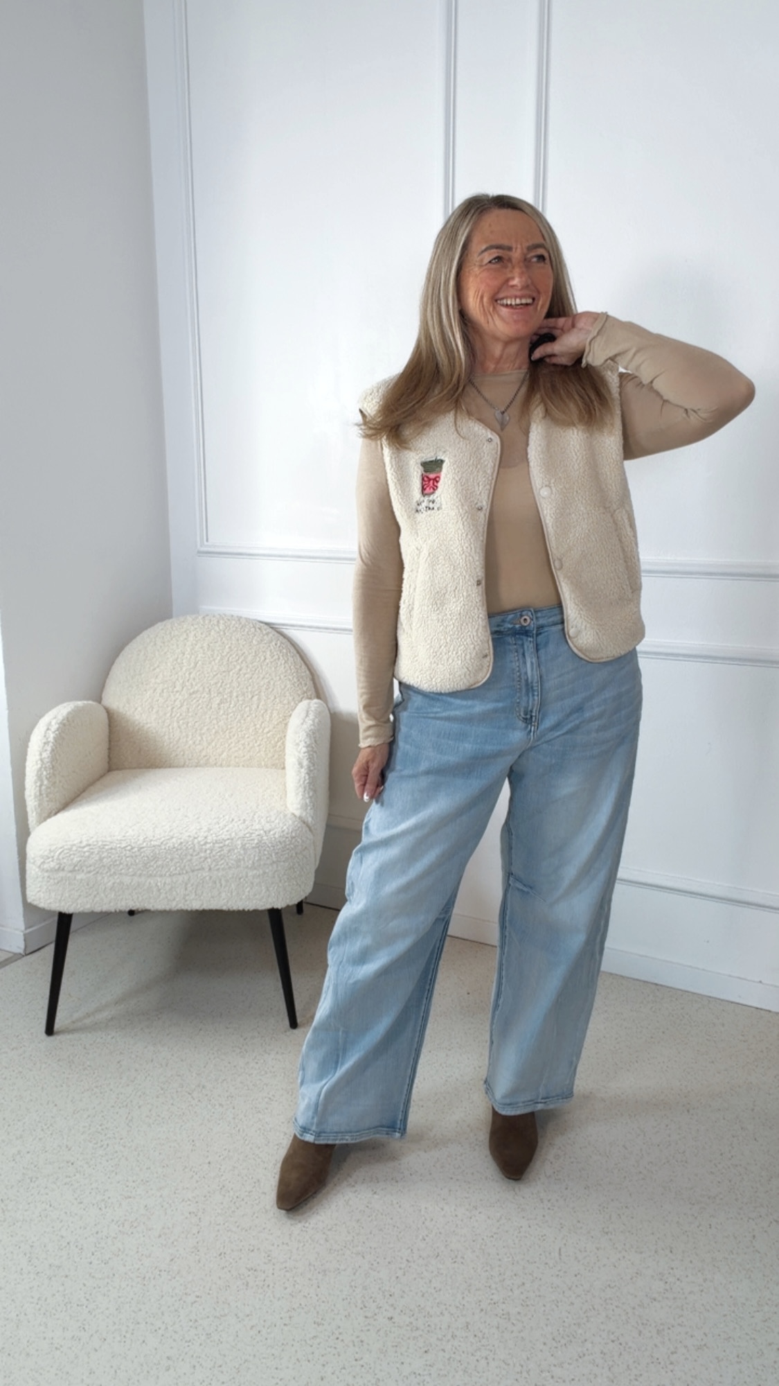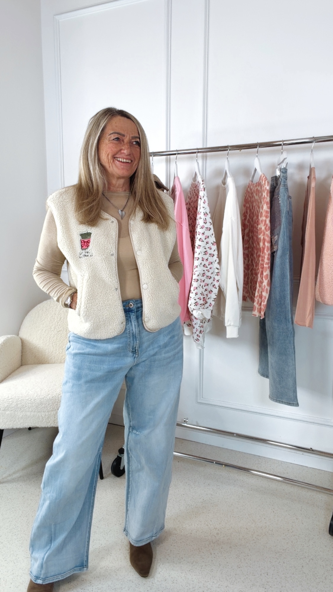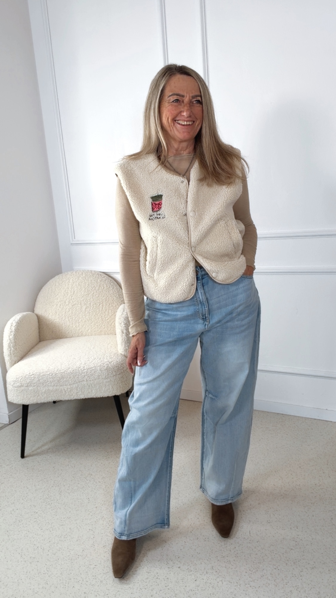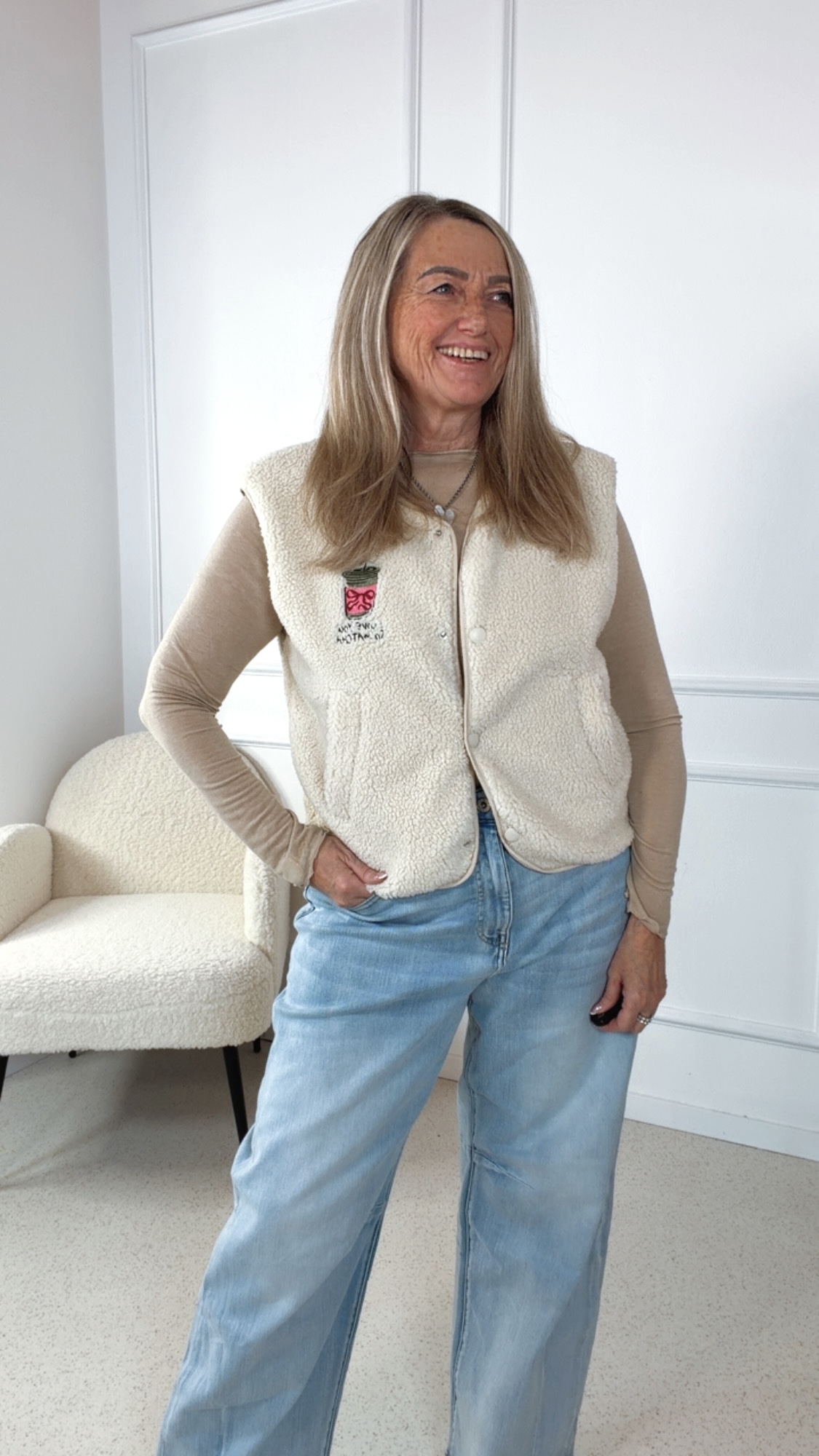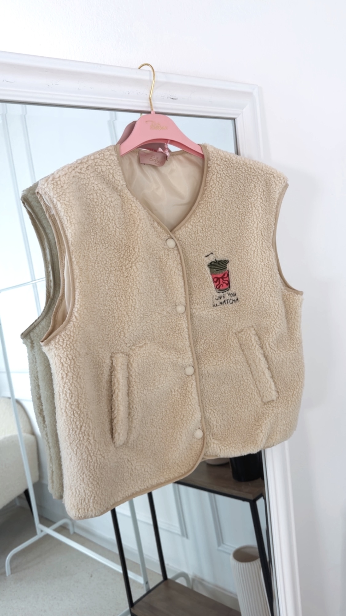 Diese Teddyweste ist der perfekte Mix aus cozy Komfort und angesagtem Style. Das weiche, flauschige Material hält warm, während die praktischen Druckknöpfe für ein unkompliziertes An- und Ausziehen sorgen. Zwei Seitentaschen bieten Platz für kleine Essentials, und der auffällige Stickaufdruck „I love you so Matcha“ setzt einen verspielten, modernen Akzent. Ein Must-Have für lässige, trendige Looks mit Wohlfühlfaktor.